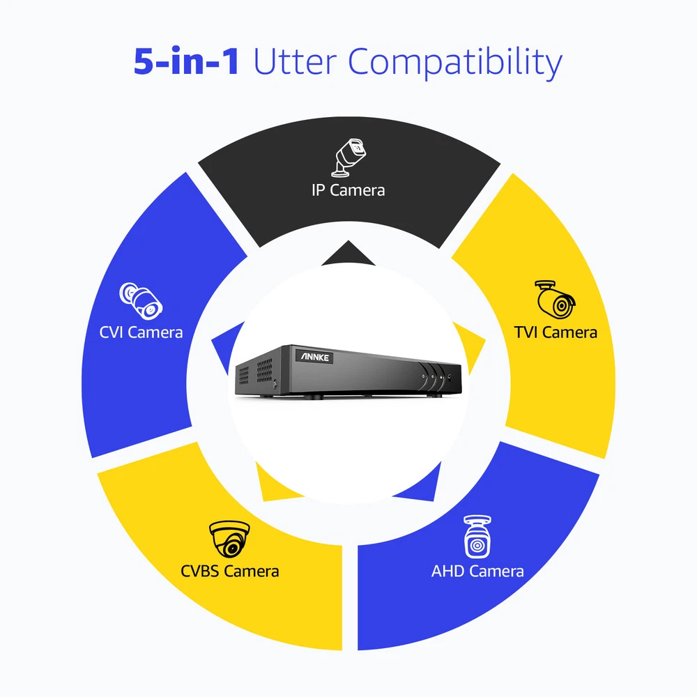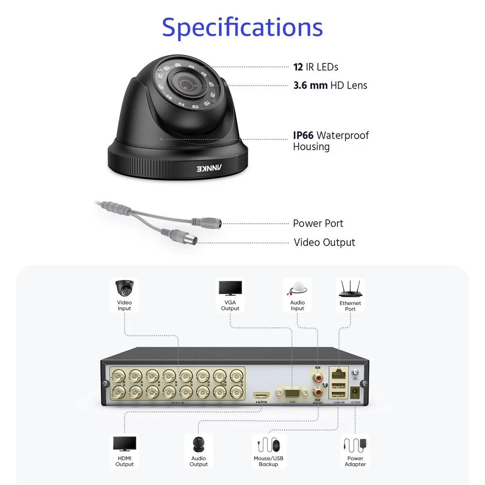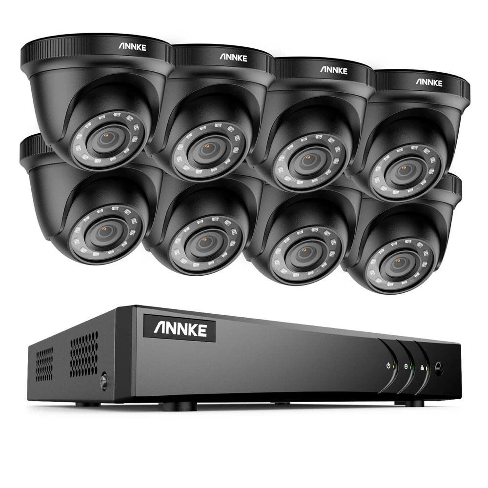 ANNKE Home Surveillance 1080P TVI Camera System 5MP TVI Camera System 4K TVI Camera System 5MP POE Camera System 4K POE Camera System 12MP POE Security Camera Kits Wireless IP Camera System SANNCE Home Surveillance 1080P TVI Camera System 1080P ColorVu Camera System 5MP TVI Security Camera System 3MP POE Camera System 5MP POE Camera System 8MP POE Camera System Wireless Camera System CCTV Camera DVR/NVR CCTV Accessories POE IP Security Cameras ebay2023 ANNKE E200 ANNKE 1080P Full HD CCTV Security Camera System Promise Clear Video, See More Details 1080P Guards You Day & Night Different from 720P vague image quality, this 1080P high definition camera provides crisp video footage, and captures things you care about at the resolution of 1920*1080. Your sense of security can be maximized with this non-stop digital guard. Human/Vehicle Detection & Real-time Email Alerts This DVR detects the movements of key objects like human&vehicle, which reduces up to 99% false alarms caused by leaves, lights, rain, etc. Meanwhile, you can get email alerts in real time once find there is someone loitering around your home. EXIR 2.0 Night Vision Tech & Smart IR The advanced EXIR 2.0 tech and smart IR can deliver up to 100ft long-range brighter & clearer images even in 0.01 Lux darkness, and there is no overexposed or underexposed image issue when recording videos, helping you record all night-time activities. IP66 & High-Quality ABS Housing With IP66 rating and the best ABS exterior housing, these wired cameras can stand different weather from stormy to tropical, from -40°C/-40°F to 60°C/140°F. Every detail is designed for a longer lifespan. Customized Motion Areas & Privacy Mask You can always customize motion detection with specific motion zones, like doorsteps, garages. You will receive instant alerts only when motion events happen in the customized areas. To protect your privacy, you may set up the privacy mask. The system will ignore the masked zones when recording videos. Multiple Recording Options & Smart Playback There are various recording options so you can customize it, be it 24/7 video recording, scheduled recording or motion detection recording, they're decided by your free choice. Also, smart search and playback can help you find what you want in loads of videos in a sec. Exclusive/Advanced H.265+ Video Format Compared with H.264, this DVR adapts H.265+ video compression which supports less bandwidth consumption, besides, it can offer smooth and fast videos without latency, achieving ultra-long video recording. Multiple Protection of Your Security There are many kinds of protection mechanisms to protect your safety like password activated devices, separate APP accounts, remote encryption and work even without internet. These ensure your privacy is no longer a crisis but secured in video stream transferring & downloading. Enhanced Visual Quality Equipped with digital DNR and WDR, this camera captures finer details regardless of lighting conditions, promising you all clear frames. Support 1080P HDMI/VGA Output This DVR supports HDMI/VGA outputs with up to 1080P clarity, assuring you have a good vision experience and never miss any details. Multiple Terminal Remote Access & Sharing You can perform multiple terminal remote access via this DVR. Also, you can share this access privilege with your family. Powerful 5-in-1 Hybrid DVR This expandable hybrid DVR supports different resolutions of different cameras (TVI/AHD/CVI/CVBS/IP Cam) input, and it can access 16-ch analog cam and 2-ch IP cam, if you switch to IP channel, you can access 24 IP cameras at the same time. All-Around Certified Device Every DVR & camera has passed the severe testing conducted by authorizations like UL, CE, FCC, HDMI, etc. And ANNKE App has conformed to GDPR. Strong Storage Records All This DVR not only supports a maximum of 10TB HDD but also supports NAS Internet storage input. And you will not worry about the storage and achieve hassle-free storage. 16CH DVR Video & Audio Video Compression H.264+/H.264/H.265/H.265+ Video Input 16CH Analog HD/Analog + 2CH IP Video (up to 24 channel when IP enhanced mode on) Video Output HDMI and VGA Up to 1080P Audio Input 1-ch RCA, 16-ch via coaxial cable Audio Output 1-ch RCA Supported Camera Types Support HD TVI Input: 3K/5MP@20FPS, 4MP, 3MP, 1080p, 720p; Support AHD Input: 4MP, 1080p, 720P; Support CVI Input: 4MP, 1080p, 720P; Support CVBS Input; Support IP Video Input:6MP/5MP/4MP/3MP/1080P/720P Analog HD Playback Resolution 3K Lite/5MP Lite/4MP Lite@12fps,1080p/720p@15fps Protocols TCP/IP, PPPoE, DHCP, DNS, DDNS, NTP, SADP, NFS, iSCSI, UPnP™, HTTPS IPC Playback Resolution Up to 6MP Max Playback Channel 4-ch Motion Detection 2.0 All analog channels support human and vehicle detection to reduce false alarm Hard Drive HDD 1 SATA interface HDD Capacity Up to 10TB capacity External Interface Network interface 1, RJ45 10M/100M/1000M self-adaptive Ethernet interface USB USB2.0x2 General Operating Power DC12V,≤ 20W (without HDD) Dimensions(W x H x D) 260 × 222 × 45 mm (10.2 × 8.7 × 1.8 inch) Working Temperature '-14 °F – 131 °F /-10 °C – 55 °C Weight (without hard disk) ≤ 1.2 kg (2.6 lb)(without HDD) Camera Camera Image sensor 2MP CMOS Image Sensor Video Resolution 1920 (H) × 1080 (V) Signal System PAL/NTSC Min.Illumination Color:0.02 Lux @ (F1.2,AGC ON),0 Lux with IR Frame Rate PAL: 1080p@25fps NTSC: 1080p@30fps Lens 3.6mm Number of Infra-Red LEDs 12 Night Vision Distance Up to 100ft/30m Angle of View 82.2° Wide Dynamic Range Digital WDR DNR Support IR Cut Filter Yes Video Output HD BNCx1 General Housing Plastic Color Black Operating Power DC12V Operating Temperature '-40 °F – 140 °F /-40 °C – 60 °C Indoor/Outdoor Indoor/Outdoor Weatherproof Rating IP66 Dimension (L x W x H) 3.54” x 2.76” / 89.9 x 70.1 mm Weight 0.55lbs / 250g