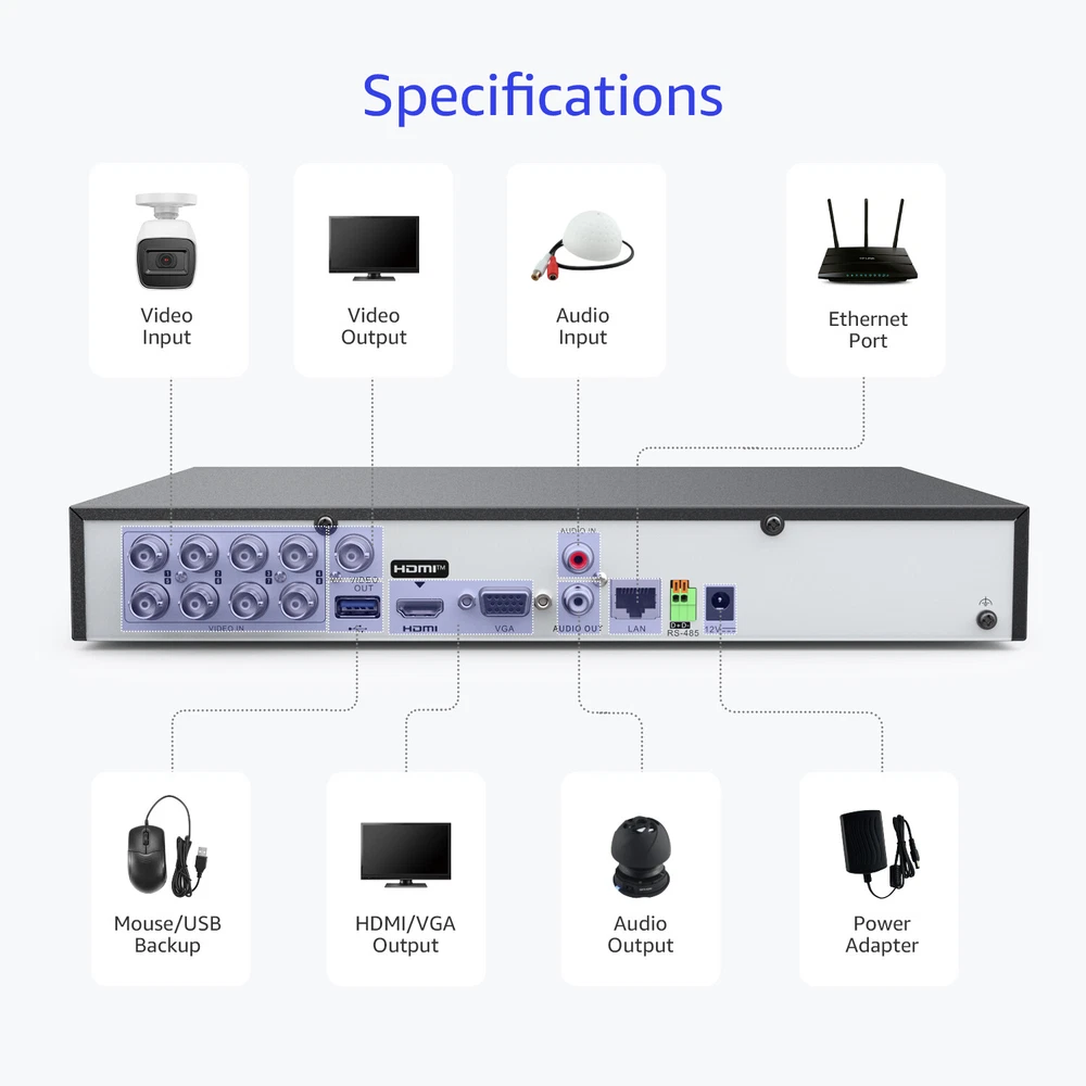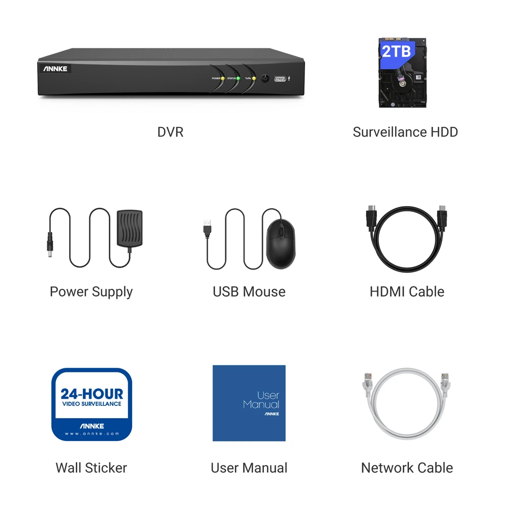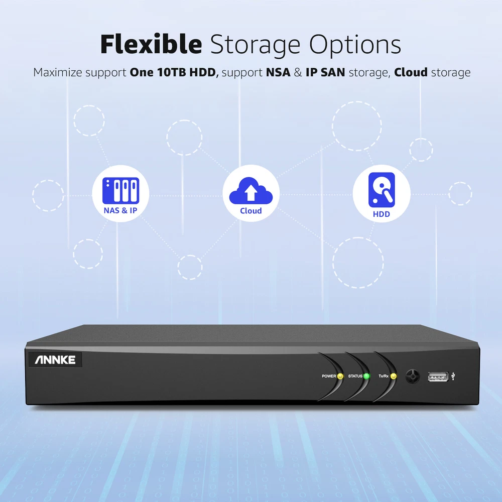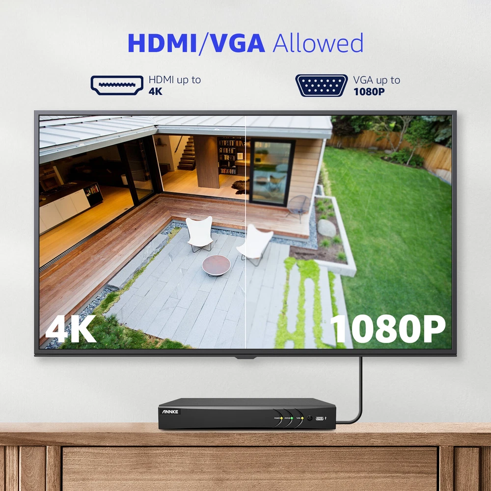 ANNKE Home Surveillance 1080P TVI Camera System 5MP TVI Camera System 4K TVI Camera System 5MP POE Camera System 4K POE Camera System 12MP POE Security Camera Kits Wireless IP Camera System SANNCE Home Surveillance 1080P TVI Camera System 1080P ColorVu Camera System 5MP TVI Security Camera System 3MP POE Camera System 5MP POE Camera System 8MP POE Camera System Wireless Camera System CCTV Camera DVR/NVR CCTV Accessories POE IP Security Cameras ebay2023 ANNKE ANNKE 4K Ultra HD 8-CH Security DVR Recorder Secure Your Home Day & Night Brilliant 4K Ultra HD With Finer Details This digital video recorder delivers the sharpest true 4K ultra HD videos with the finest details, so you can monitor your home or business in greater detail than ever before day/night. Upgraded Human & Vehicle Detection Adopting the leading-edge motion detection 2.0 algorithm, this DVR can extract and detect key objects like human&vehicle with up to 99% accuracy. Meanwhile, it also supports real-time APP notifications and email alert. Customized Detection Mode This DVR not only supports line crossing and intrusion detection, but also can set up to 4 programmable privacy areas. You can choose it freely according to your needs. Smart Search & Playback This DVR makes it easier for you to find what you want in loads of videos, you can search or playback vital clips like human/vehicle videos separately, which improves your search efficiency greatly. Powerful 5-in-1 Compatibility DVR The expandable DVR can work with all ANNKE cameras of TVI, AHD, CVI, CVBS and IP cameras, so that you can manage all cameras just in the sole device. (the DVR with default 4 IP cameras, maximizes support up to 12 IP cameras) Multiple Video Recording Options There are various recording options for your needs, like 24/7 no-stop and auto-circulate override recording, scheduled recording and motion detection recording, you can customize your video recording ways. Remote Access Access the DVR remotely with the free ANNKE Client & App or a browser via your smartphones, tablets, computers wherever. So it's a good way for you to monitor your property in ultra HD stream no matter where you are. Work With Alexa This DVR can work with Amazon Alexa, allowing voice control to access the system. You can receive live feed via 100% hands-free control even if no smartphones or laptops. Coaxial Audio is Supported Coaxial audio camera access is synchronized with the same cable to transmit video signals and audio signals, no need for additional audio cables. Advanced H.265+ Video Format H.265+ saves up to 75% storage spaces compared with H.264 coding, which not only records ultra-long videos but spreads it faster. Support HDMI/VGA Output This DVR supports HDMI outputs with up to 4K ultra HD videos, VGA transmits up to 1080p clarity, assuring you have a beautiful vision experience. Various Storage Options for Your Needs There are kinds of storage ways for you to choose from, the DVR not only supports one up to one 10TB HDD and cloud storage, but also supports NAS and IP SAN storage, so you can achieve storage hassle-free easily and no need to worry about storage anymore. 8CH DVR Video & Audio Video Compression H.265 Pro+/H.265 Pro/H.265/H.264+/H.264 Video Input 8CH Analog HD/Analog + 4CH (up to 12-ch) IP (Enhanced IP mode on:8-ch (up to 16-ch), each up to 4 Mbps) Video Output VGA up to 1080p/60 Hz; HDMI up to 4K (3840 × 2160)/30 Hz Audio Input 1-ch, RCA (2.0 Vp-p, 1 KΩ)/8-ch via coaxial cable Video bitrate 32 Kbps to 10 Mbps Audio Output 1-ch, RCA (2.0 Vp-p, 1 KΩ) Smart event Line crossing & Intrusion Detection IPC Playback Resolution Up to 8MP IPC Recording Resolution Up to 8MP IP Camera Input 4-ch (up to 12-ch) Max Playback Channel 8CH ON-VIF Suppot Motion Detection 2.0 Deep learning-based motion detection 2.0 is enabled by default for all analog channels, it can classify human and vehicle, and extremely reduce false alarms caused by objects like leaves and lights. Analog HD Playback Resolution 4K@8 fps/5MP@12 fps/4MP@15 fps/3MP@18 fps 1080p/720p/WD1/4CIF/VGA/CIF@25 fps (P)/30 fps (N) Supported Analog Camera Types Support HD TVI Input: 8 MP@15 fps, 5 MP@20 fps, 3K@20 fps, 4 MP@30 fps, 4 MP@25 fps, 3 MP@18 fps, 1080p@30 fps, 1080p@25 fps, 720p@60 fps, 720p@50 fps, 720p@30 fps, 720p@25 fps Support AHD Input: 5 MP@20 fps, 4 MP@30 fps, 1080p@25 fps, 1080p@30 fps, 720p@25 fps, 720p@30 fps; Support HD CVI Input: 4 MP@30 fps, 4 MP@25 fps, 1080p@25 fps, 1080p@30 fps, 720p@25 fps, 720p@30 fps; Support CVBS Input:PAL/NTSC Hard Drive HDD 1 SATA Interface HDD Capacity Up to 10 TB Capacity(Not Include) External Interface USB USB 2.0 X1 + USB 3.0 X 1 Network Interface RJ45 X1(10/100 M/1000 M self-adaptive Ethernet interface) RS485 Support General Working Temperature '14 °F — 131 °F/-10 °C — 55 °C Dimensions (W X H X D) 315 × 242 × 45 mm (12.4 × 9.5 × 1.8 inch) Weight (Without Hard Disk) ≤ 2 kg (4.4 lbs.) (Without HDD)