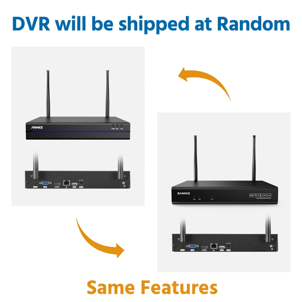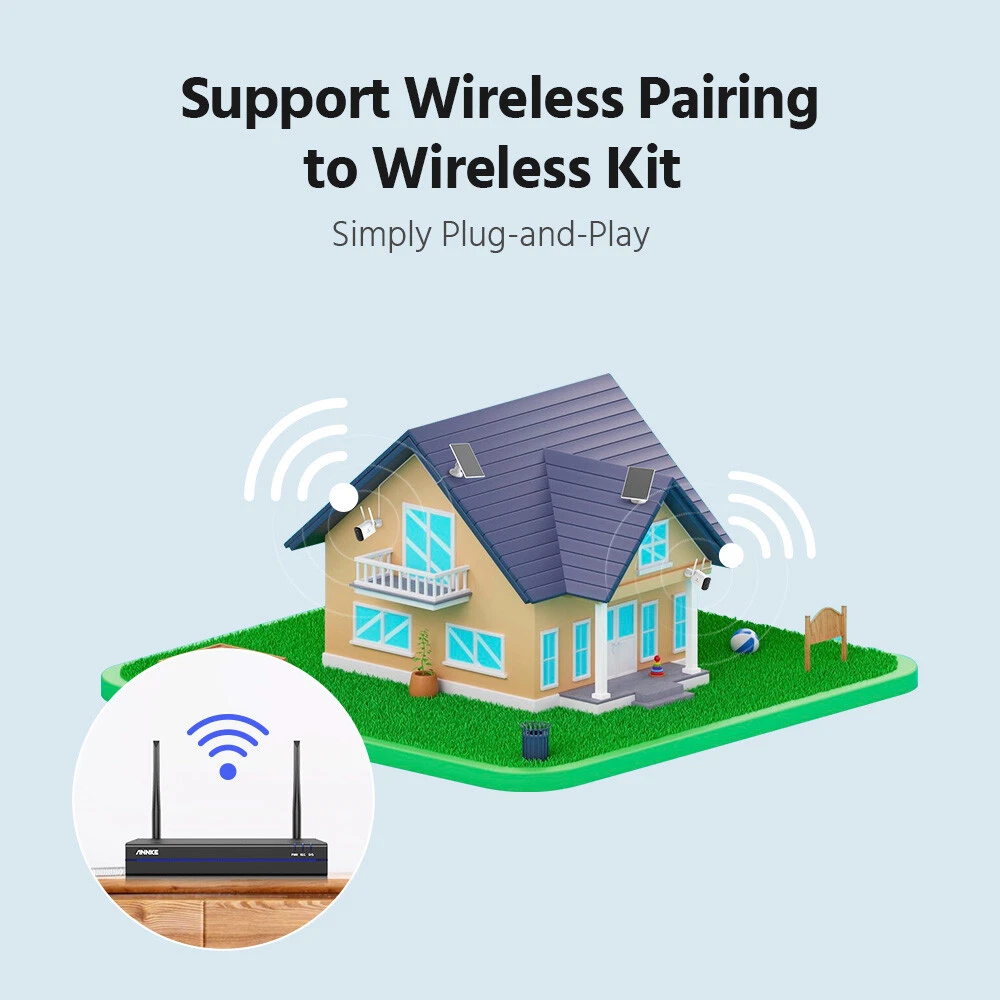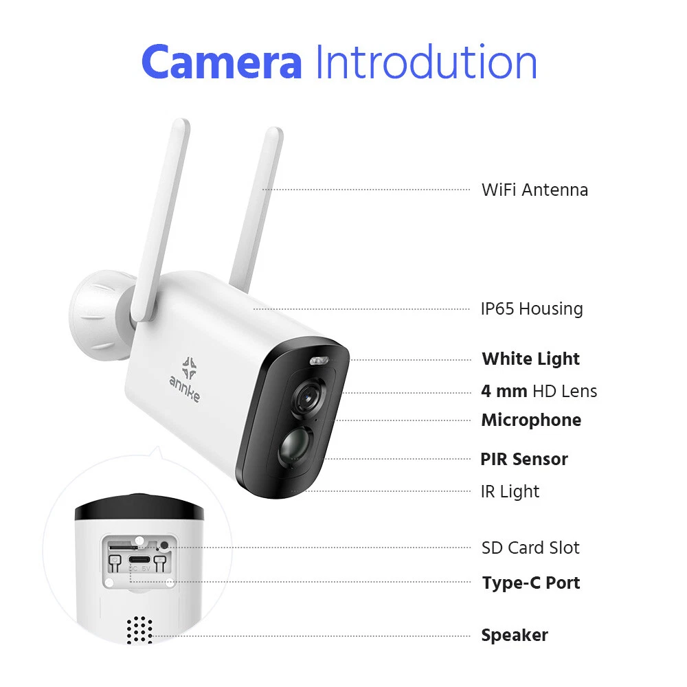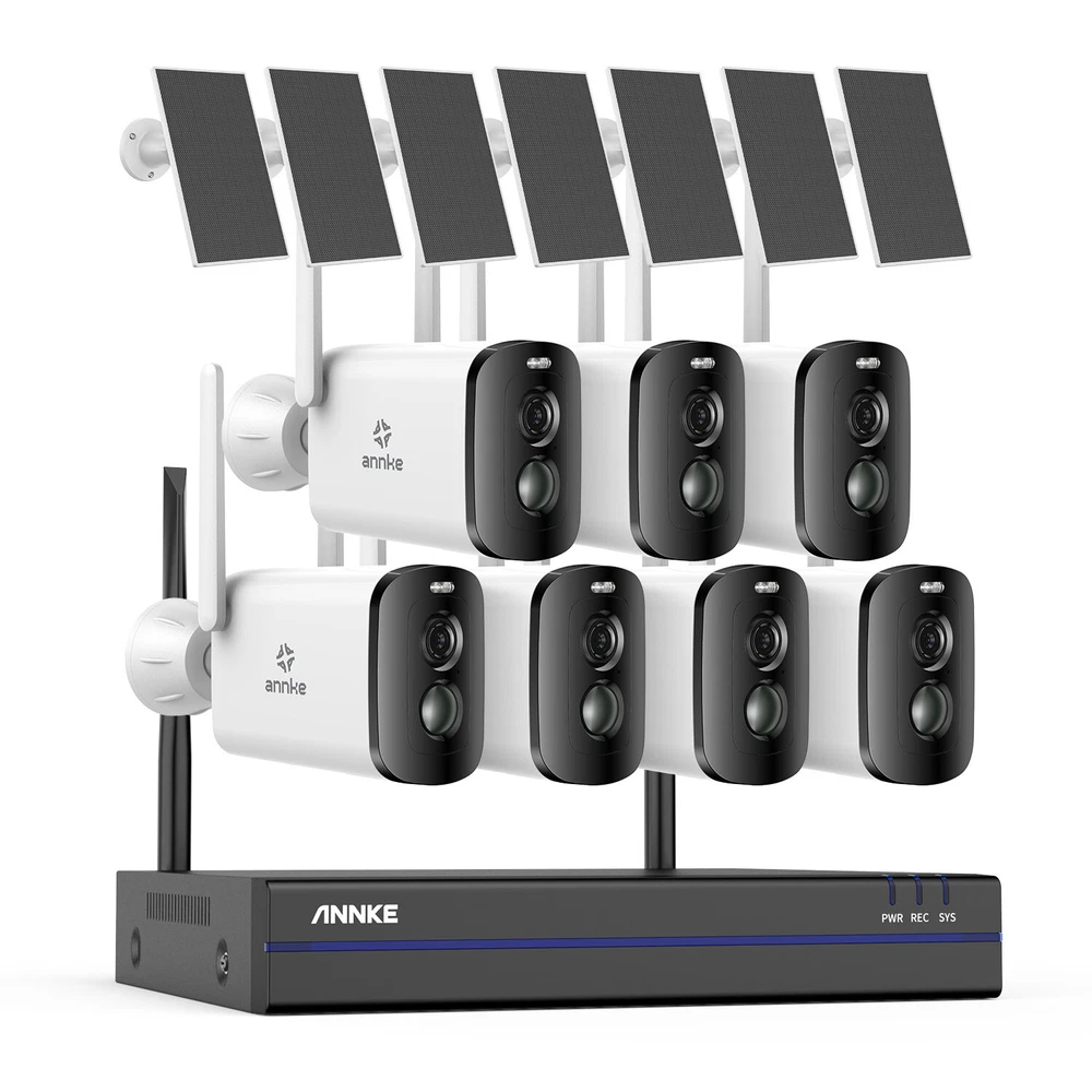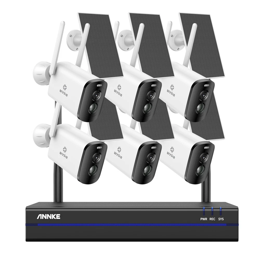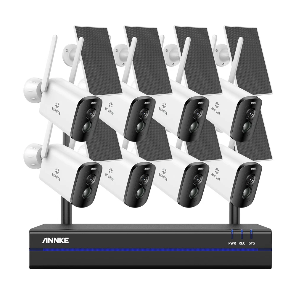 【 Please Note 】 This NVR Will be shipped at random from Oct,8th,2024, thanks. ebay2023 ANNKE WBS400 4MP 10-CH 100% Wire-Free Security Camera System Easy to Install, No Cables Hassle See Clearly Even in the Night 4MP full HD brings you clear images with stunning details. The camera automatically turns into color night vision once a human is detected, and you can see clarity whether day or night. (up to 50ft IR night vision and up to 33ft full-color night vision) Scare the Intruders Away The two-way talk function of this camera allows you to communicate with the person who stands under this camera, once you find there are intruders, you can take action instantly and scare them away. Focus on What Matters This camera focuses on human detection, offers you more accurate alerts and reduces false alarms caused by insects, pets and so on. Meanwhile, it receives app & email alerts only when it detects persons. PIR Detection & Siren Alarm Built-in PIR motion sensor, and the camera will activate the audible and light alarms once spot strangers loitering around your home, ward off the intruders for your peace of mind. Powered By Solar Panel It supplies the power from the sun, you just need to place it in direct sunlight to charge. Providing you with non-stop security and no need to manually charge. Monitor Wherever You Want You can customize the areas of your home you want to surveillance via this camera. Other unselected areas will not be recorded, fully protect your privacy. Wireless Connection, Simple Plug & Play This camera supports wireless to the wireless kit, this security system can not only work well to guard your home but also it's easy for you to install it. Support Work with Alexa This camera system supports working with Alexa, so you can access this system to see live views just via voice command when you're busy. Flexible Storage Options Don't worry about running out of storage space any more. Whether cloud storage or NVR local storage, you can choose any of them according to your needs. Please note that Micro SD Card supports a max of 128GB, NVR supports up to 6TB HDD. IP66 Weather-Resistant This camera is built with IP66 weatherproof, coming with rain and shine, it withstands all weather, even extreme high and low temperatures(-10℃-45℃). NVR Video & Audio Video Compression H.264+ IP Video Input 8CH + 2CH Video Output HDMI and VGA up to 1080p Audio Output Support Max Recording Resolution Up to 5MP Max Playback Resolution Up to 5MP Max Playback Channel 4CH Max Playback Capacity 4CH 3MP/2CH 5MP Hard Drive HDD 1 SATA Interface HDD Capacity Up to 6TB Capacity External Interface Network Interface RJ45 X1 (10/100/1000 M) Wireless Antenna 2 Ports (IEEE802.11b/g/n USB 1X USB 2.0 WiFi 2.4 GHz (Built-in Antenna) General Housing Metal for Main Par Operating Power DC 12 V Power Consumption) 6W (Without HDD) Working Temperature 14 °F ~ 131 °F/-10 °C ~ 55 °C Camera Lighting Frequency Image Sensor 1/3" Progressive Scan CMOS Video Compression H.264, H.265 Max resolution 2560 × 1440(4MP) Audio Compression AAC AI Function Human detection, vehicle detection, pet detection, package detection, activitiy zone Video Storage Cloud storage, local Micro SD card (up to 128 GB), and mobile phone memory Lighting Frequency 50 Hz, 60 Hz Lens 4 mm Frame Rate 15 fps Angle of View 102.9° diagonal, 86.4° horizontal, 46.1° vertical Light Source For Night Vision White light or infrared LED switchable Protocols Supported TCP/IP, UDP/IP, DHCP, RTMP, MUTP Wireless Standard 2.4 GHz Wi-Fi (IEEE 802.11 b/g/n) IP Address Type Dynamic IP address Recording Method Alarm triggered recording, and manual recording Wake-up Method PIR body induction wake-up and remote wake-up Alarm Notification Alarm push by mobile app, white LED flashing and alarm sound warning Indicator RGB tri-color LED Capacity 5200 mAh Removability Unremovable Working Time 8 months (recording 20 pieces of 10-second video per day; pan & tilt unused) Standby Time 2 years General Charging Voltage 5 V ±5% Charing Current 1.5 A Charging Time 15 hours Protection Over-charge, over-discharge, over-current, short circuit and charging protection at high and low temperature Standby 1.48 mW Power TYPE-C Daytime Working 0.95 W Storage Micro SD card Nighttime Working 1.54W Key Power key and reset key Installation Method Wall mount, ceiling mount, desktop Storage Temperature -20 ℃ ~ 60 ℃ Bracket Type 1/4'' universal screw hole Dimension 54(L)mm x 118(W)mm x 81mm(H) (without bracket) Dustproof and Waterproof IP65 Bare Weight 330 g Operating Temperature -10 ℃ ~ 45 ℃ Material ABS + PC Color White