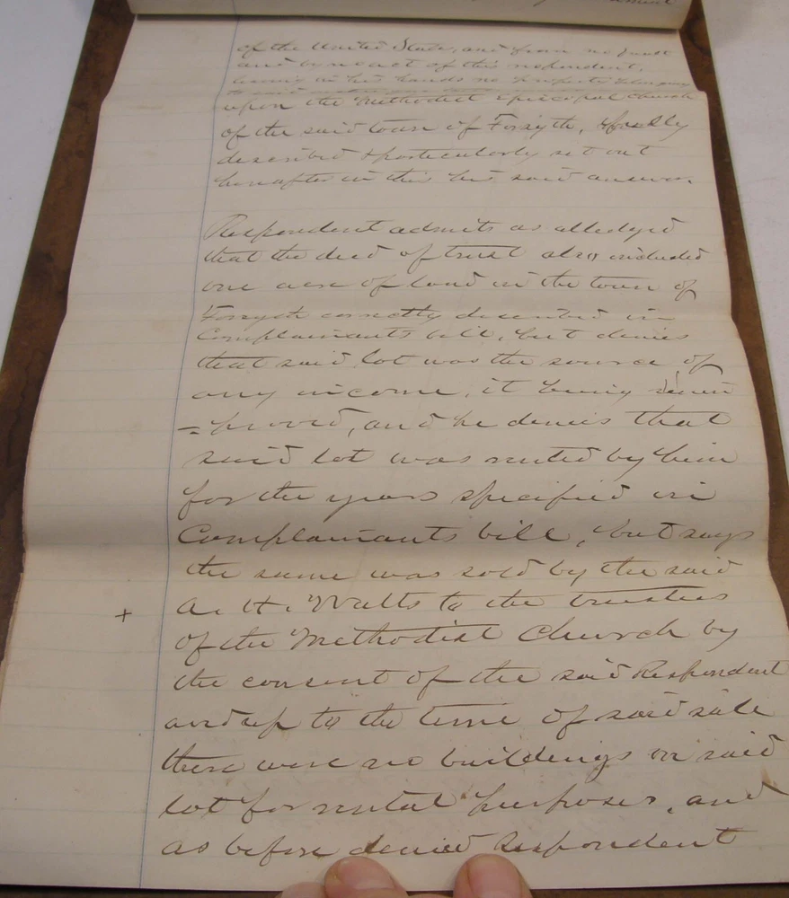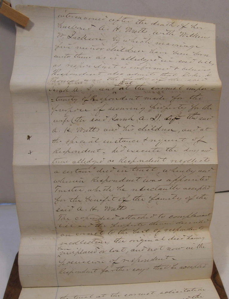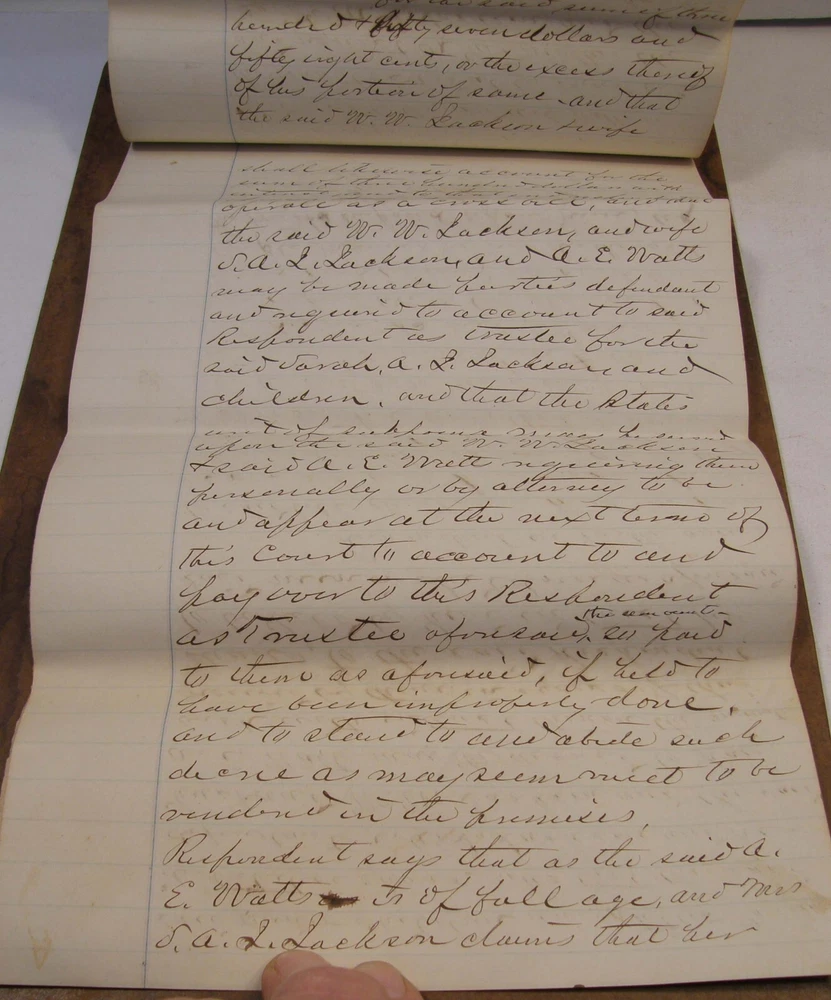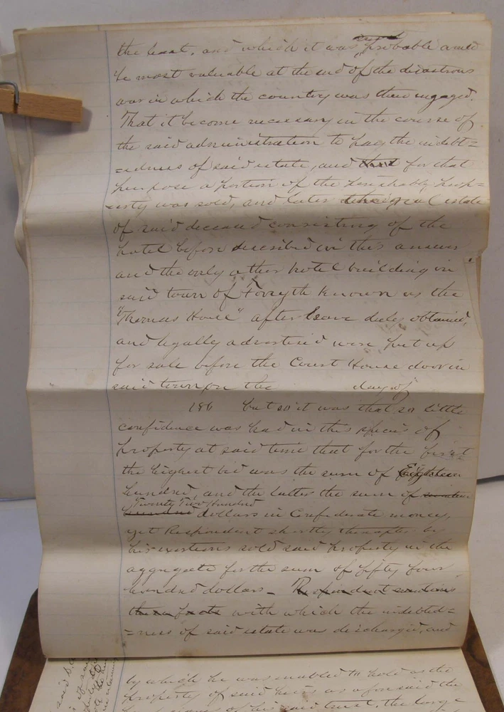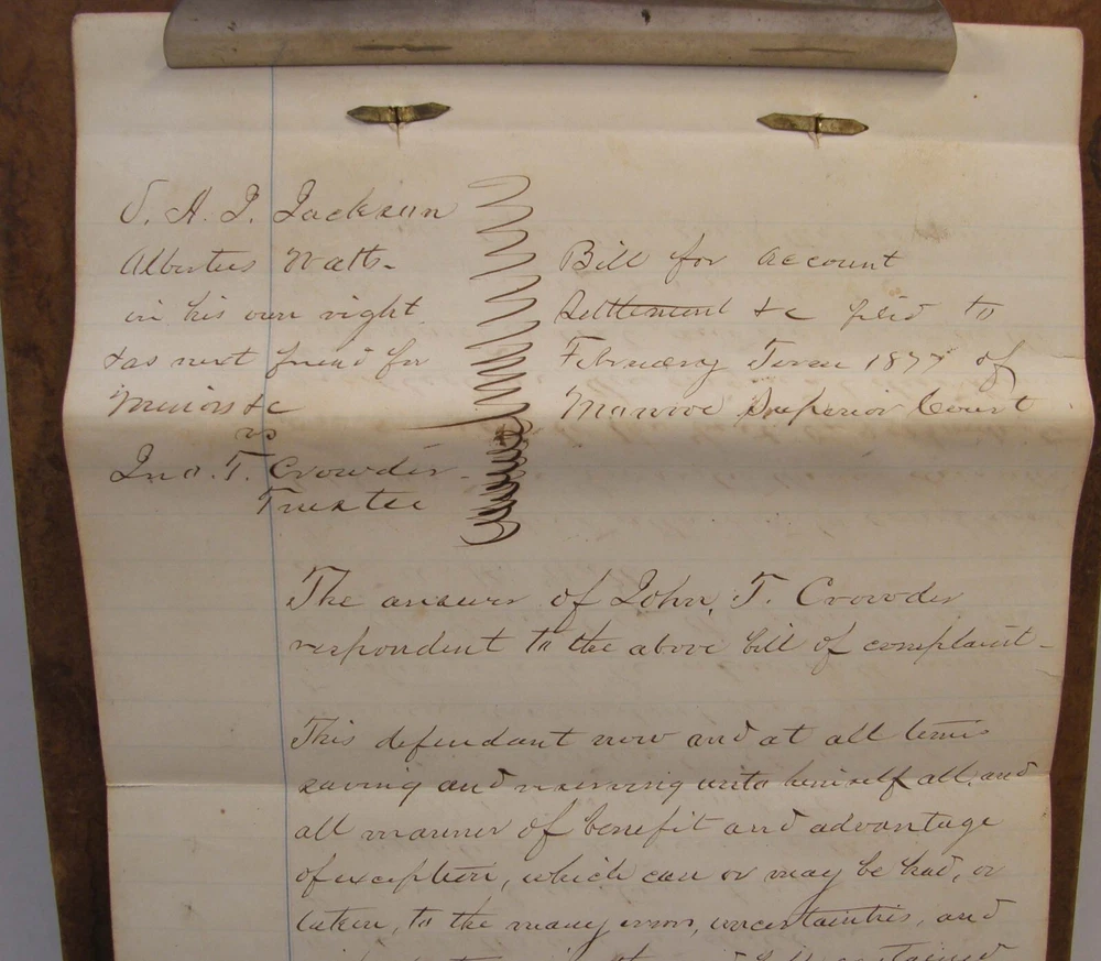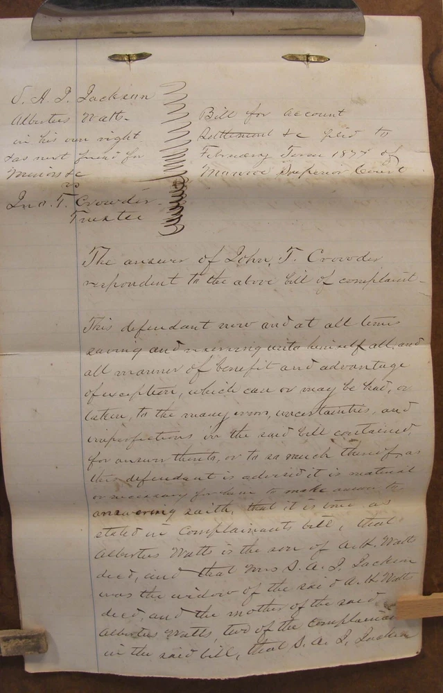 Please email with any questions. Antique handwritten Monroe County Superior Court legal document dated 1877, case between John Terrell Crowder and Albertus Watts and Sarah Ann Jerucia Thomas Jackson. Mrs Jackson was the widow of a man named Albertus H Watts who died in 1860. John Crowder was named trustee of Watts widow and children. Mr Watts must have been a relative or very close friend of Crowder since according to records online, he is buried in the Crowder Family cemetery in Monroe County. This document written 17 years after his death seems to have come from Watts son selling some property and using the proceeds that he had no right to in order to purchase the Johnston House Hotel on the public square in Forsyth, Georgia. The document has 20 handwritten pages. I didn't read the whole thing- between the stilted legalese and the handwriting it is a slow-go. I know that John T Crowder was a wealthy man in Monroe County and had organized a group of men into what was known as the "Monroe Crowders" during the Civil War.