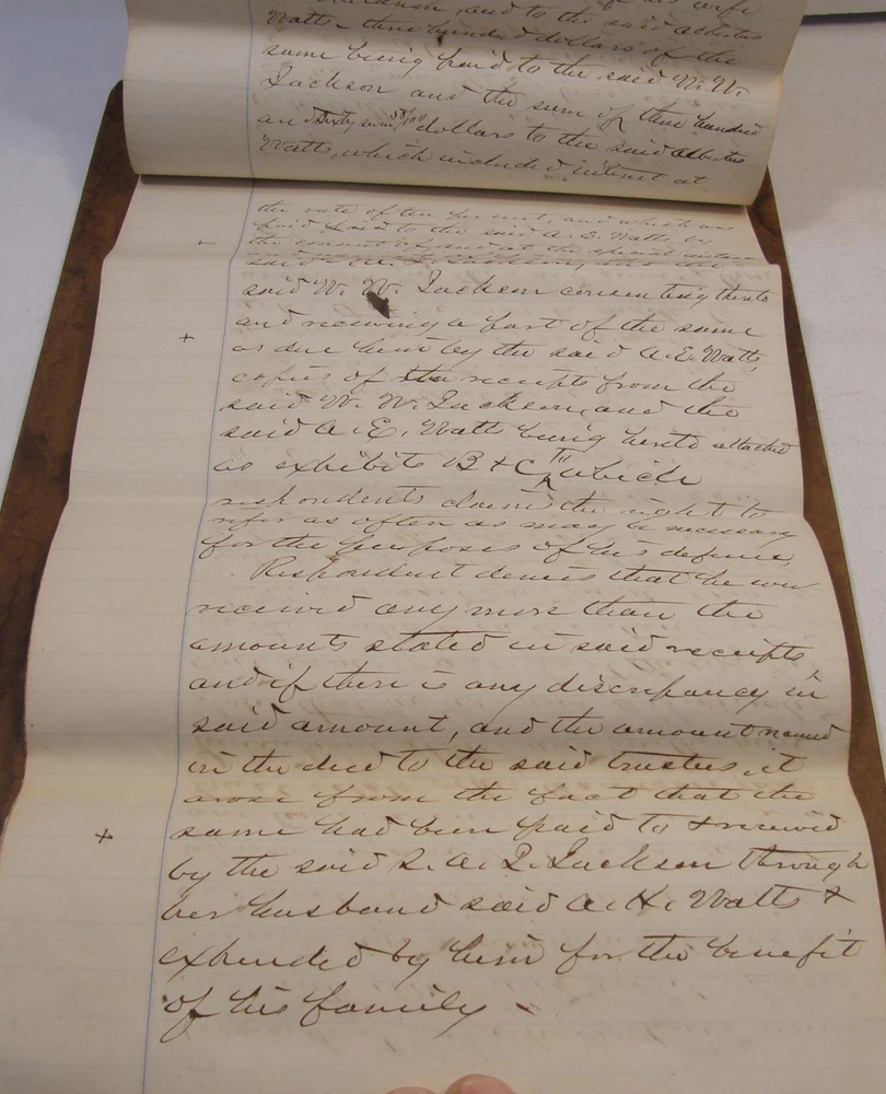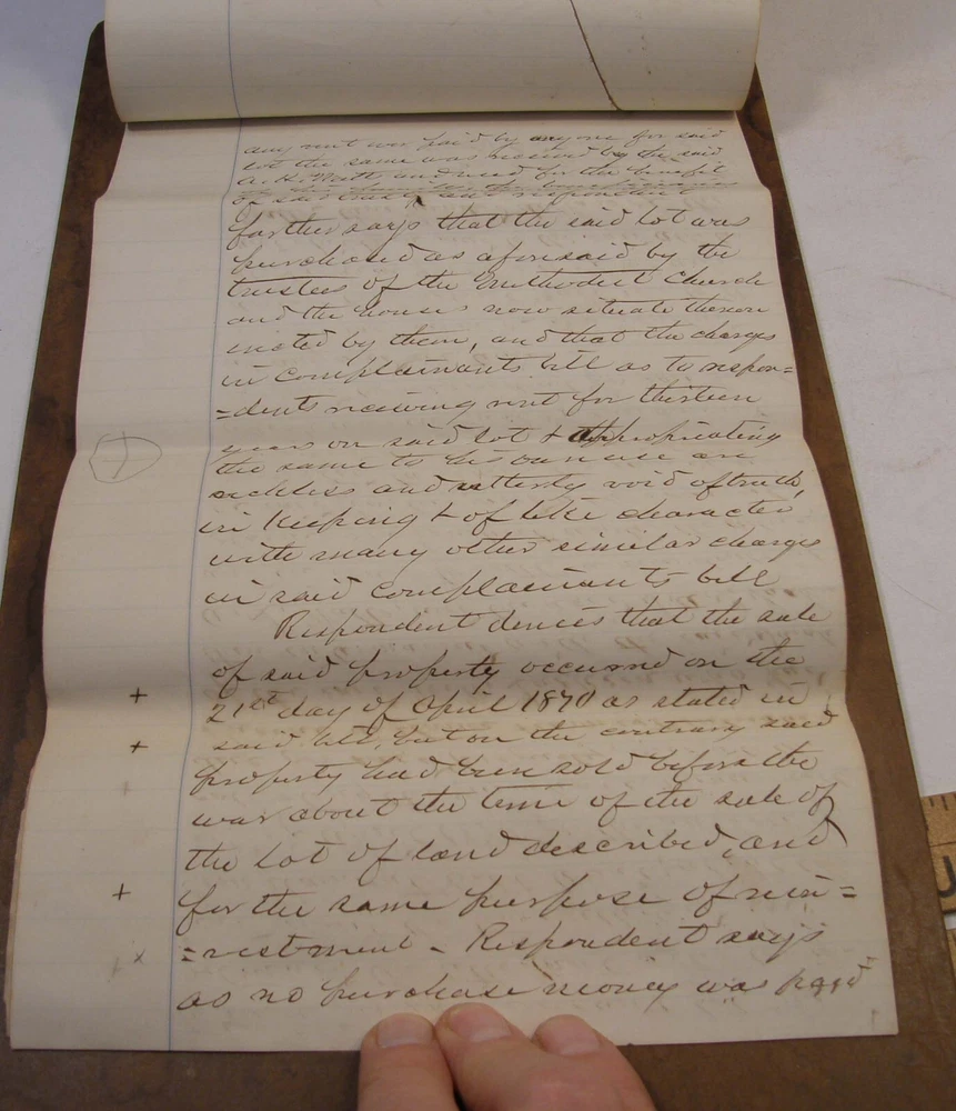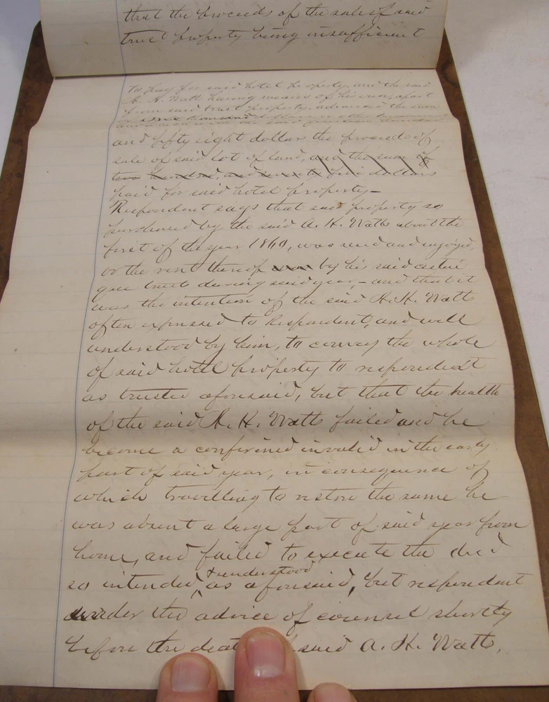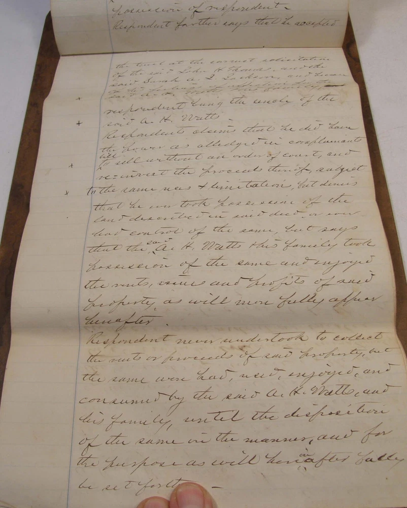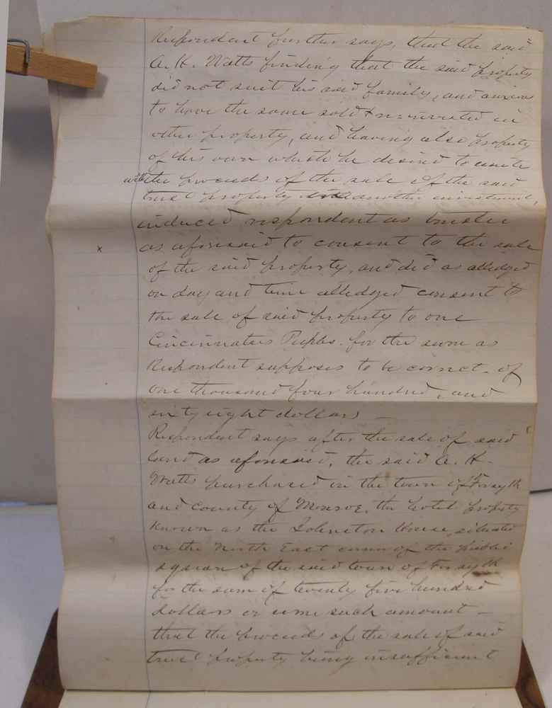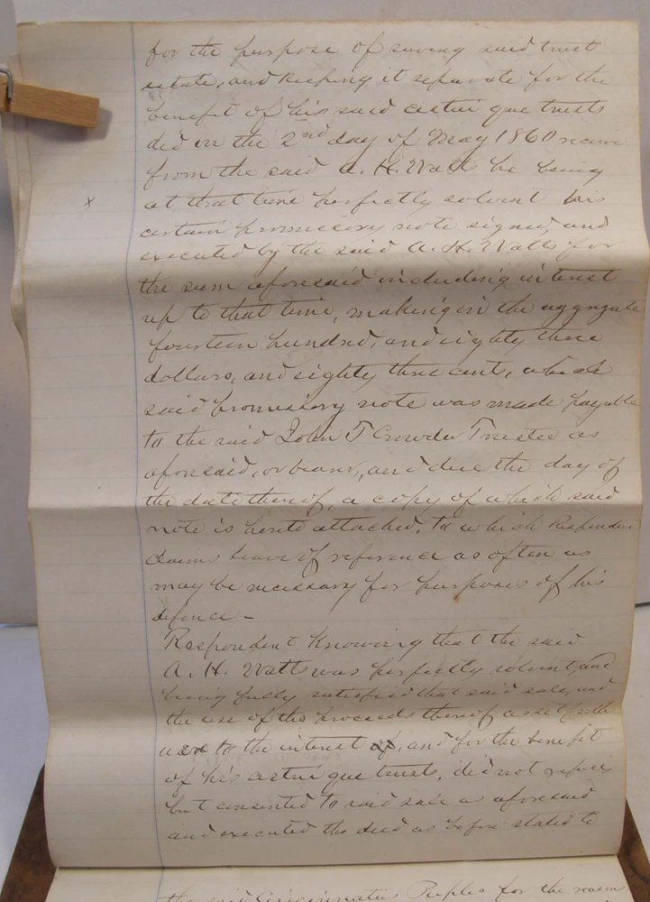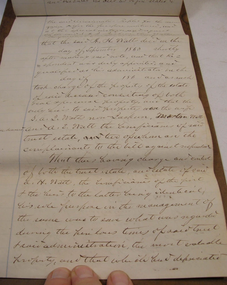 Please email with any questions. Antique handwritten Monroe County Superior Court legal document dated 1877, case between John Terrell Crowder and Albertus Watts and Sarah Ann Jerucia Thomas Jackson. Mrs Jackson was the widow of a man named Albertus H Watts who died in 1860. John Crowder was named trustee of Watts widow and children. Mr Watts must have been a relative or very close friend of Crowder since according to records online, he is buried in the Crowder Family cemetery in Monroe County. This document written 17 years after his death seems to have come from Watts son selling some property and using the proceeds that he had no right to in order to purchase the Johnston House Hotel on the public square in Forsyth, Georgia. The document has 20 handwritten pages. I didn't read the whole thing- between the stilted legalese and the handwriting it is a slow-go. I know that John T Crowder was a wealthy man in Monroe County and had organized a group of men into what was known as the "Monroe Crowders" during the Civil War.