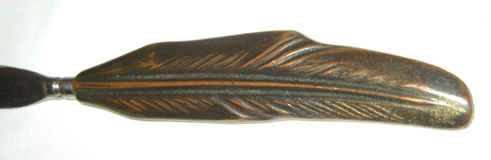 Background texture example **** BEING OFFERED IS THIS *** TRULY SPECTACULAR!!, *** XXX RARE!!, AND MUCH HARDER TO FIND!!, *** ANTIQUE FRENCH MADE, *** HEAVY & THICK SOLID BRONZE, DESK ART TOOL, PAPER - BILL - LETTER KNIFE OPENER, IN VERY GOOD TO EXCELLENT ANTIQUE USED AGED CONDITION ( PLEASE VIEW MY PHOTOS ). IT IS FRESH FROM A LOCAL CONNECTICUT ESTATE AND DISPLAYS NICELY!! IT HAS NOT BEEN WASHED, CLEANED, OILED, POLISHED, OR WAXED. IT MEASURES A WONDERFUL HOME - OFFICE DESK ART FRENCH BRONZE FEATHER LETTER OPENER KNIFE DISPLAY SIZE: 8 1/2 " LONG, X 3/4 " WIDE, X 1/4 " THICK. IT IS QUITE HEAVY, SOLID, THICK, STRONG, AND WELL MADE!! IT HAS A FANTASTIC DARK BRONZE AGED PATINA ON IT!! IT HAS NO BREAKS OR STRUCTURAL DAMAGE. IT HAS SURFACE WEAR AS SHOWN. IT IS A TRUE JOY JUST TO SEE, HOLD, FEEL, AND MARVEL AT!! *** IT IS GUARANTEED ANTIQUE FRENCH MADE BRONZE AND IS BEING SOLD AS FOUND / AS SHOWN. *** GOOD LUCK!!