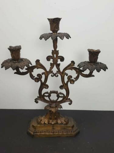 ANTIQUE BRONZE THREE ARM CANDLELABRA BLAKES PATENT, 19TH CENTURY Available for your consideration is this lovely three arm candelabra by Blake. Circa 19th century. This beautiful candelabra is either cast brass or bronze. It is decorated with leaf shaped holders and grape leaf and fruit bobeches. Each bobeche has x prisms. Marked "BLAKES PATENT" on the lower back side. The candelabra measures approx. 16 1/2" tall and 14 3/4" wide. Base measures approx. 8" wide and 4" deep. In very good antique condition. Bronze has been orange oiled. No chips, cracks, breaks or repairs found. Shed find, prisms may need a better cleaning. The pictures are an important part of this listing. Please use them as a condition aid. If you require additional photos or have questions please email before bidding. Thank you for looking. ATTENTION INTERNATIONAL BUYERS: Please understand that all international shipments will be shipped with full value declared. We will not falsify customs documents for any reason. It is illegal. I sell Vintage and Antique items therefore it is not always possible to include all scratches, imperfections etc. *COLORS ARE OUR BEST JUDGEMENT, SO PLEASE SEE PICTURES Please be aware my photos are considered part of the listing description and the description is based on my own knowledge, experience, and research. Statements regarding maker, age, origin, etc. particularly on unmarked pieces, should be evaluated and confirmed by you the buyer, as you are the final judge. Please ask questions that will help you in these evaluations. I also encourage and gladly accept opinions from knowledgeable buyers which only helps to make me a better seller and serve you better. Descriptions are as inclusive as possible but i f I miss something that is important to you please email me prior to bidding. I am always willing to combine shipping when practical. CT residents must add 6.35% sales tax. See my other listings for more great items! We accept PayPal and certified checks only. Shipping is generally the day following the receipt of payment via USPS or FedEx. If you have a preferred shipper please let me know. txzj pxzj24187 txzj-11 txzj85 txzj115