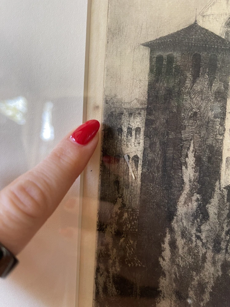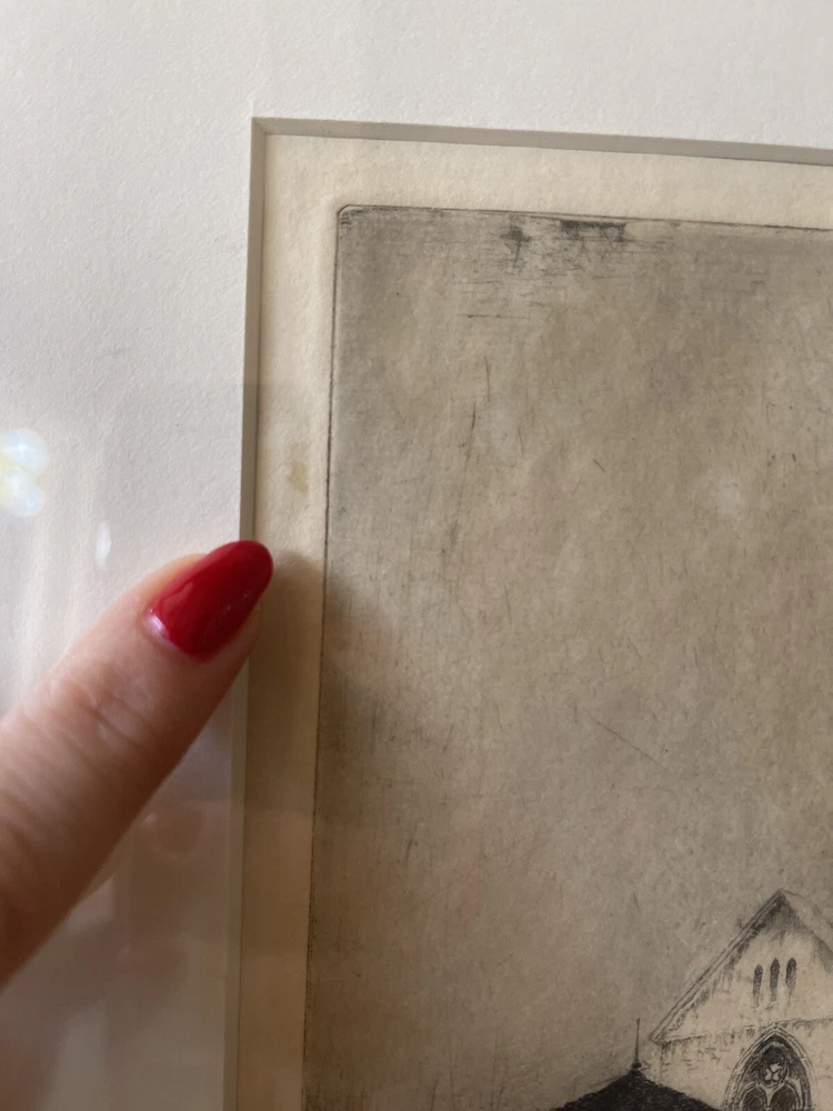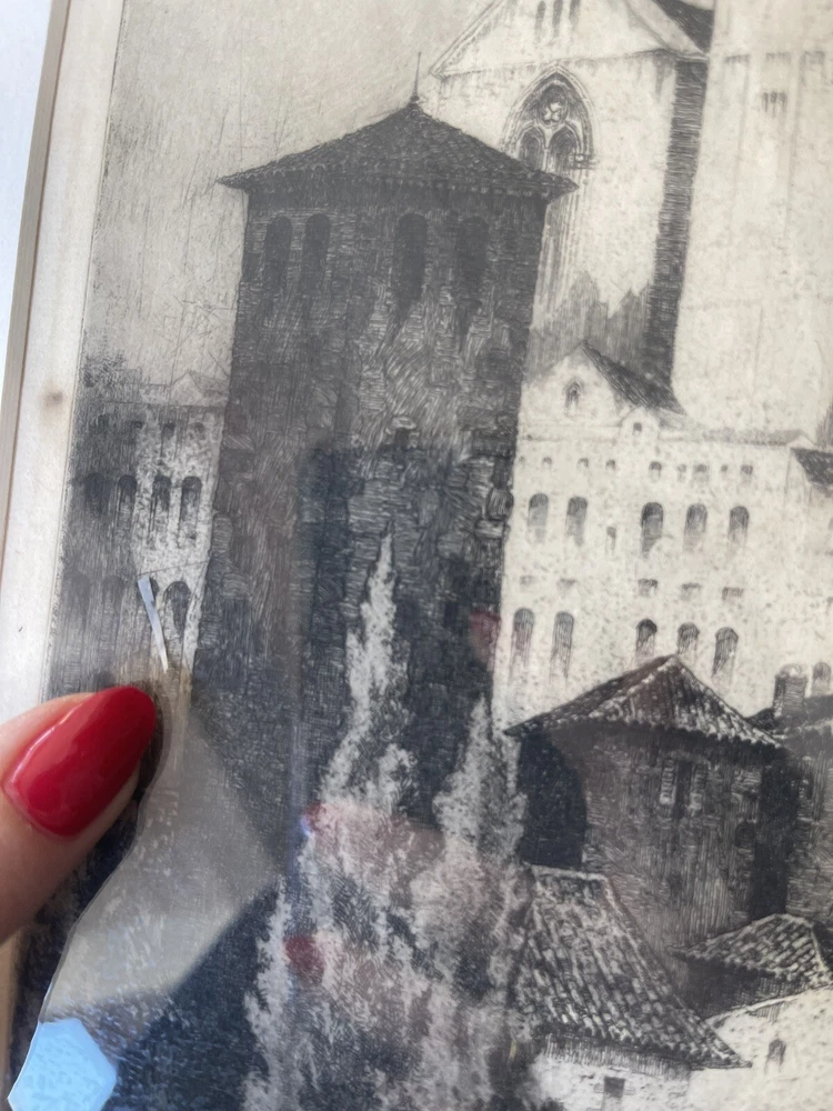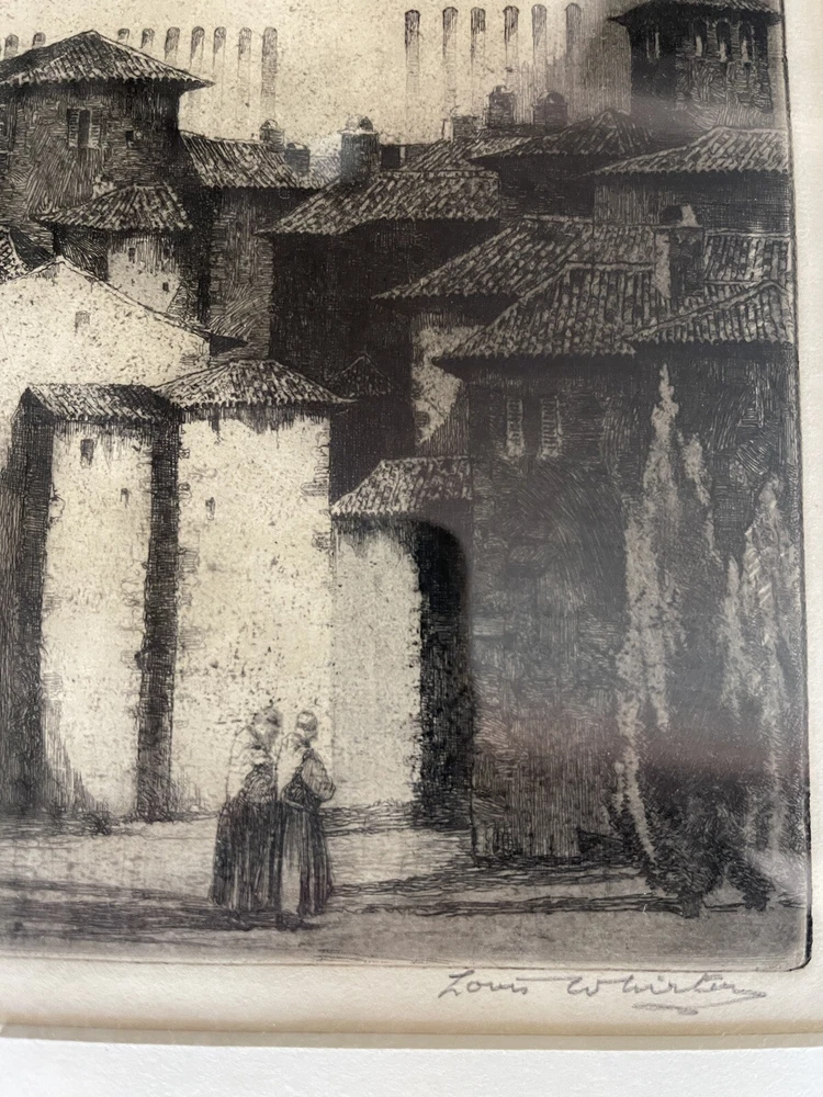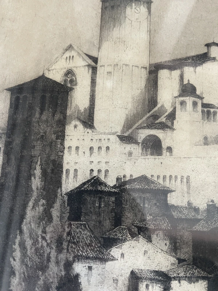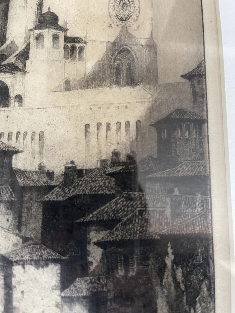 Antique Dry Point Etching (I believe) by listed artist Louis Whirter (1873-1932) Scottish. Titled: Assisi Italy San Francesco... This piece is beautifully framed and ready to hang on the wall; professionally framed & probably has plastic high grade "glass" that blocks UV light. MEASUREMENTS : It measures 15 1/2" x 19 12/" CONDITION : Overall in good condition. As shown in photos, there are a few places of light toning & foxing (left hand sides at top and close to the bottom). OFFERS : I have left Offers open, please send serious Offers. They will be considered. Thank you. Please e-mail with any questions at all. ALL SALES FINAL . SHIPPING : I do not profit from shipping. All pricing is reflective of current rates in the market. If it's too expensive, please do not purchase and then give bad shipping Stars to us sellers. Thank you for your understanding. I re-use boxes and try to re-use packing materials as well to keep costs to a minimum. And, If Item is over $100 dollars, additional insurance will be added. Please wait for invoice from me.