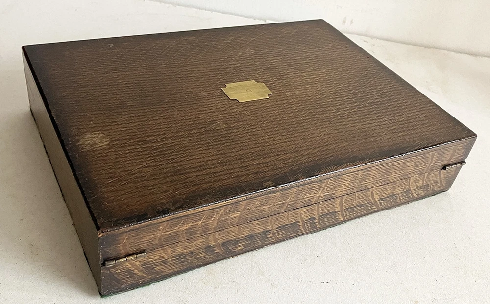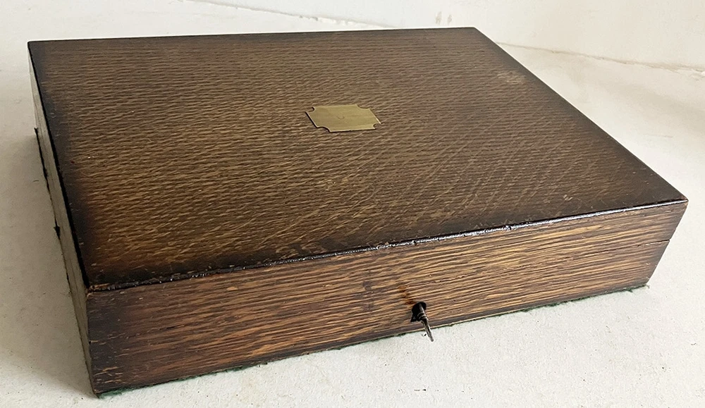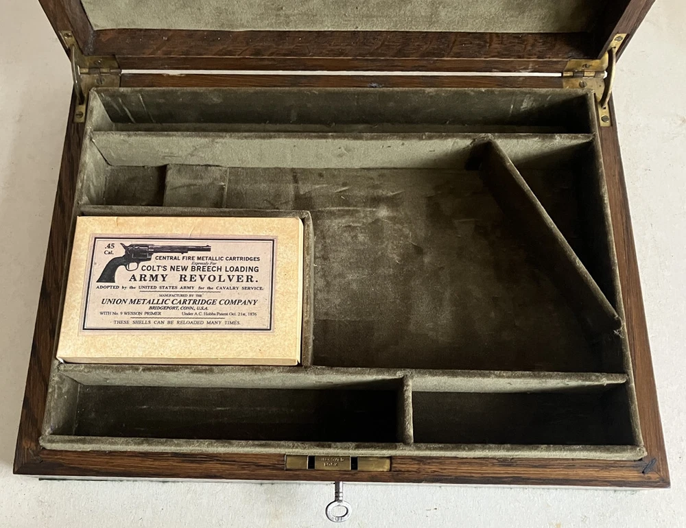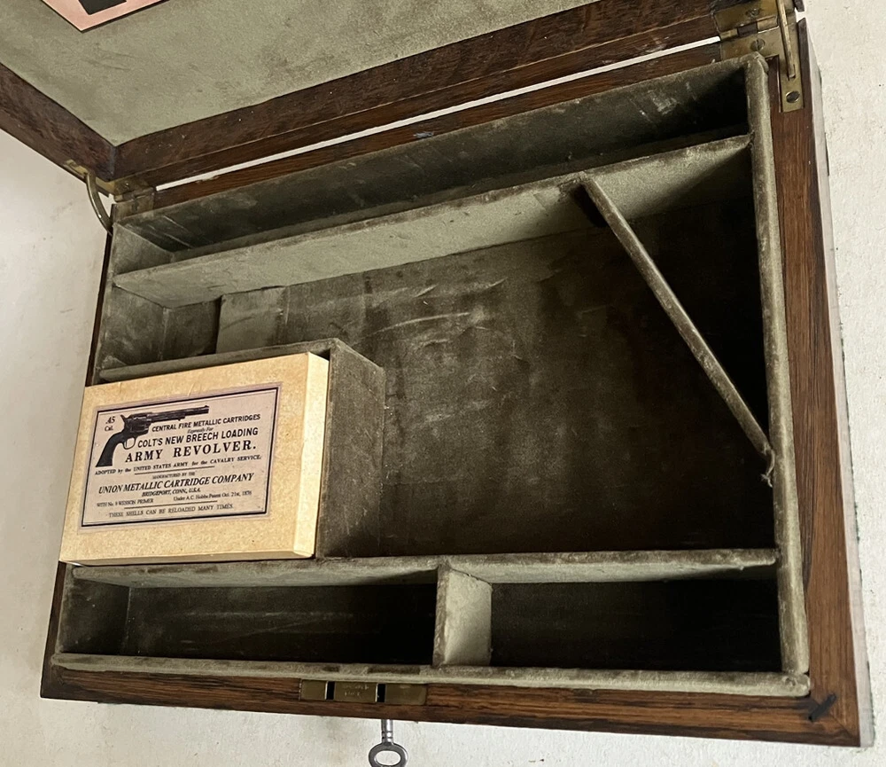 Antique Oak Case Recently Converted and Fitted out in Olive Green Cotton Velvet Lining to Take a Colt Single Action Army (Peacemaker) Revolver with a 4.75 inch Barrel (Not Bisley Model). Please Note this Case takes an Original Colt Snugly so it May Not take all the Clones and Will Just take the 5.5 Barrel as Well as the 4.75. Case has Brass Hinges and Working L ock with Key. Comes with the Empty Dummy Cartridge Box Shown (Contains NO Ammunition). Please Be Aware That Most of My Cases Are Old Antique Ones So Most Will Come With Some Sort of Marks, Digs or Scratches Etc on the Exterior Due to Age and Use. Anything Bad Like Large Splits Across a Lid or Warping I Will Always Mention. Most Are Intended for Antique Guns So the Aged Used Look is Better Suited and Please Remember what an Original Case would Cost You. Please Ask Any Questions Before Purchase Like is it Original Gun Case? NO Look at the Price.