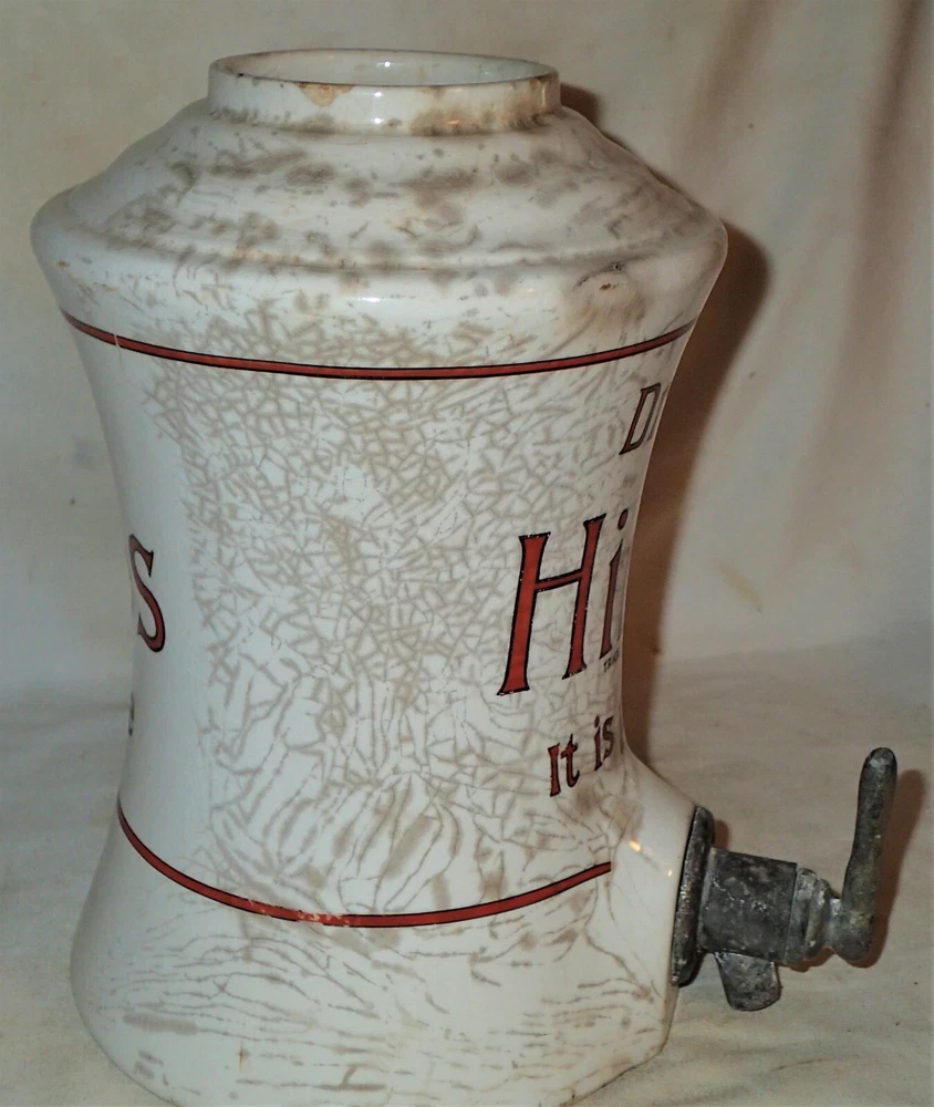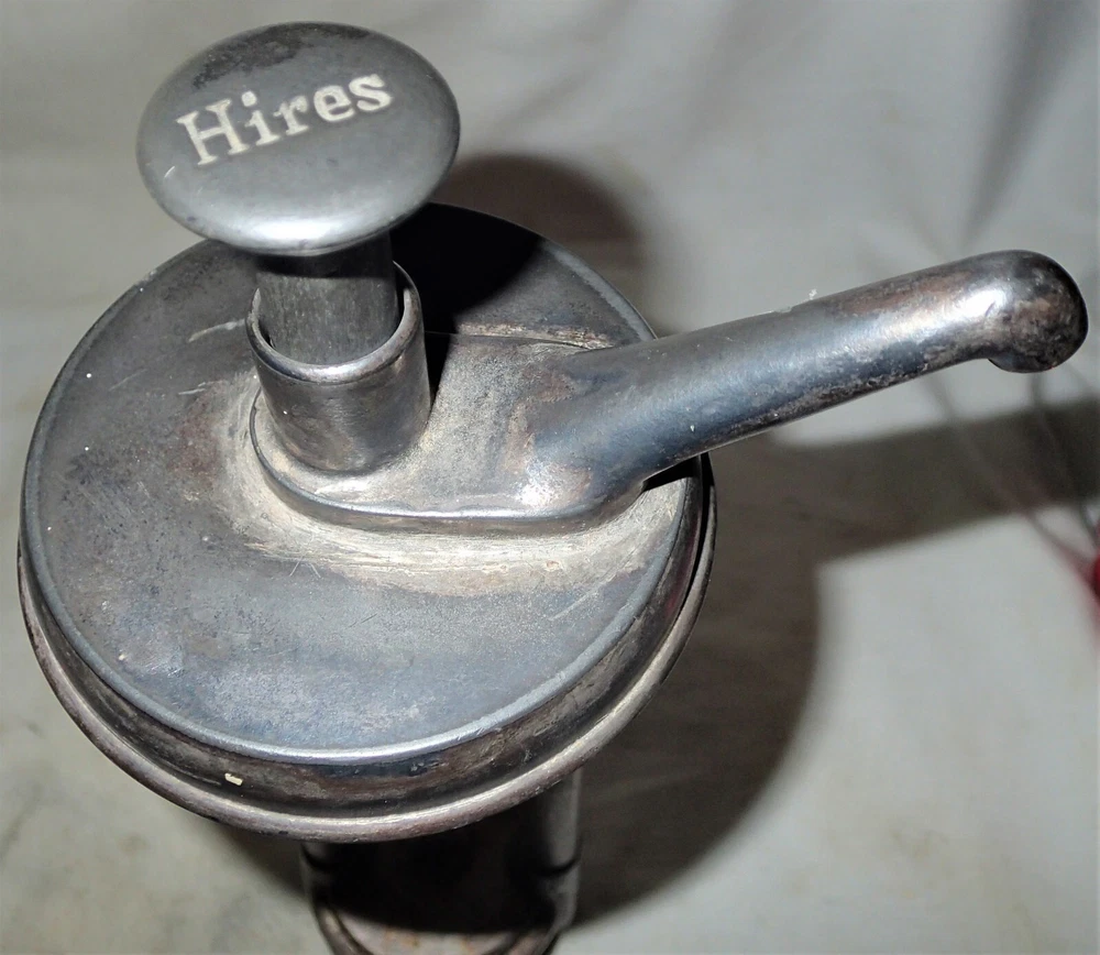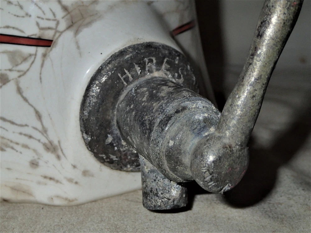 Background texture example *** BEING OFFERED IS THIS *** TRULY SPECTACULAR!!, *** XXX RARE!!, AND MUCH HARDER TO FIND!!, *** ANTIQUE ORIGINAL HEAVY DUTY AND STRONG ICE CREAM SHOP, *** HIRES ROOT BEER COUNTER TOP SODA SYRUP STONEWARE DISPENSER WITH GREAT ORIGINAL ANTIQUE HEAVY CHROMED METAL SYRUP PUMP, IN GOOD TO VERY GOOD ANTIQUE USED AGED CONDITION ( PLEASE VIEW MY PHOTO'S ). IT RETAINS THE ORIGINAL DUST AND DIRT ON IT...., "JUST AS I FOUND IT!!" IT IS EXTREMELY HEAVY, SOLID, STURDY, STRONG, AND WELL MADE ANTIQUE STONEWARE AND VERY HEAVY AND STRONG ANTIQUE SIGNED HIRES ORIGINAL SODA SYRUP PUMP, AS SHOWN!! I'M CERTAIN THAT YOU WILL BE VERY PLEASED TO OWN AND DISPLAY THIS UNIQUE HIRES "NOVELTY" ROOT BEER SODA SYRUP COUNTER TOP DISPENSER!! THE LARGE SIZE PUMP FITS NICELY INSIDE OF THE PORCELAIN SYRUP CONTAINER GIVING IT A GREAT LOOK TO IT!! IT HAS GREAT NOSTALGIA TO IT AND DISPLAYS NICELY!! THE STONEWARE BOTTOM ALONE MEASURES A HUGE DISPLAY SIZE: 14 3/4 " HIGH, X 7 1/4 " WIDE, X 3 1/2 " WIDE TOP OPENING WHERE THE ORIGINAL TOP METAL LID WOULD SIT ( NOT INCLUDED IN THE SALE ). THE ORIGINAL HEAVY DUTY AND STRONG NICELY SIGNED HIRES ANTIQUE CHROMED METAL SYRUP HAND PUMP IS INCLUDED AS SHOWN WHICH MEASURES: 12 1/4 " HIGH, X 3 " WIDE BASE. THE INSIDE TOP LID MEASURES: 3 3/4 ", X 5 1/4 " FROM SPOUT TO BACK LID. THE ENTIRE UNIT MUST WEIGH A VERY HEFTY SEVEN TO TEN POUNDS PRIOR TO PACKAGING!! *** PLEASE FEEL FREE TO ASK ANY AND ALL QUESTIONS PRIOR TO BUYING IT!! IT IS GUARANTEED ANTIQUE AND IS BEING SOLD AS FOUND / AS SHOWN. *** GOOD LUCK!! 09-09-B-2022.