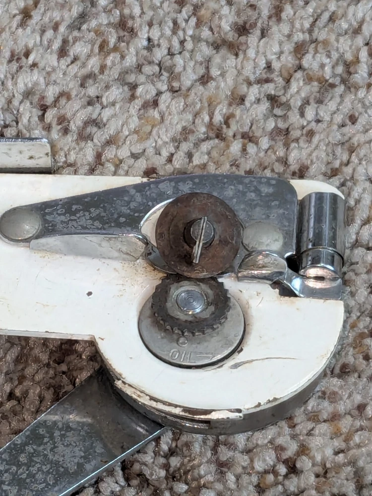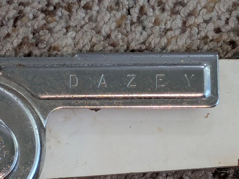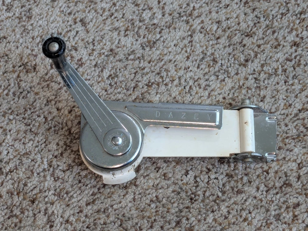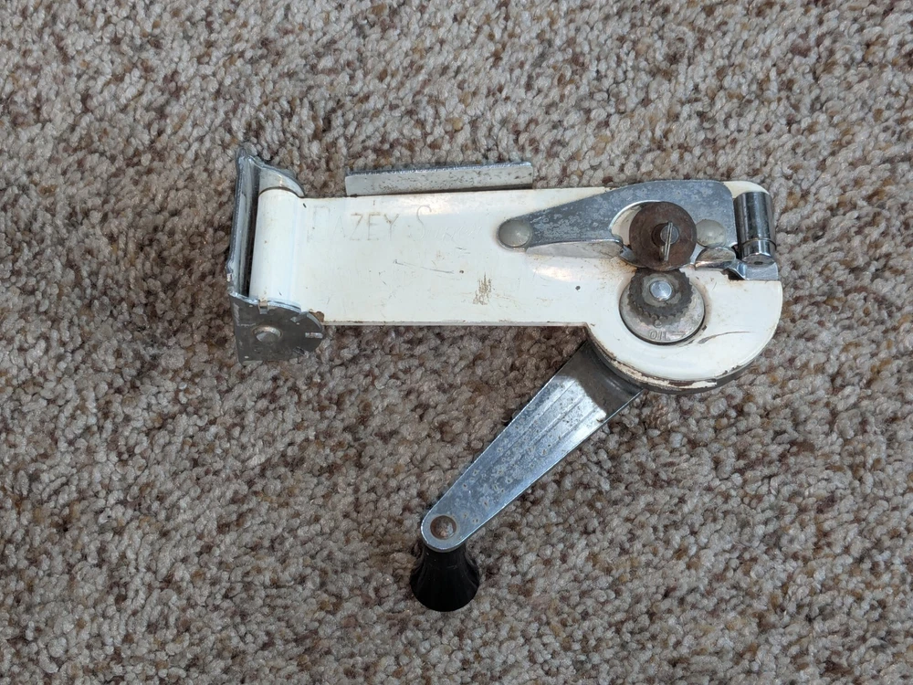 Antique: Yes Time Period Manufactured: 1950-1959 Power Source: Manual Style: 1950s Set Includes: Opener Country/Region of Manufacture: United States Material: Metal Manufacturer Warranty: No Warranty UPC: Does not apply Size: Large Theme: Food Item Weight: 1 lb Original/Reproduction: Original Pattern: No Pattern Number of Items in Set: 1 gtin13: Does not apply Brand: Dazey Type: Can Opener Color: White