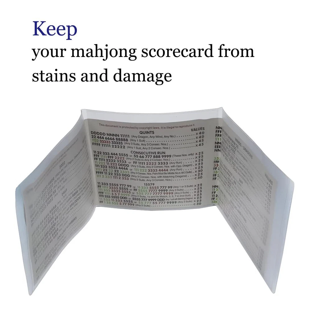 AOG Mahjong Card Holder 1 Piece (Large Print) for National Mah Jongg League Score Cards American NMJL,PVC Durable,Mah Jongg Cover Sleeve Case Protector Accessories 2024 Designed specifically to protect your National Mah Jongg League Hands and Rules Card( Large Print ). Mahjong Scorecards come in Standard and Large, please make sure to choose the correct size.NMJL CARD NOT INCLUDED! NON GLARE plastic, matte finish for easy use. Fully protects your American mahjong cards 2023 from stains and damage. 1 YEAR refund and return warranty. Shipping We offer FREE shipping on all orders! We use a selection of shipping services such as UPS, FedEx, USPS etc. We only ship to the lower 48 states, no APO/FPO addresses or PO Boxes allowed. Local pickups and combined shipping options are not provided at this time. Return You can return a product for up to 30 days from the date you purchased it. Any product you return must be in the same condition you received it and in the original packaging. Please keep the receipt. Payment We accept payment by any of the following methods: PayPal Please pay as soon as possible after winning an auction, as that will allow us to post your item to you sooner! Feedback Customer satisfaction is very important to us. If you have any problem with your order, please contact us and we will do our best to make you satisfied. Contact Us If you have any queries, please contact us via ebay. We usually respond within 24 hours on weekdays. Please visit our eBay store to check out other items for sale! Thank you for shopping at our store.