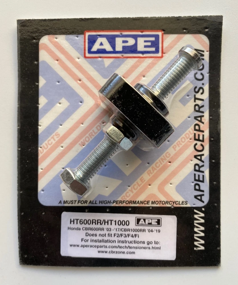 From the street to the racetrack, we have you covered. We look forward to the opportunity to continue to serve you in the years to come. Miles Frederick, President Street & Competition, Inc. About Us: SHIPPING: Quoted Shipping charges are United States and Puerto Rico Postal Zip Codes ONLY We offer discounted combined shipping when purchasing multiple items. HANDLING: Typically items are processed through our facility and leave our warehouse within 1 business day of cleared payment. RETURNS: Returns are not accepted for this item. Please ask any questions before purchasing. Shipping and Return Policy WHAT YOU RECEIVE: 1 - New APE Manual Cam Chain Tensioner, in original packaging. Gasket not included. COLOR - RED APE manual cam chain tensioners are designed to replace the automatic and hydraulic tensioners on high-performance engines. The automatic adjusters can back out when the throttle is closed suddenly at high rpm. This allows the cams to go momentarily out of time, and can result in bent valves and/or serious engine damage. Hydraulic tensioners have a tendency to put too much tension on the chain guide under high rpm/high oil pressure conditions, resulting in premature wear. Both problems can be eliminated with the installation of the APE manual tensioner. No matter what the engine does, the cam chain tension will remain constant. An APE manual cam chain tensioner is a must for any kind of performance riding. APE manual tensioners are CNC machined from billet alloy to exact tolerances for perfect fit. Product Description HONDA: CBR1000RR 04-23 CBR600RR 03-23 VFR800 02-08 (2 Required for installation) Compatible Models Manual Cam Chain Tensioner