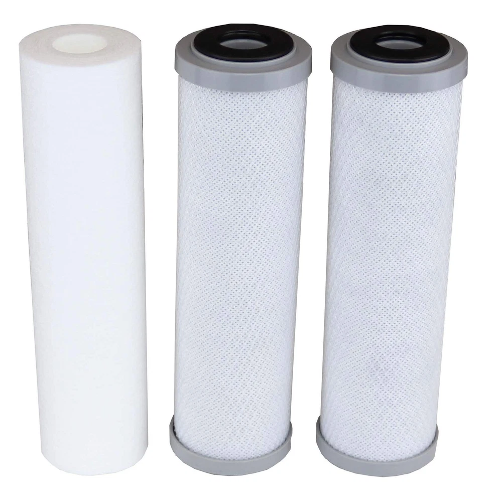 Compatible APEC FILTER-SET bottom 3 filters for model ROES-50, ROES-75, RO-45, RO-90, RO-PH90, RO-PERM, RO-PUMP, RO-Hi, WFS-1000, ROES-UV75, ROES-PH75, ROES-PHUV75, ROES-UV75-SS includes 1 sediment filter and 2 carbon block filters. 1st stage: Multi-layer 5 micron Sediment filter for more dirt holding capacity and extended service life. Dimension 2.5” diameter, 9.84” length” , standard size Fits standard 10” filter housing canister Made with Pure Polypropylene, no BPA Conform toe ISO 9001:2000 Manufacturing standard Removes sediment, dirt, sand, rust Replace every 12 months 2nd & 3rd stage: Activated coconut shell carbon block for extra capacity 5 micron rating 6,000 gallons chlorine reduction capacity or 2,000 gallons RO water usage capacity Dimension 2.75” diameter, 9.84” length Activated carbon block filter made with 100% high quality coconut shell carbon. Removes sediment, chlorine, chloramines, taste, odor, THM, VOC, Pesticide, Herbicide, turbidity Replace every 12 to 18 months Save Money and Time 100% compatible includes bottom 3 filters, one sediment filter, two carbon block filters + instructions and free tech support, extended service life, Contractor’s Choice 1st stage: Multi-layer 5 micron Sediment filter for more dirt holding capacity and extended service life. Dimension 2.5” diameter, 9.84” length” , standard size Fits standard 10” filter housing canister Made with Pure Polypropylene, no BPA Conform toe ISO 9001:2000 Manufacturing standard Removes sediment, dirt, sand, rust Replace every 12 months 2nd & 3rd stage: Activated coconut shell carbon block for extra capacity 5 micron rating 6,000 gallons chlorine reduction capacity or 2,000 gallons RO water usage capacity Dimension 2.75” diameter, 9.84” length Activated carbon block filter made with 100% high quality coconut shell carbon. Removes sediment, chlorine, chloramines, taste, odor, THM, VOC, Pesticide, Herbicide, turbidity Replace every 12 to 18 months Better bonding and structure designed minimize channeling effect and extend service life