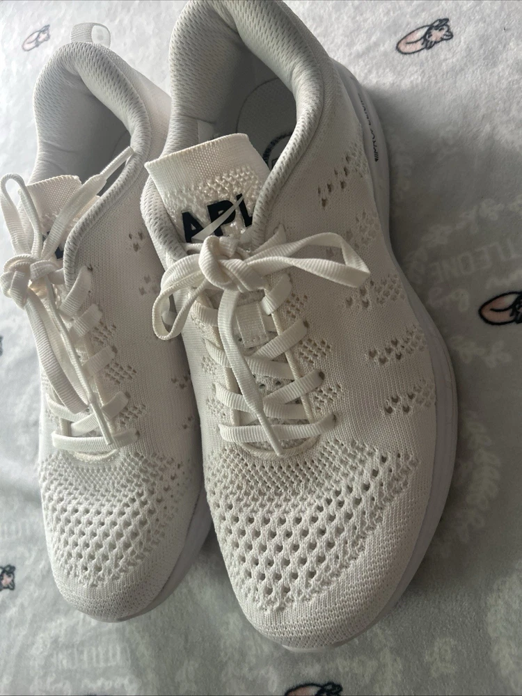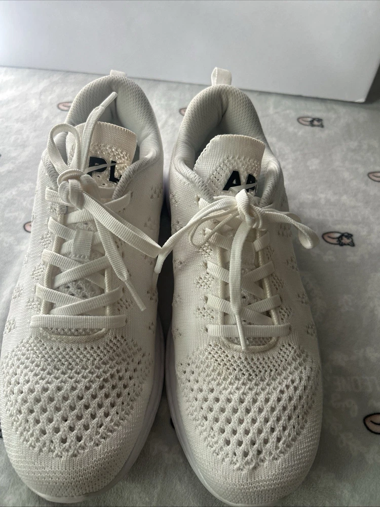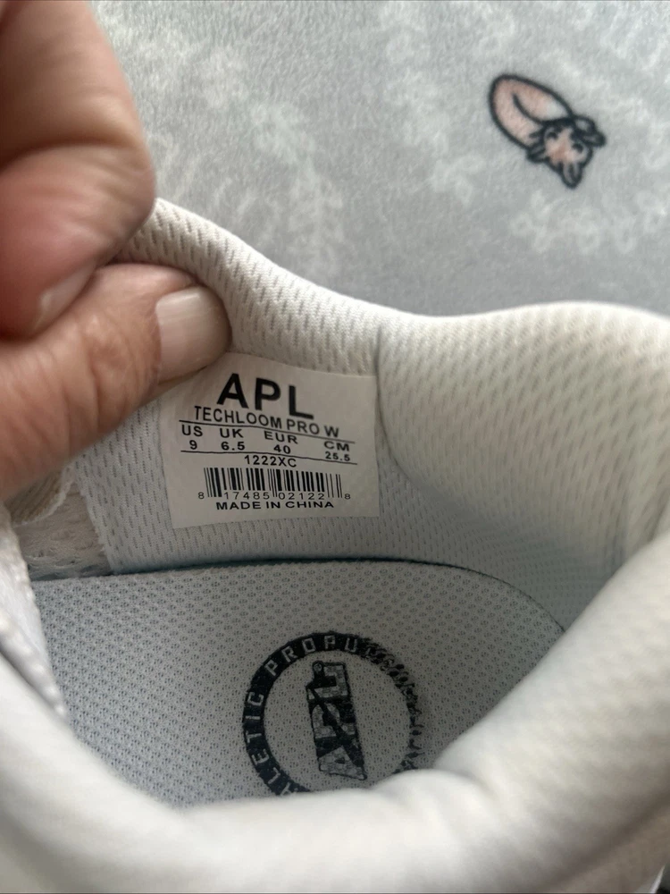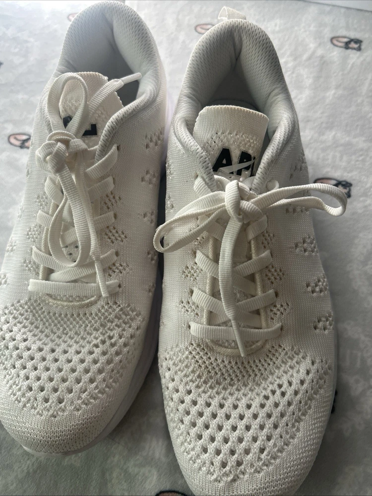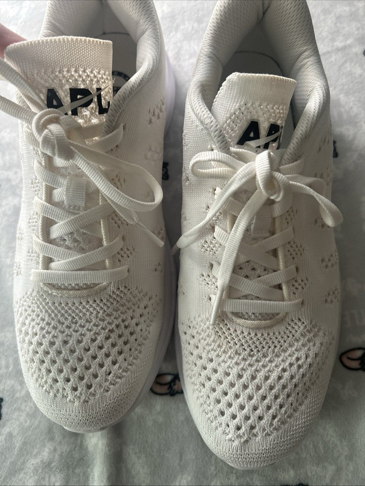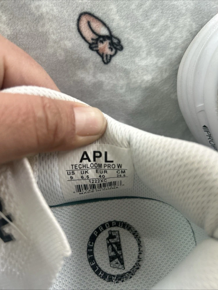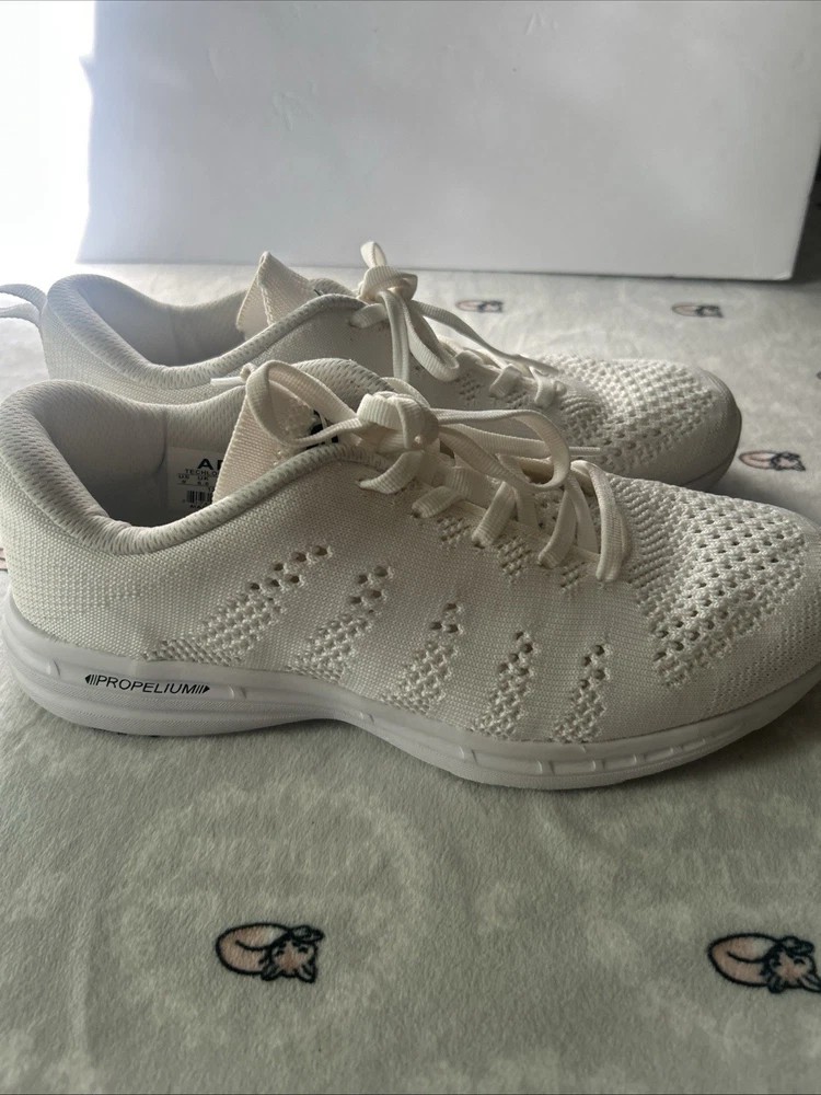 The APL Techloom Pro size9 shoes are a stylish and comfortable choice for women who enjoy running and jogging. With a low top design and lace-up closure, these athletic sneakers are perfect for active occasions. The solid white color with logo accents adds a fashionable touch to the knit fabric lining. These shoes provide a standard shoe width and are ideal for the spring, summer, and fall seasons. The rubber outsole offers durability and support for your active lifestyle.