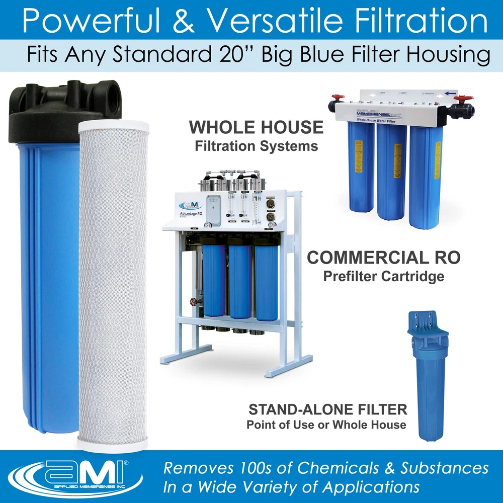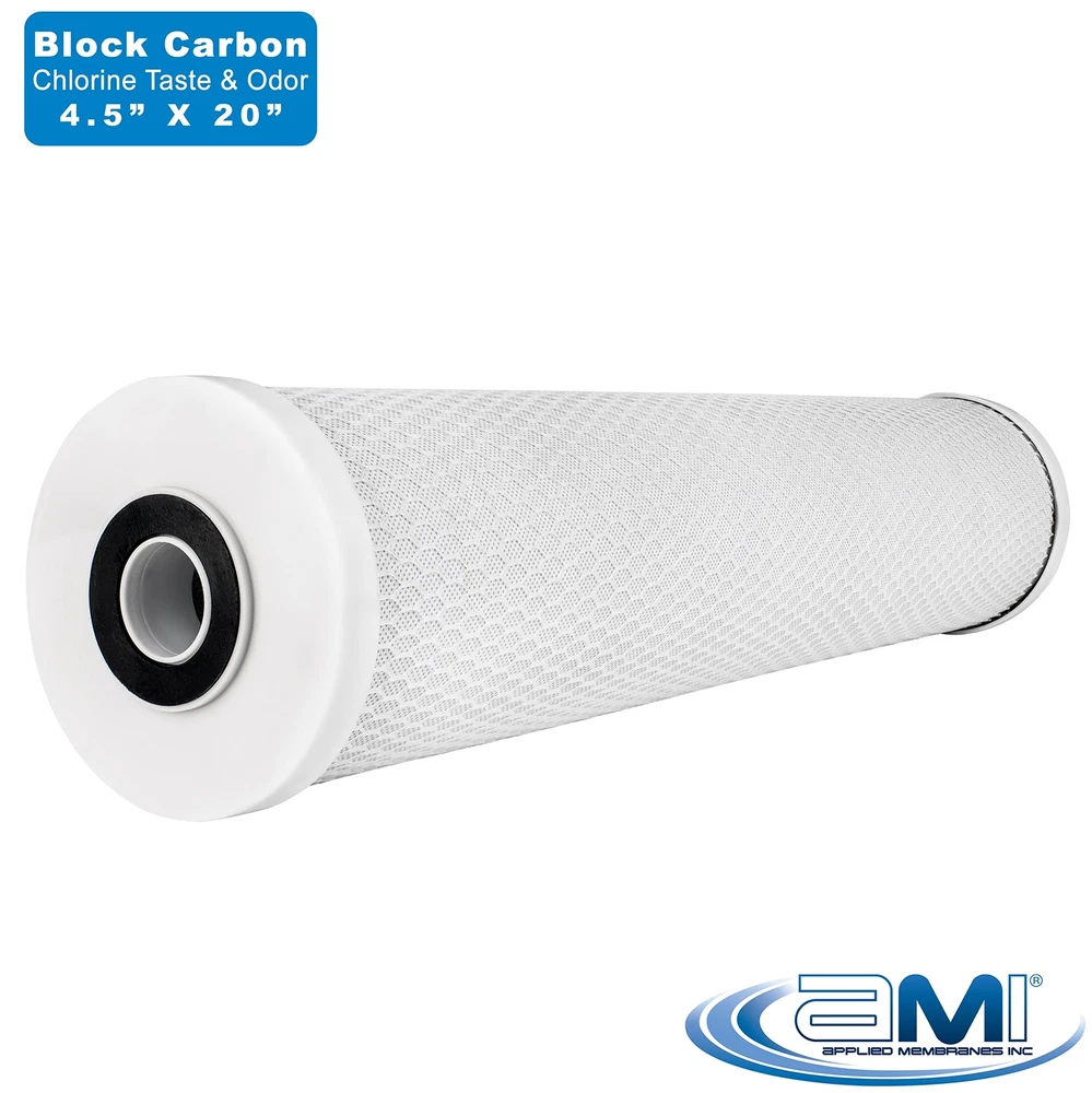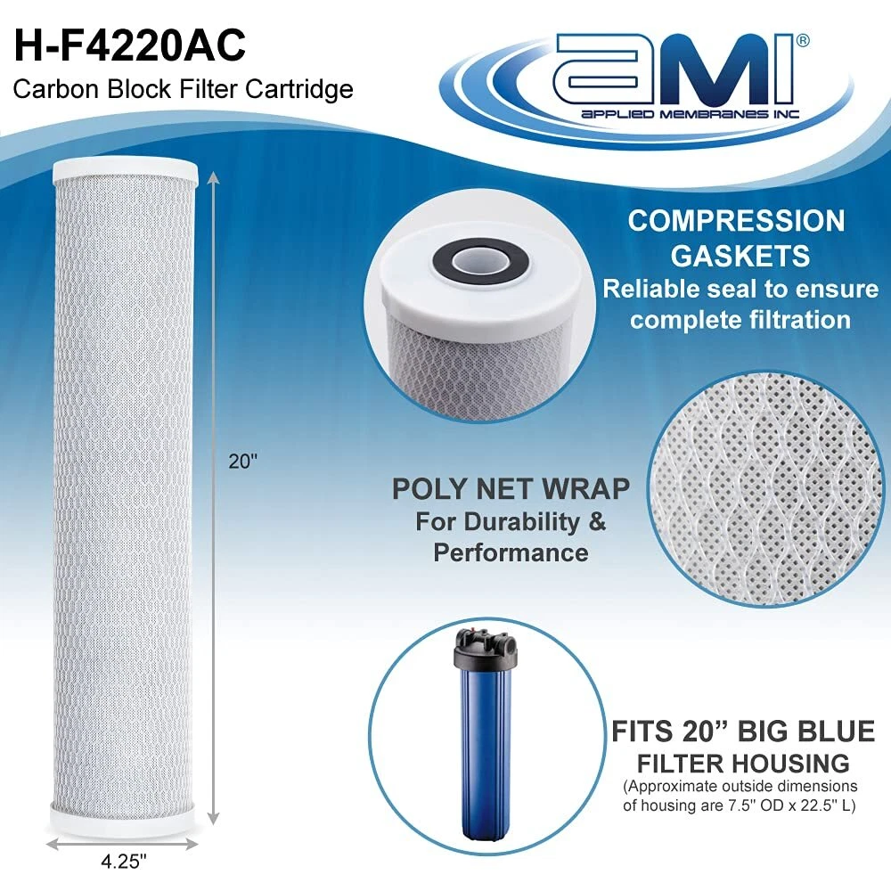 4.5”x20” Carbon Water Filter For Chlorine, Taste, Color, And Odor Reduction Activated Carbon Block Filter Cartridge to fit 20” Big Blue Filter Housing Removes Chlorine From 5,000 Gallons of Water @ 3 gpm AMI Activated Carbon Filter Cartridges remove chlorine, organics, color, tannin, and objectionable tastes and odors from water. AMI 4.25" x 20" filter cartridge is designed to fit 20-inch Big Blue housings. H-F4220AC Carbon filter is made with 100% carbon produced from coconut shells, a renewable and sustainable resource, offering superior chemical absorption compared to coal-based carbon filters. Applied Membranes Carbon Filters Significantly Reduce the Following Contaminants: Chlorine Chlorine By-Products - Trihalomethanes (THMs): A Group of organic chemicals suspected of being carcinogenic. Bad Tastes & Odors Turbidity (Cloudy Water) Herbicides, Pesticides, & Insecticides Volatile Organic Chemicals (VOCs): Organic Chemicals that turn into vapor. Best Tasting Water - Highest Absorption of Bad Tastes & Odors for Clean, Fresh Flavor Crystal Clear Ice & Water - Removes Color & Cloudiness 5 Micron Filtration - No carbon fines Eco-Friendly - Produced from renewable resources, using recycling programs and local sourcing Model:H-F4220AC Filter Cartridge Dimensions:4.25" OD x 1.125" ID x 20"L Fits 20” Big Blue Filter Housing(Approximate outside dimensions of housing are 7.5"OD x 23"L ) Capacity: 5,500 Gallon Chlorine Reduction @ 3 GPM Flow Rate:3 GPM (11 LPM) Micron Rating:5 μ (5 Micron) Carbon Type:Coconut Shell Carbon Amount of Carbon:5.4lb (2450 g) Polypropylene End Caps with PVC Compression Gaskets Operating Temperature:40-100°F (4.5-37.7°C) Max. Operating Pressure:125 psig (8.6 bar) Filter Cartridge Dimensions: 4.5" x 20"" - fits 20" Big Blue Water Filter Housing Reduces and removes Chlorine, organics, VOCs, color, tannin, and objectionable tastes and odors from the water. Quality Commercial Water Filtration down to 10 Microns with Activated Carbon Block Filter Cartridge Suitable for Pre or Post treatment of residential and commercial RO systems, or as a stand-alone Whole House Point of Entry or Point of Use water treatment solution. Uniform Extruded Carbon Core prevents the release of carbon fines and is rated for high dirt holding capacity.