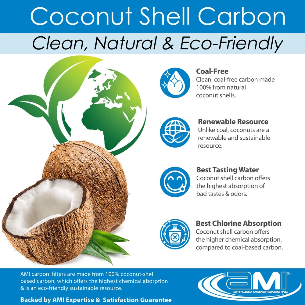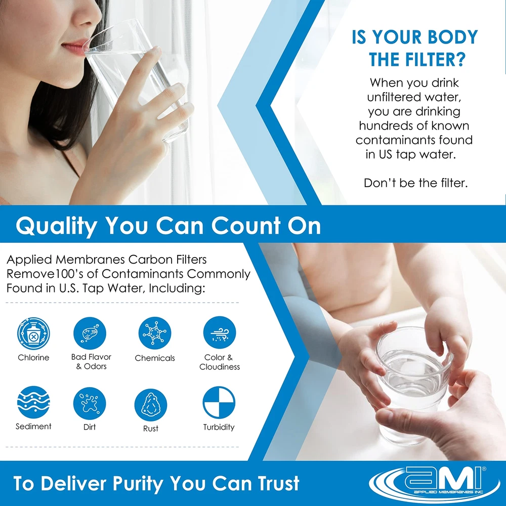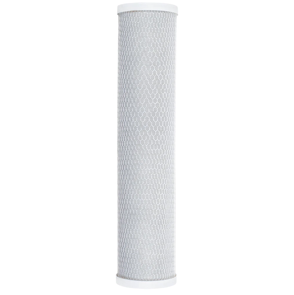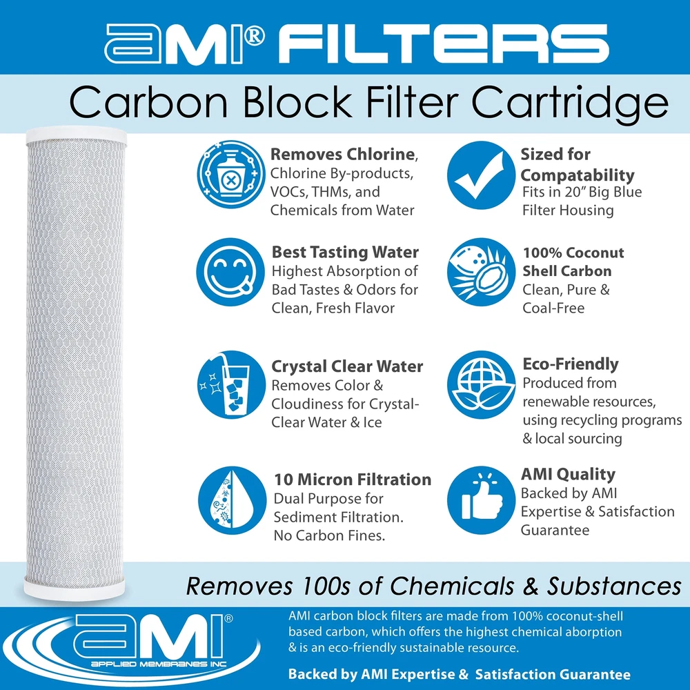 4.5”x20” Carbon Water Filter For Chlorine, Taste, Color, And Odor Reduction Activated Carbon Block Filter Cartridge to fit 20” Big Blue Filter Housing Removes Chlorine From 5,000 Gallons of Water @ 3 gpm AMI Activated Carbon Filter Cartridges remove chlorine, organics, color, tannin, and objectionable tastes and odors from water. AMI 4.25" x 20" filter cartridge is designed to fit 20-inch Big Blue housings. H-F4220AC Carbon filter is made with 100% carbon produced from coconut shells, a renewable and sustainable resource, offering superior chemical absorption compared to coal-based carbon filters. Applied Membranes Carbon Filters Significantly Reduce the Following Contaminants: Chlorine Chlorine By-Products - Trihalomethanes (THMs): A Group of organic chemicals suspected of being carcinogenic. Bad Tastes & Odors Turbidity (Cloudy Water) Herbicides, Pesticides, & Insecticides Volatile Organic Chemicals (VOCs): Organic Chemicals that turn into vapor. Best Tasting Water - Highest Absorption of Bad Tastes & Odors for Clean, Fresh Flavor Crystal Clear Ice & Water - Removes Color & Cloudiness 5 Micron Filtration - No carbon fines Eco-Friendly - Produced from renewable resources, using recycling programs and local sourcing Model:H-F4220AC Filter Cartridge Dimensions:4.25" OD x 1.125" ID x 20"L Fits 20” Big Blue Filter Housing(Approximate outside dimensions of housing are 7.5"OD x 23"L ) Capacity: 5,500 Gallon Chlorine Reduction @ 3 GPM Flow Rate:3 GPM (11 LPM) Micron Rating:5 μ (5 Micron) Carbon Type:Coconut Shell Carbon Amount of Carbon:5.4lb (2450 g) Polypropylene End Caps with PVC Compression Gaskets Operating Temperature:40-100°F (4.5-37.7°C) Max. Operating Pressure:125 psig (8.6 bar) Filter Cartridge Dimensions: 4.5" x 20"" - fits 20" Big Blue Water Filter Housing Reduces and removes Chlorine, organics, VOCs, color, tannin, and objectionable tastes and odors from the water. Quality Commercial Water Filtration down to 10 Microns with Activated Carbon Block Filter Cartridge Suitable for Pre or Post treatment of residential and commercial RO systems, or as a stand-alone Whole House Point of Entry or Point of Use water treatment solution. Uniform Extruded Carbon Core prevents the release of carbon fines and is rated for high dirt holding capacity.