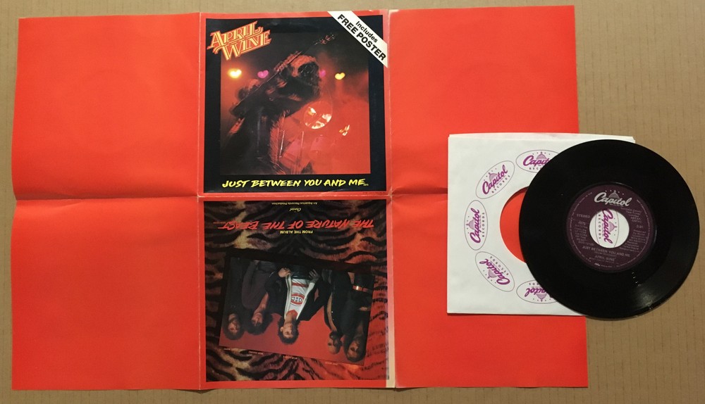 1983 1993 MINT CONDITION Vinyl NEAR Condition Sleeve, there is ULTRA ULTRA LIGHT general wear on the outer sleeve , BUT STILL EXTREMELY NICE, AND CLOSE TO MINT (see scan for actual item, and the vinyl itself is MINT This 7 inch, MADE IN THE USA ONLY. THIS FEATURES A MULTI Panel fold out poster MADE IN VERY SMALL QUANTITY ULTRA LIMITED VINYL. This is packaged in a NICE SLEEVE THIS WAS MADE BY capitol Records ., it is catalogue number 4975 The tracks are: A Just Between You And Me 3:31 B Big City Girls 3:42 International shipping Available Any questions email me PLEASE SEE MY OTHER AUCTIONS FOR OTHER RARE 7 INCHES/APRIL WINE ITEMS & WE DO COMBINE SHIPPING Sale of this item is specifically allowed under the copyright laws of the United States {17 USC 109(a)} which states that "the owner of a particular copy or phonorecord lawfully made...is entitled, without the authority of the copyright owner, to sell or otherwise dispose of possession of the copy or phonorecord". THIS ITEM IS 100% OFFICIAL AND RELEASED BY THE RECORD LABEL, if you have any questions or concerns about this item please contact us and we can resolve any issue immediately