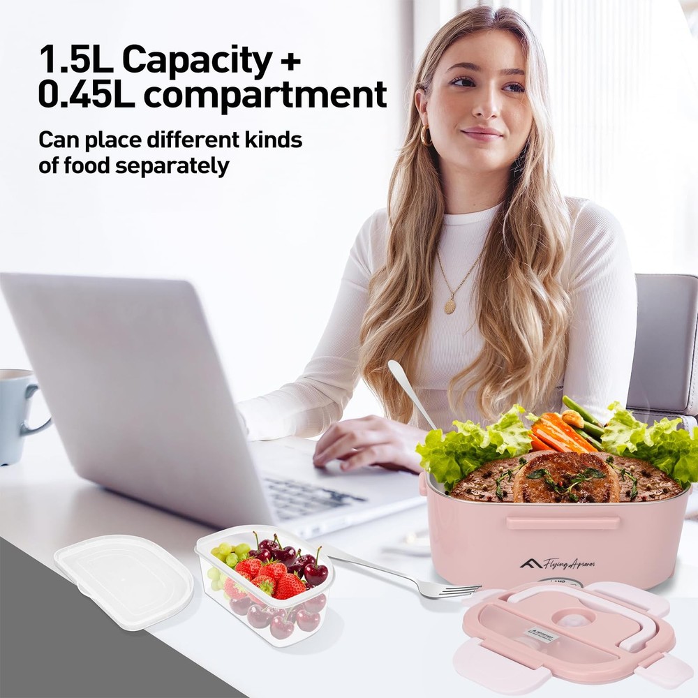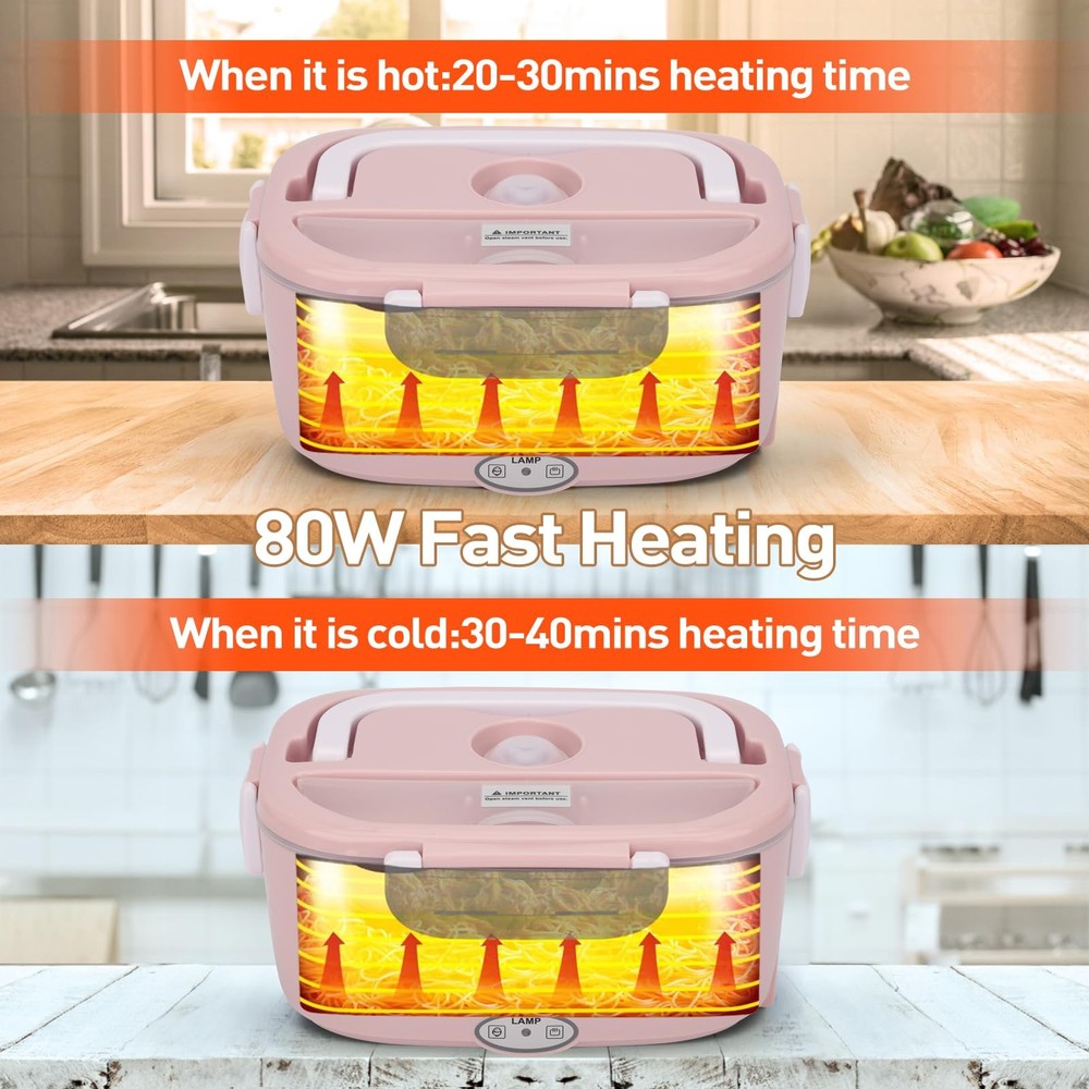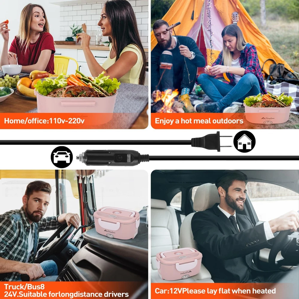 Our heated lunch box is made of food-grade PP material and 304 food-grade stainless steel, corrosion-resistant and oxygen-resistant, with improved heat preservation, and the bottom of the heater is designed with an aluminum plate, which ensures even heating by circulating the heat. The electric heated lunch box includes a 1.5L large capacity stainless steel inner tray, a complimentary divider and stainless steel knife and fork, the electric lunch box adds a four-sided locking mechanism to ensure the sealing of the lunch box, and the lid is equipped with an anti-scald handle and stainless steel cutlery built-in storage slot. Heating time is 15-30 minutes, a huge time saver. >>>đA Small USA Businessđ<<< >>> đ Unique Ingeniously Designed by APSARAS USA LLC In Compliance with E.U and F.D.A Standards. đ <<< â ăHIGH-QUALITY MATERIALlăApsara electric lunch box is made from high-quality food grade stainless steel and PP plastic. All electrical components, including charging cables, comply with E.U safety standards, which are more stringent than those in the U.S. The stainless-steel container can be easily cleaned by hand or placed in the dishwasher to save time. The heating base and lid are not dishwasher-safe but can easily be wiped clean. â ă3 in1 LUNCH HEATER ăThe Apsaras electric lunch box/food heater supports 110v, 12v, and 24V power heating, allowing you to conveniently heat your meals at home, in the office, or on the go-whether in your car or truck. It provides constant heating while plugged in, eliminating the need to search for a microwave or wait in line to heat your lunch. â ă60-80W FAST HEATINGăThe Apsaras electric lunch box uses PTC constant temperature heating technology and low-consumption heat cycle to maintain food at an idea temperature in 20-30 minutes while preserving its moisture. It operates silently, with no water vapor release or odor. With this enhanced feature, you can experience more efficient heating, ensuring your meals are ready in no time. Say goodbye to cold sandwiches or fast food â now you can enjoy a hot, homemade meal anytime and anywhere. â ăLEAK-PROOF DESIGNăApsaras electric lunch box food heater features a four-side locking clasps that securely stabilize the inner base, preventing spills and ensuring a firm hold. The lid is designed with an anti-scald handle for safe handling, and it includes built-in storage for stainless steel cutlery. Perfect for office workers and construction professionals, it keeps soups and sauces, allowing you to enjoy a mess-free, warm meal. â ăLARGE CAPACITYăApsaras electric lunch box comes with a 1.5L capacity stainless steel food container and a 0.45L food-grade plastic compartment, providing a perfect capacity to pack a full meal for you or your loved ones. â ăGRAB-and-GO CARRY HANDLEăApsara electric lunch box features a built- in, sturdy carry handle for easy portability. The included insulated carry bag keeps your lunch box clean and fresh while on the go, protecting your food from bad weather, dust and contamination. â ăALL-IN-ONE PACKAGE ăApsaras electric lunch box comes with one heating base, one stainless steel container, one plastic divder box, one insulated carry bag, one set of stainless steel fork and spoon, one car power cord, one office/home power cord and one instruction manual. All this in one package ensures the lunch box is ready to use from day one. â Apsaras USA a small USA Business that believes in providing customers with the best-quality products. If you find that the lunch box cannot be heated or has any other issues after receiving it, feel free to contact us. We offer a 30-day money-back guarantee and a 12-month replacement warranty.