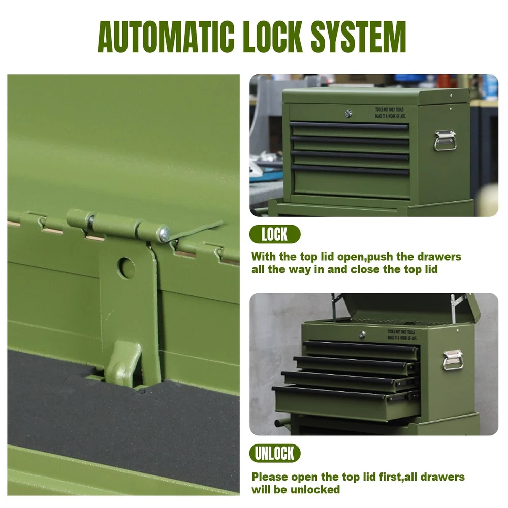2-IN-1 STACKABLE DESIGN: Benefit from a versatile and space-saving structure with our detachable top toolbox. It's designed for both easy stacking and storage making workspace organization a breeze. SPACIOUS & ORGANIZED STORAGE: Our tool chest is thoughtfully designed with 6 spacious drawers, a generous cabinet, and 4 removable hooks. Every tool finds its place, ensuring a clutter-free and organized work environment. ADVANCED LOCKING MECHANSIEM FOR SECURITY: The top toolbox secures the four drawers and the lid, providing dual-layer protection for your tools. SMOOTH MOBILITY & CONVENIENT HANDLING: Transporting your tools has never been easier. With four durable rubber casters—two of which are lockable—you can maneuver with ease. Plus, the ergonomic handle design adds an extra layer of convenience. ROBUST CONSTRUCTION FOR LONGEVITY: Built for durability, our tool chest is crafted from high-quality, rust-resistant steel. It's not only designed to look good but also to withstand a weight capacity of up to 200 lbs, promising years of reliable service.