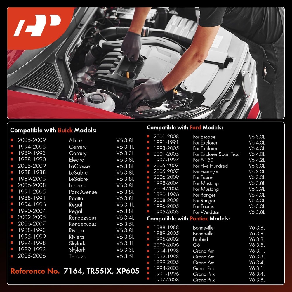 A-Premium 6PCS Iridium Platinum Spark Plugs Compatible with Buick, Chevrolet, Ford, GMC & Mazda Vehicles - Regal, Equinox, Impala, Ranger, Sierra, Tribute - 1988-2008, 3.1L-4.3L Description Features: [Vehicle Fitment-1]: Compatible with Chevrolet Astro 1996-2005 V6 4.3L, Beretta 1994-1996 V6 3.1L, Blazer 1996-2005 V6 4.3L, C1500 1996-1998 V6 4.3L, Camaro 1995-2002 V6 3.8L, Corsica 1994-1996 V6 3.1L, Equinox 2005-2009 V6 3.4L, Express 1500 1996-2014 V6 4.3L, Express 2500 1996-2006 V6 4.3L, Impala 2000-2005 V6 3.4L, Impala 2000-2005 V6 3.8L, K1500 1996-1998 V6 4.3L, Malibu 1997-2003 V6 3.1L, Malibu 2004-2006 V6 3.5L, Monte Carlo 1995-1999 V6 3.1L [Vehicle Fitment-2]: Compatible with Buick Allure 2005-2009 V6 3.8L, Century 1994-2005 V6 3.1L, Century 1989-1993 V6 3.3L, Electra 1988-1990 V6 3.8L, LaCrosse 1988-2009 V6 3.8L, Lucerne 2006-2008 V6 3.8L, Park Avenue 1991-2005 V6 3.8L, Reatta 1988-2004 V6 3.8L, Regal 1994-1996 V6 3.1L, Rendezvous 2002-2005 V6 3.4L, Rendezvous 2006-2007 V6 3.5L, Riviera 1988-1999 V6 3.8L, Skylark 1994-1998 V6 3.1L, Skylark 1989-1993 V6 3.3L, Terraza 2005-2006 V6 3.5L [Vehicle Fitment-3]: Compatible with Ford Escape 2001-2008 V6 3.0L, Explorer 1991-1991 V6 4.0L, Explorer 1993-2005 V6 4.0L, Explorer Sport Trac 2001-2005 V6 4.0L, F-150 1997-1997 V6 4.2L, Five Hundred 2005-2007 V6 3.0L, Freestyle 2005-2007 V6 3.0L, Fusion 2006-2009 V6 3.0L, Mustang 1998-2004 V6 3.8L, Mustang 2004-2004 V6 3.9L, Ranger 1990-1996 V6 4.0L, Ranger 2008-2008 V6 4.0L, Taurus 1996-2005 V6 3.0L, Windstar 1995-2003 V6 3.8L [Vehicle Fitment-4]: Compatible with GMC C1500 1996-1998 V6 4.3L, Jimmy 1996-2001 V6 4.3L, Jimmy 2003-2005 V6 4.3L, Sierra 1500 1999-2013 V6 4.3L, Sonoma 1996-2004 V6 4.3L; Compatible with Lincoln LS 2000-2005 V6 3.0L; Compatible with Mazda Tribute 2001-2006 V6 3.0L, Tribute 2008-2008 V6 3.0L; Compatible with Mercury Sable 1996-2005 V6 3.0L; Compatible with Oldsmobile Aurora 2001-2002 V6 3.5L Product Details: Handling We will ship all orders within 1 business day of payment. Delivery We Do Not Ship Outside of the Continental US. Return Policy All items qualify for returns within 30 days of receipt. Buyer is responsible for return shipping on any item that is not damaged. Feedback We take our reputation seriously, we buy and sell online, so we understand the value of trust. If you are unsatisfied with your order, please contact us and we will work with you to resolve it to your satisfaction.
