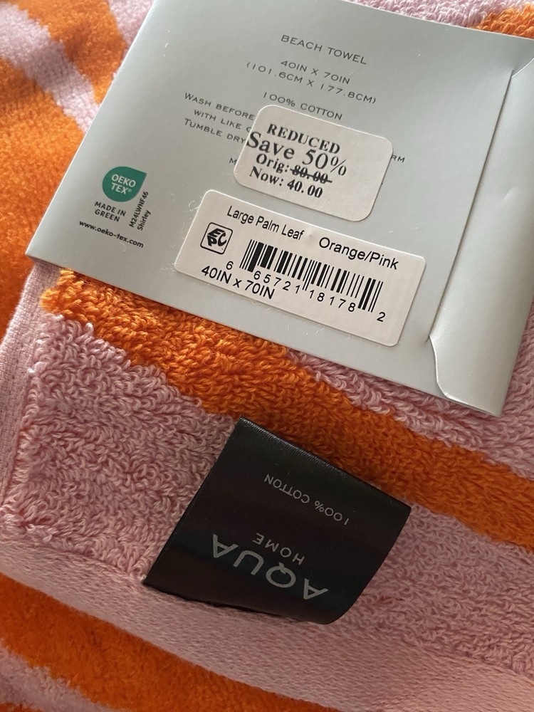 WELCOME TO SHARPOSH BRAND : AQUA COLOR: ORANGE/ PINK PATTERN LARGE PALM LEAF SIZE 40 in x 70 in MATERIAL 100 % COTTON
