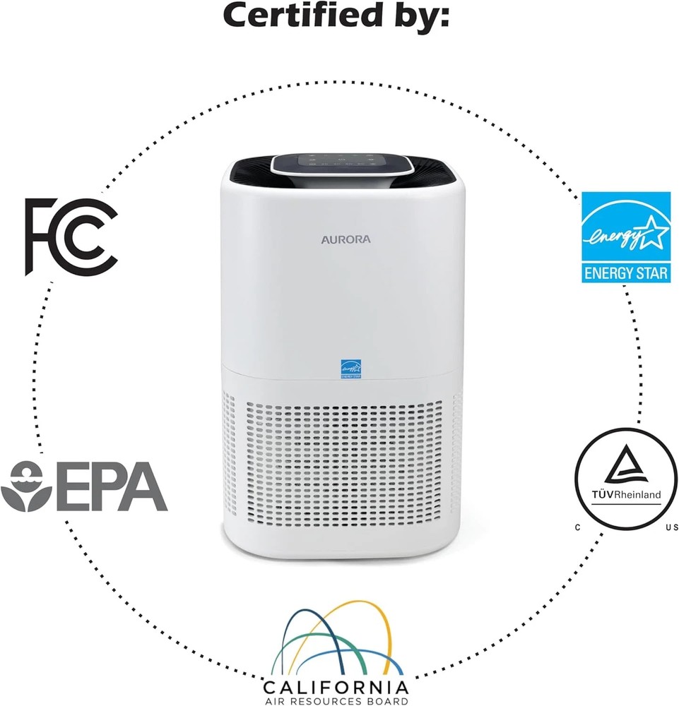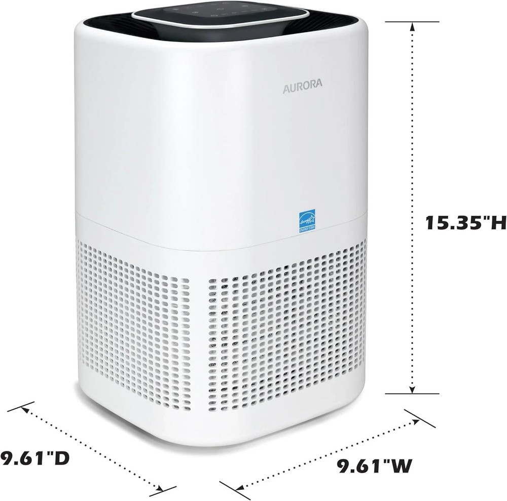 AR100W Air Purifier for Mold, Smoke, Dust, Odors, Pollen, Allergens, and Germs w Product Description: Aurora AR100W air purifier is ideal for home/office use to circulate the air per hour in rooms up to 1,100 square feet and reduces up to 99.97% of mold, smoke, dust, odors, pollen, allergens, and germs as small as 0.3 microns from the air. To breathe cleaner air easily and safely with Aurora’s AR100W Air Purifier which has a CADR up to 142 CFM / 241 m³/h and can purify the air of a 1,100 ft² space once/hour. Aurora AR100W air purifier is certified by Energy Star / FCC / TUV / CARB / EPA. Product Dimension: 9.61"D x 9.61"W x 15.35"H Item Weight: 6.83 pounds Shipping Weight: 8.25 pounds Item Model Number: AR100W About this item Quick Circulation Rate: With CADR 142 CFM / 241 m³/h, Aurora air purifier can purify the air 5x per hour in 220 ft² and a 1,100 ft² space once/hour. Perfect for small to medium-sized rooms such as bedroom, nursery, study, living room, and office area. 3-stage filter safely removes 99.97% of airborne particles as small as 0.3 microns, including mold, allergens, germs, dust, pet dander, pollen, odors, and cigarette smoke. Quiet Operation: Operates as low as 24 dB in sleep mode and light off function to help create a peaceful and relaxing environment. User-Friendly Touch Control Panel: 7 touch screen buttons with on/off, fan speed setting, timer setting, sleep mode, light off, display lock, and filter replacement indicator. Tested and Trusted: Certified by Energy Star / FCC / TUV / CARB / EPA. Easy Replacements: Filter Replacement Aurora AR10F. Product information Color White Brand Aurora Product Dimensions 9.61"D x 9.61"W x 15.35"H Floor Area 1100 Square Feet Specification Met CARB Certified, EPA Certified, Energy Star Certified, FCC Certified Noise Level 24 Decibels Particle Retention Size 0.3 Micron Controller Type Touch Control UPC 038572231003 Special Feature Energy Star certified, FCC / TUV / CARB / EPA Certified, Quiet Operation Manufacturer Aurora Filter Class H13 True HEPA Item Weight 6.8 pounds ASIN B0CV4KLHTV Item model number AR100W Assembly required No Number of pieces 1 Batteries required No Included Components Air Purifier Color White Brand Aurora Product Dimensions 9.61"D x 9.61"W x 15.35"H Power Source AC Item Weight 6.8 Pounds