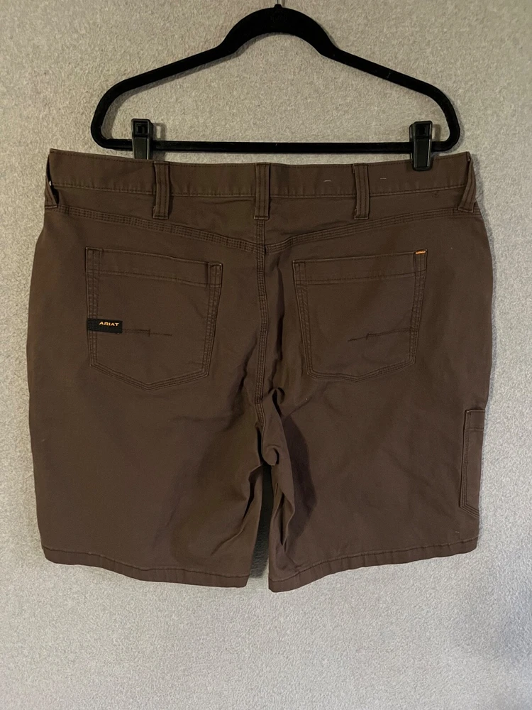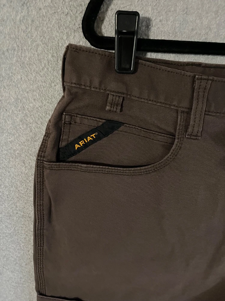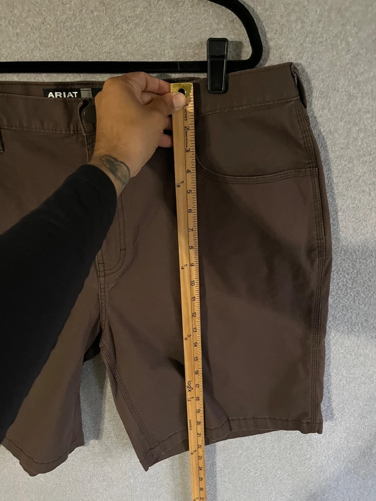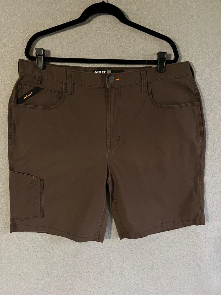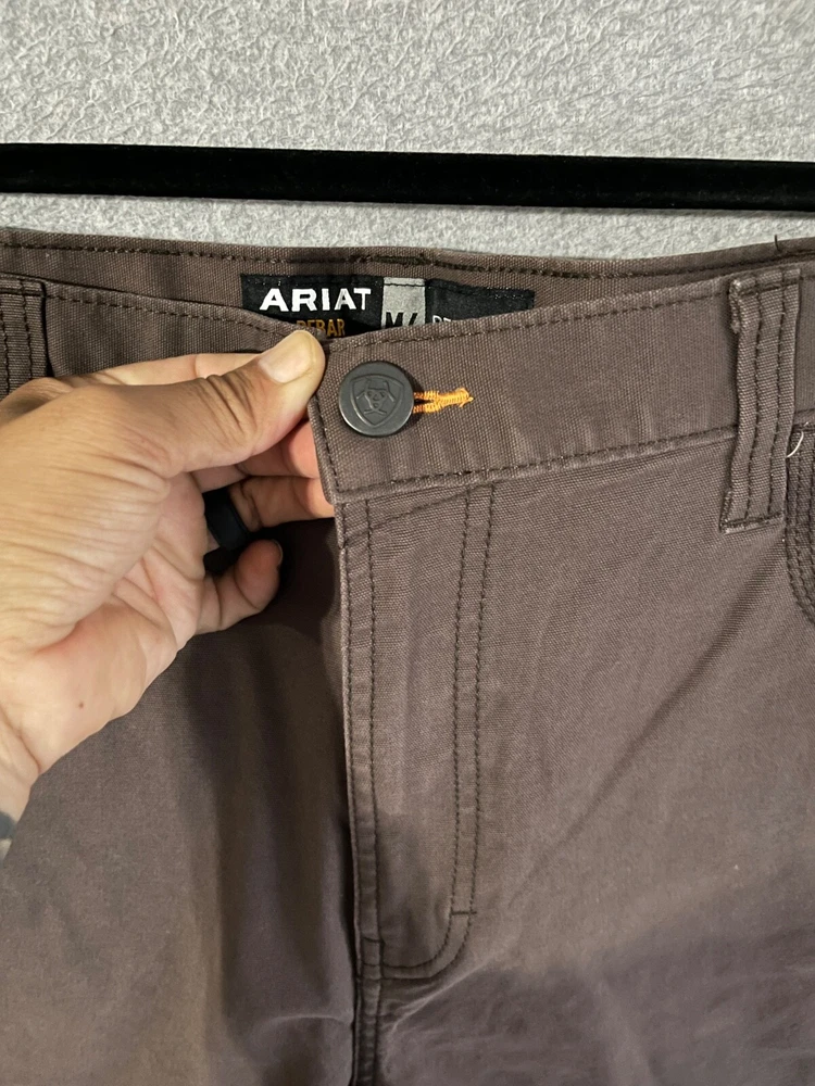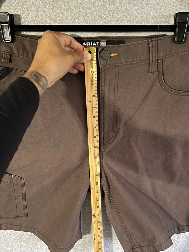 Occasion: Casual, Travel, Workwear Material: Cotton, Cotton Blend, Spandex Handmade: No Rise: High (Greater than 12 in) Fit: Relaxed Brand: Ariat Personalize: No Vintage: No Theme: American, Cowboy, Outdoor Style: Cargo Pattern: Solid Garment Care: Machine Washable Waist Size: 40 in Front Type: Flat Front Size: 40 Inseam: 9 in Pocket Type: Cargo Pocket Closure: Button Size Type: Regular Department: Men Accents: Button, Logo, Zipper Fabric Wash: Dark Fabric Type: Canvas Features: Easy Care, Pockets, Stretch Season: Fall, Spring, Summer Color: Brown