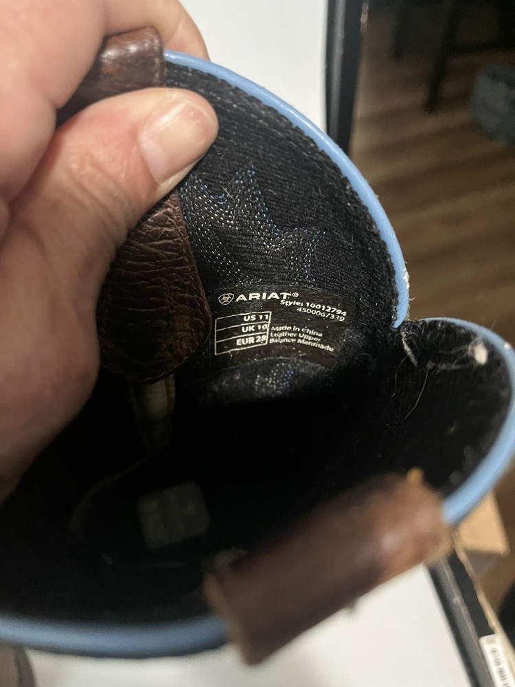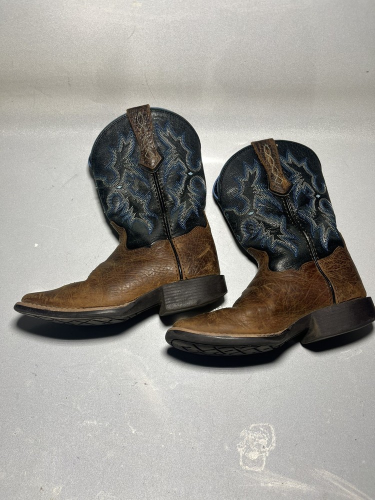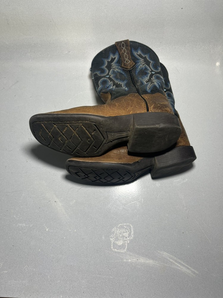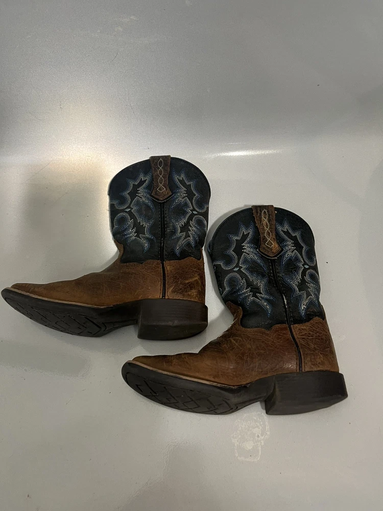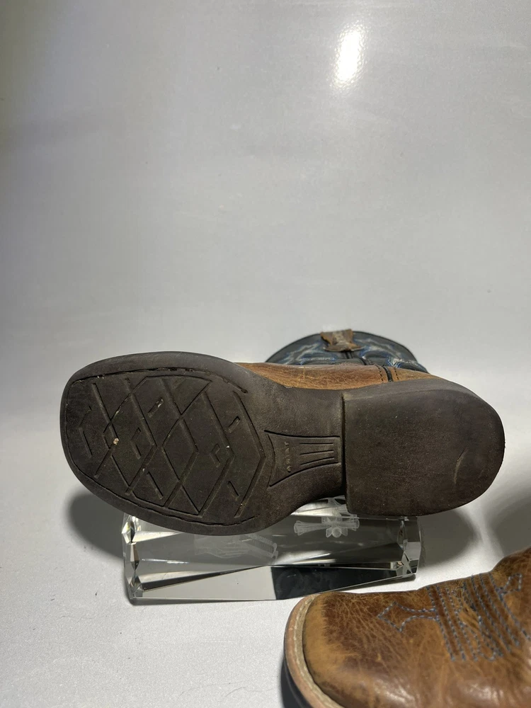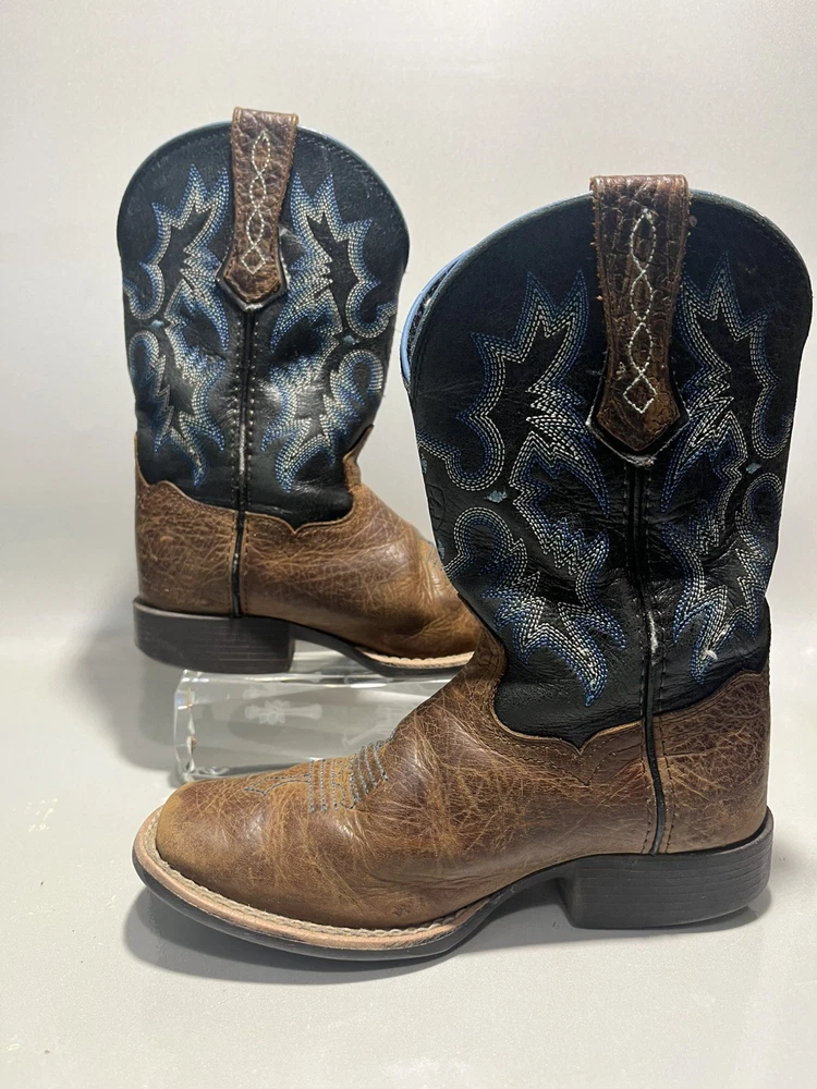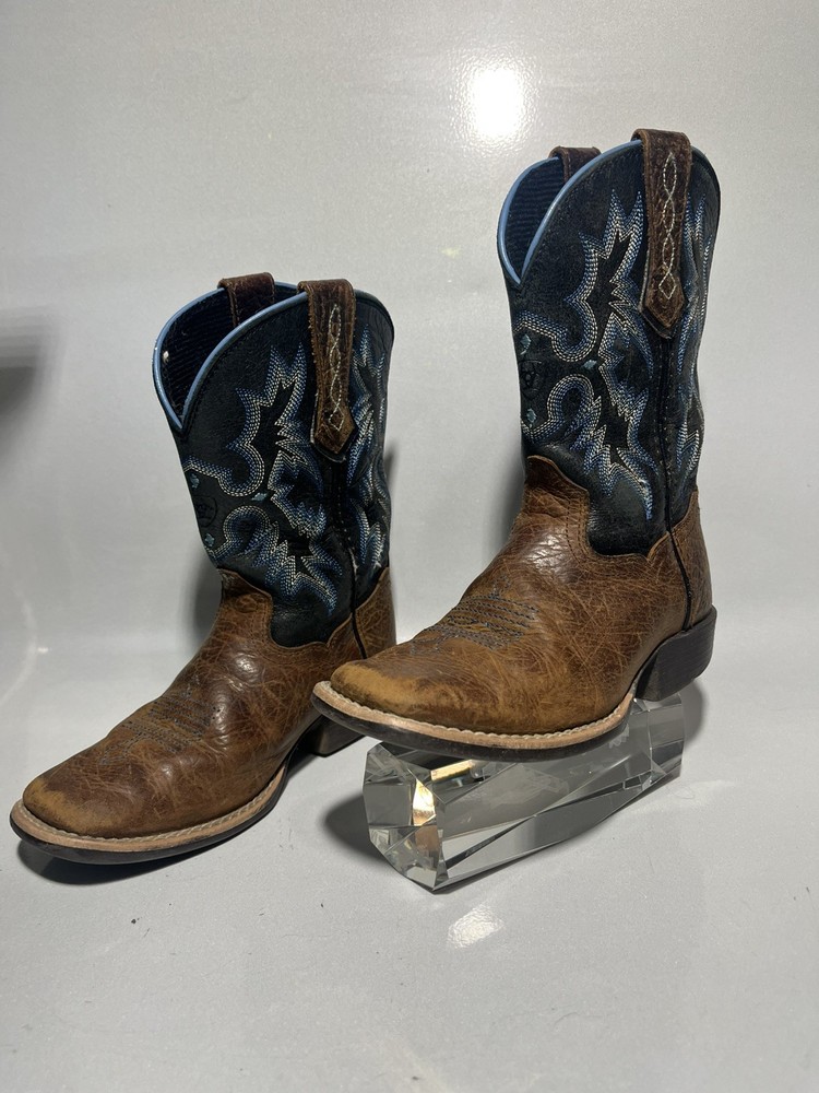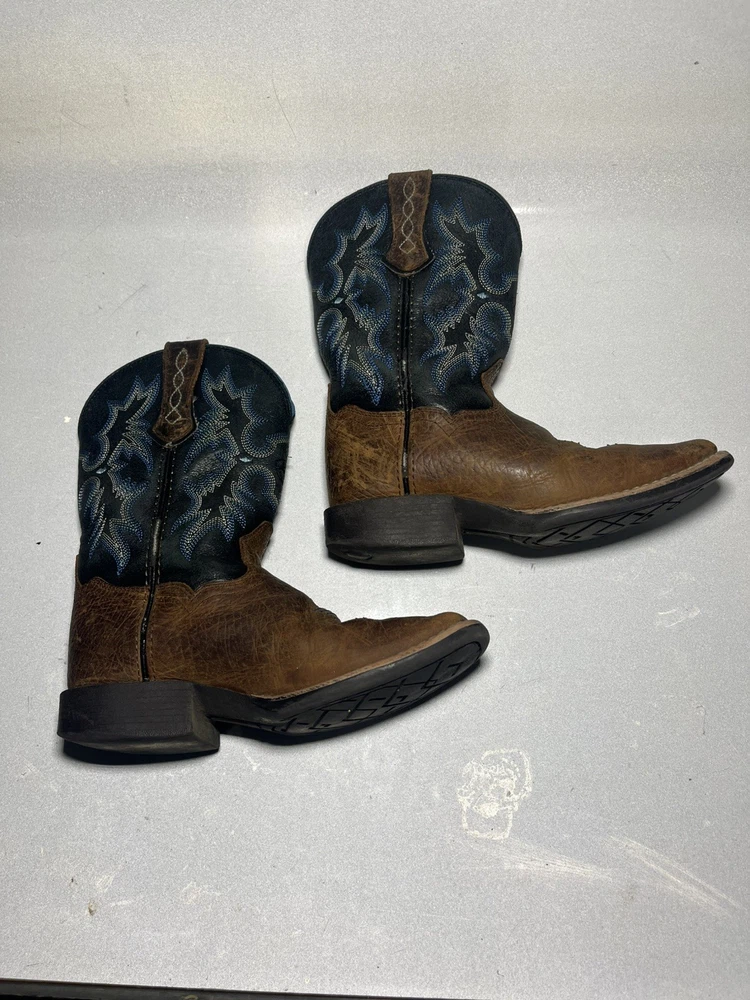 The ARIAT Tombstone Boys Youth Boots are stylish and durable footwear for young individuals. With a square toe shape and made from leather, these boots offer both protection and a fashionable look. The brown color and black/blue accents add a trendy touch, making them versatile for various outfits. Designed for boys in mind, these boots are perfect for everyday wear or special occasions. Made by the reputable brand Ariat, these boots are sure to provide comfort and support for active kids.