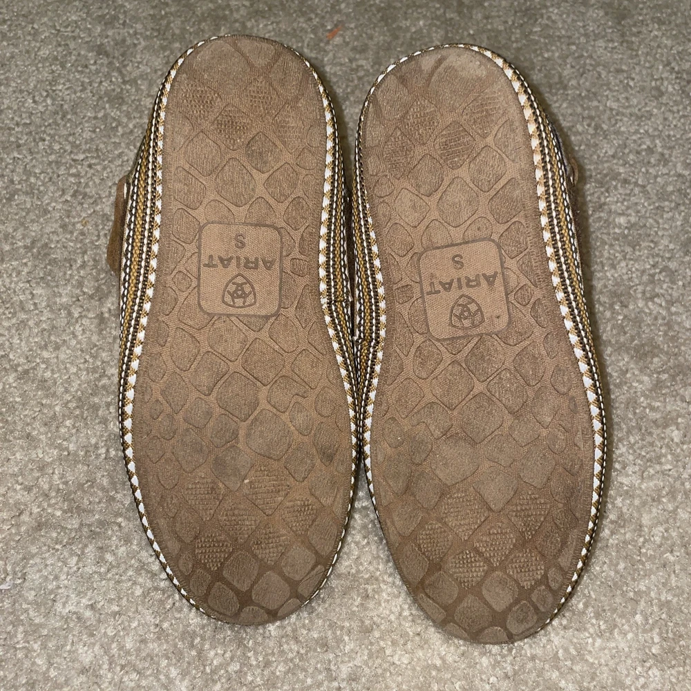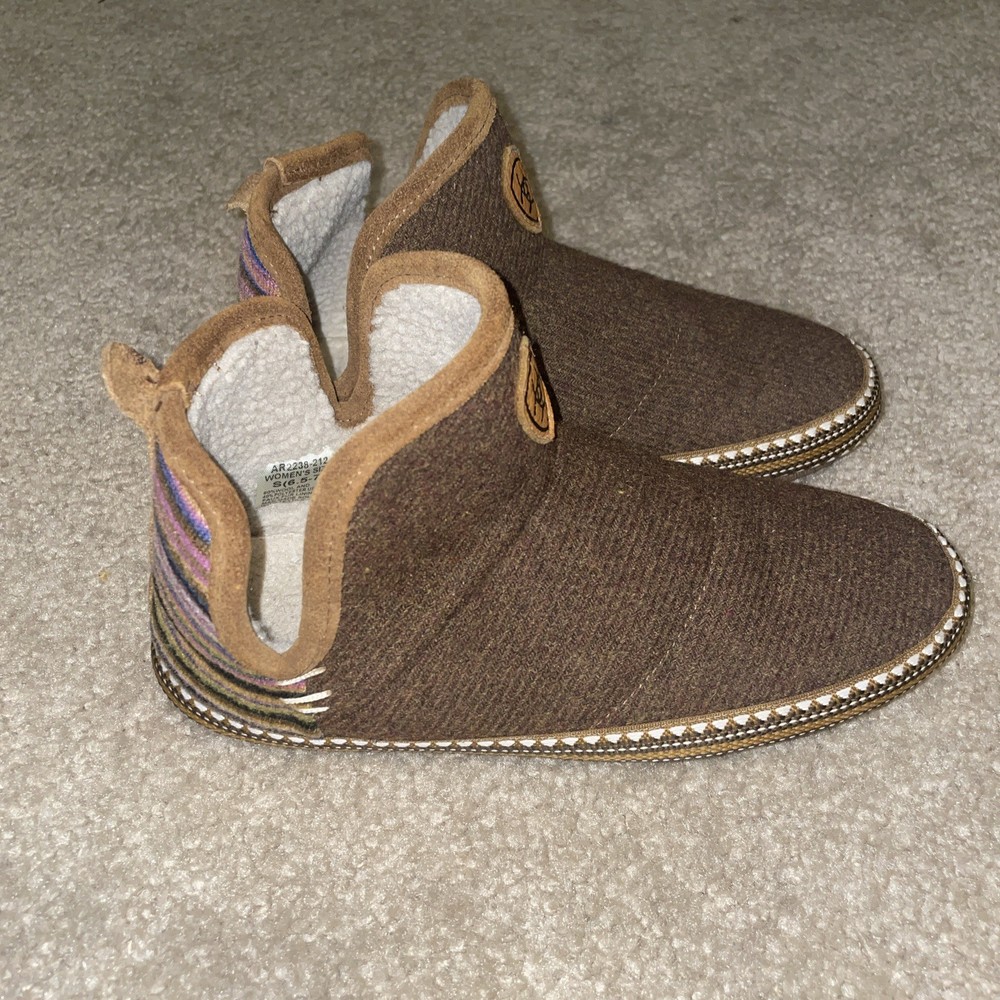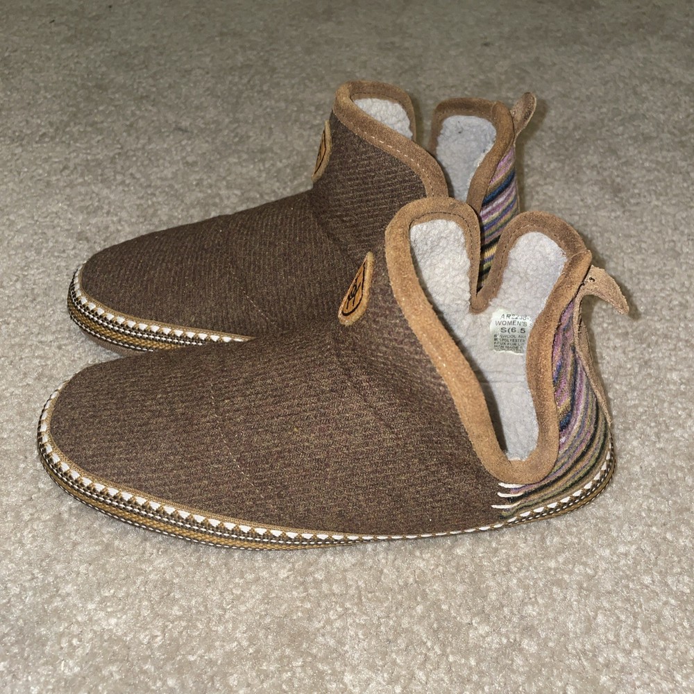 The product is a pair of ARIAT Women's wool blend booties slippers in size small (6.5-7). These slippers are designed with a fleece lining for added warmth and comfort. Made with wool as the upper material and a brown color, these booties offer both style and functionality for women looking for cozy yet stylish footwear. Perfect for lounging or running quick errands, these slippers are a versatile addition to any woman's wardrobe.
