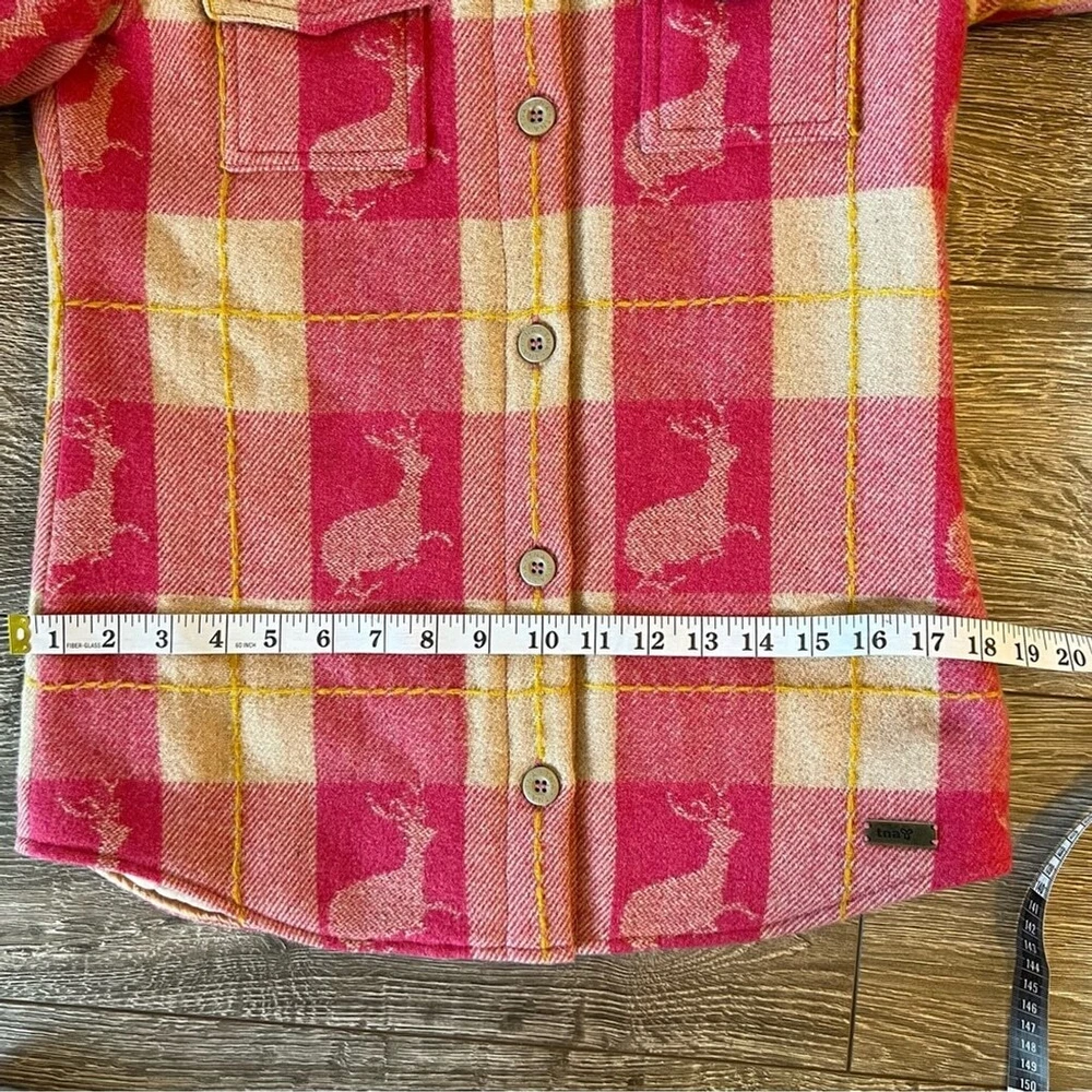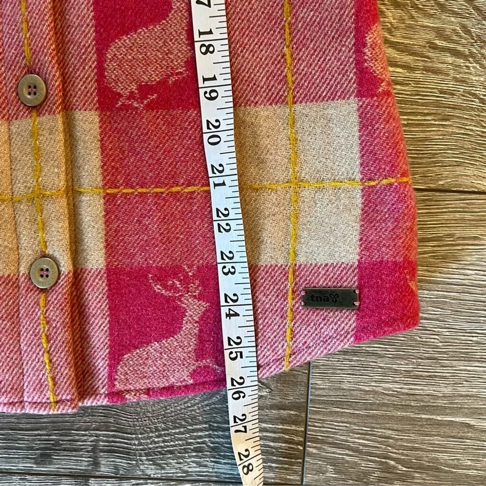 TNA Pink Plaid & Reindeer Quilt Lined Wool Blend Shacket - Aritzia Fashion, Made in Canada Get your pink on with this cozy and stylish TNA wool blend shacket from Aritzia! Featuring a charming pink plaid pattern and a unique reindeer quilted lining, this shacket is perfect for layering and making a statement. • Button-down closure • Square chest pockets • Made in Canada • Soft, not itchy (70% wool, 30% polyester) • Acetate quilted lining for extra warmth • Size: Extra small Measurements (laid flat): • Pit to pit: 17” • Hip: 18” • Shoulder to hem: 26” Fits my size 4 mannequin perfectly. May also be suitable for a size 2 or a size 6. Know your measurements. Condition: Excellent used condition (EUC), like new. Care: Dry cleaning recommended for longevity. From a pet-free, smoke-free home. X-posted. Questions and offers welcome! I also offer great bundle deals.