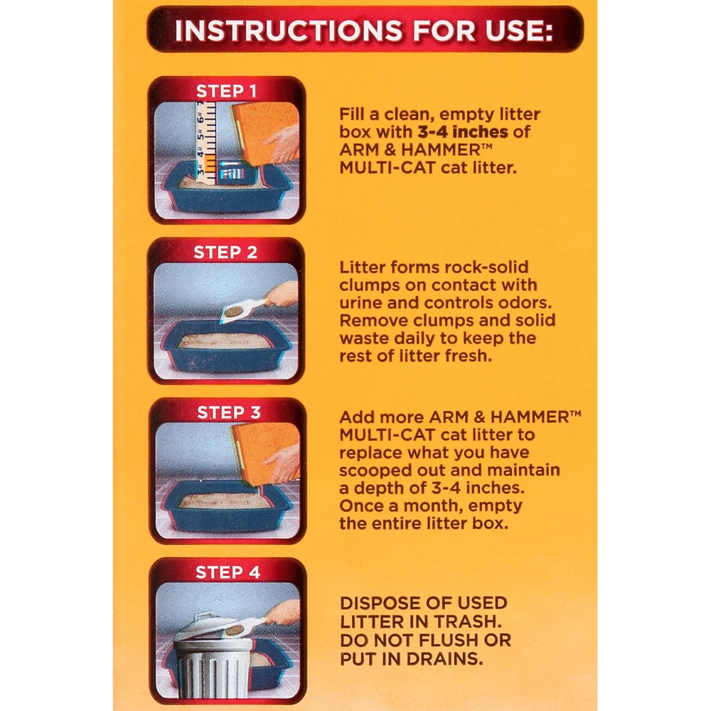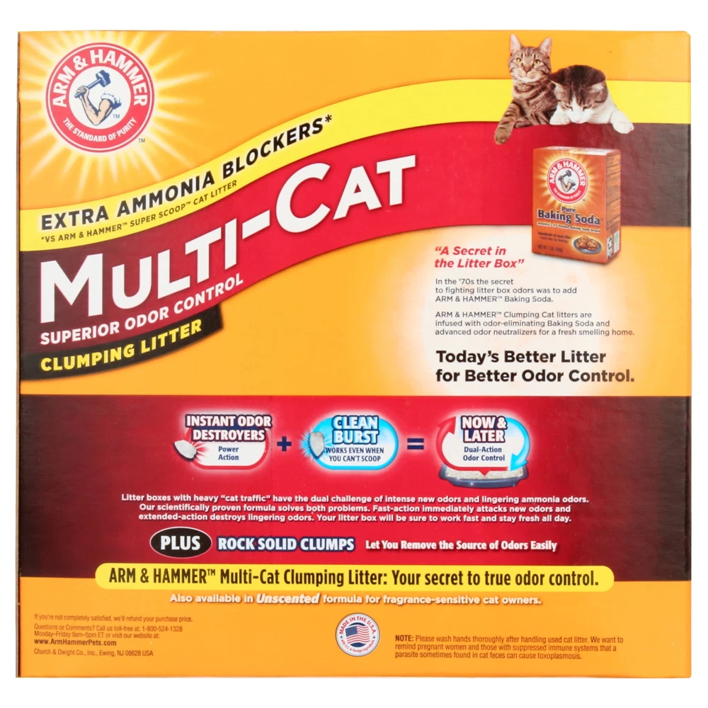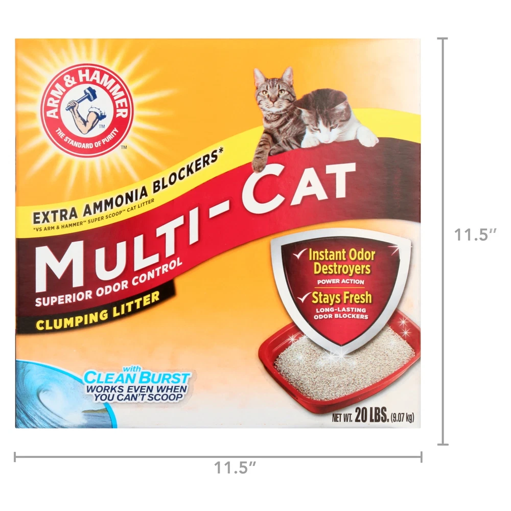 ARM & HAMMER Multi-Cat Clean Burst clumping scented litter has a fresh and clean scent that helps refresh litter with every scoop. This cat litter combines powerful ammonia neutralizers and baking soda crystals to eliminate the toughest odors. It provides hard clumping for easy scooping, in a formula that’s 99.9% dust-free and low tracking. Clean Burst formula works even when you can't scoop to keep your home smelling fresh and clean Combines powerful baking soda crystals with ammonia odor neutralizers to eliminate the toughest odors on contact, specially designed for homes with multiple cats Hard clumps let you remove the source of odors easily from your cats’ litter. Formula is 99.9% dust free, low tracking and extra strength for multiple cat households! Fresh Scent Refreshes Litter Every Time Your Cat Uses The Litter Box, Also Available in Unscented! Made with odor absorbing clay to neutralize litter box odors