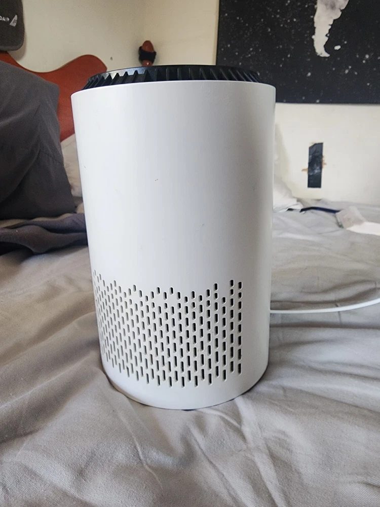 The AROEVE Air Purifier is designed for bedrooms, capturing contaminants like pollen. It has a compact size of 6.1"D x 6.1"W x 9.7"H and weighs 3 pounds. The filter is designed for controlling smoke, pollen, dander, and hair, making it ideal for a room of 287 square feet. The product is manufactured by AROEVE and meets CARB certification standards.