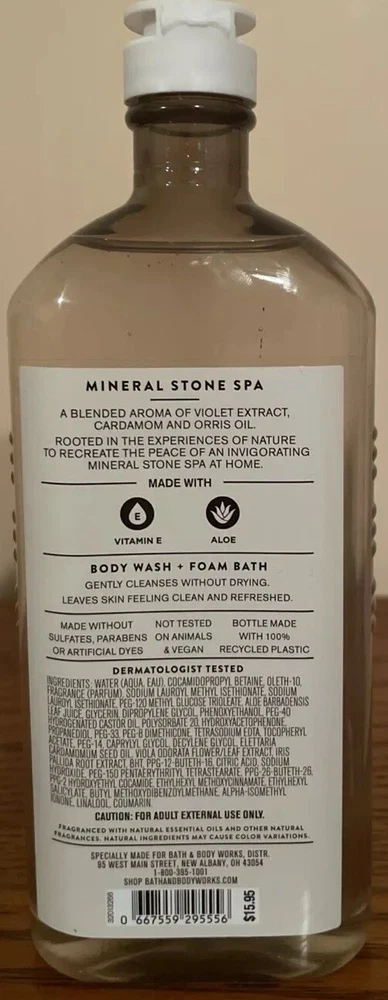UPC:0667559295556gtin13:0667559295556Brand:Bath & Body WorksSize:RegularScent:Violet,cardamom,orris OilVolume:10 fl ozBody Area:BodyType:Body Wash + Foam BathFormulation:FoamCountry/Region of Manufacture:United States