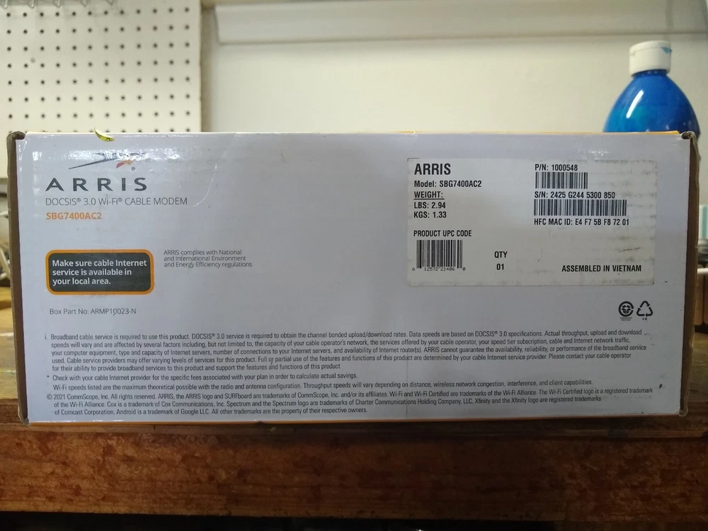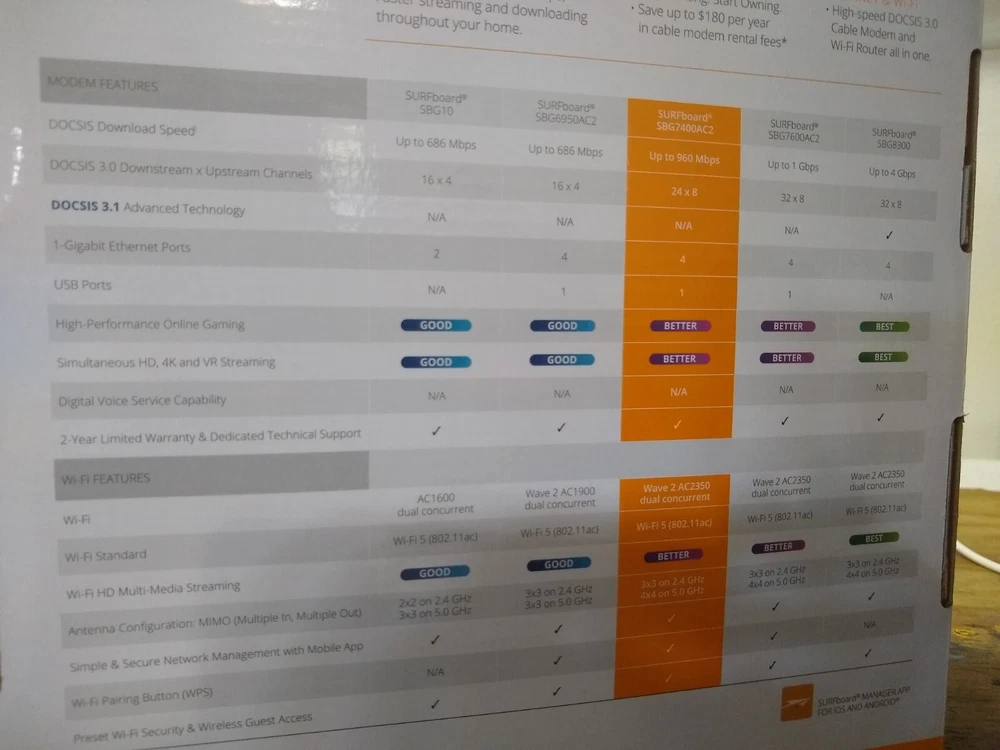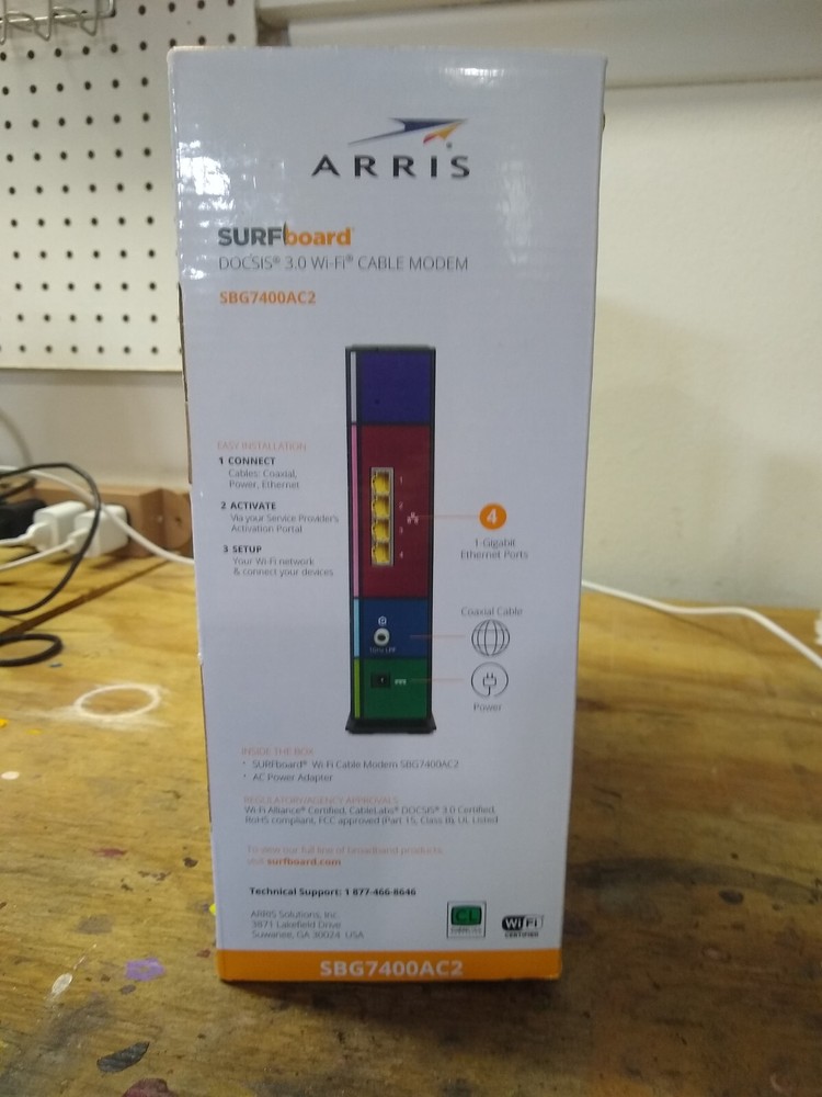 The ARRIS SURFboard 2350 Mbps 4 Port 10000 Mbps Cable Modem and Wi-Fi Router is a high-speed networking device designed for home use. With a maximum LAN data rate of 1000 Mbps and a maximum wireless data rate of 2350 Mbps, this modem and router provide fast and reliable internet connectivity for various devices such as gaming consoles, audio receivers, PCs, television sets, and iPods. The unit features four LAN ports and wireless connectivity with Wi-Fi 802.11ac, making it suitable for gaming and other bandwidth-intensive activities. With a sleek black color and compact dimensions, the ARRIS SURFboard is a versatile and efficient networking solution for modern households.