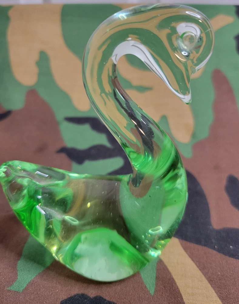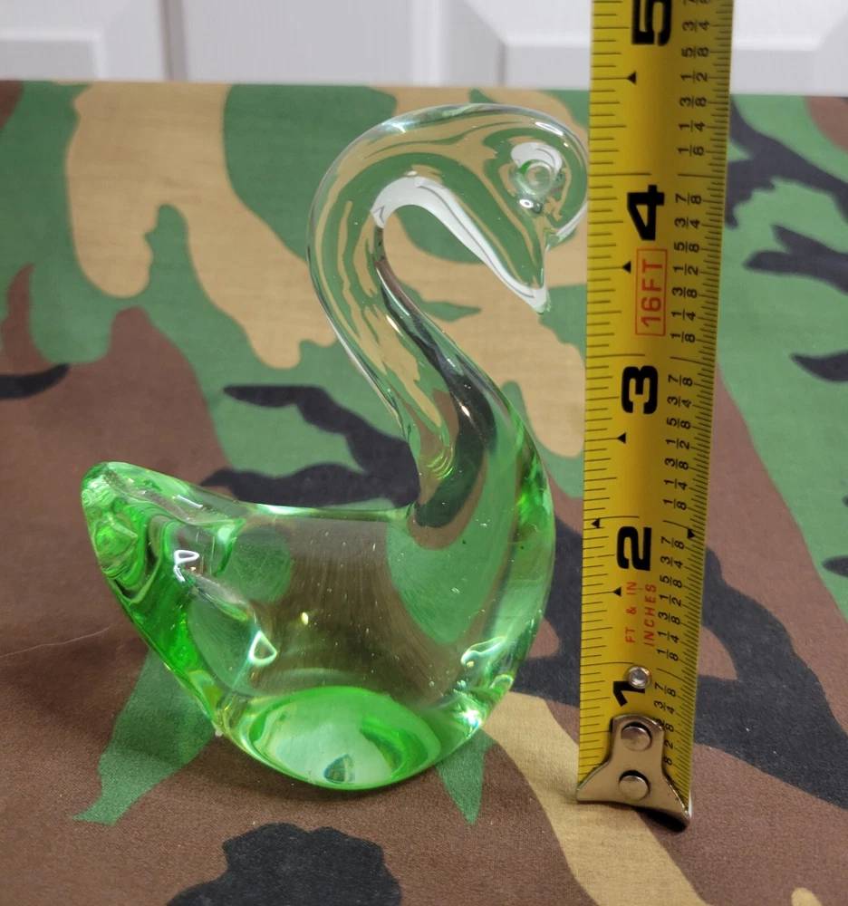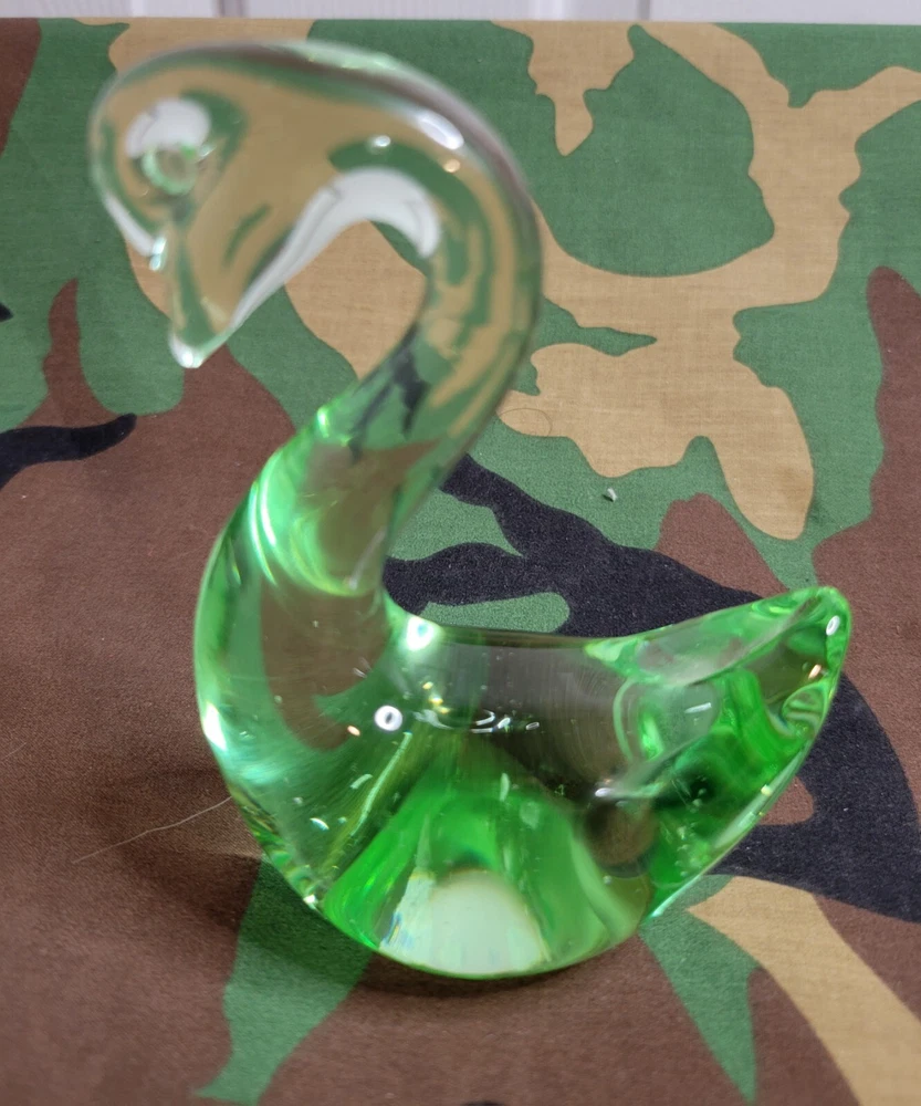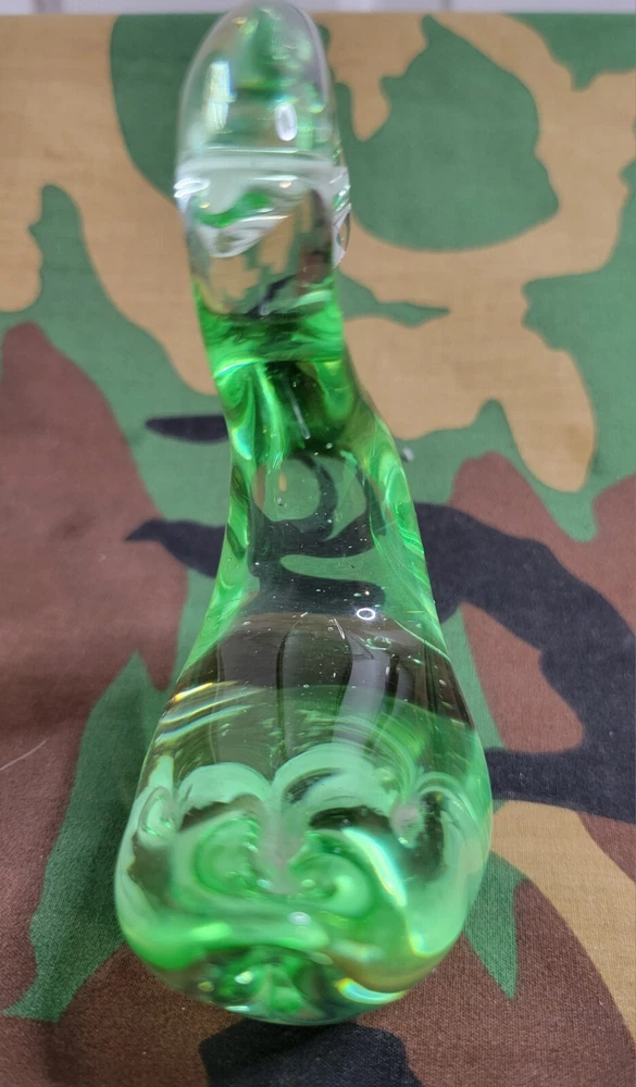This beautiful art glass paperweight features a stunning green swan design, perfect for any collector or lover of birds. The expert craftsmanship and attention to detail make this piece a must-have. The glass material adds a touch of elegance, making it a great addition to any desk or display. The paperweight's country or region of manufacture is unknown, adding to its mystery and charm. Add this unique item to your collection today!