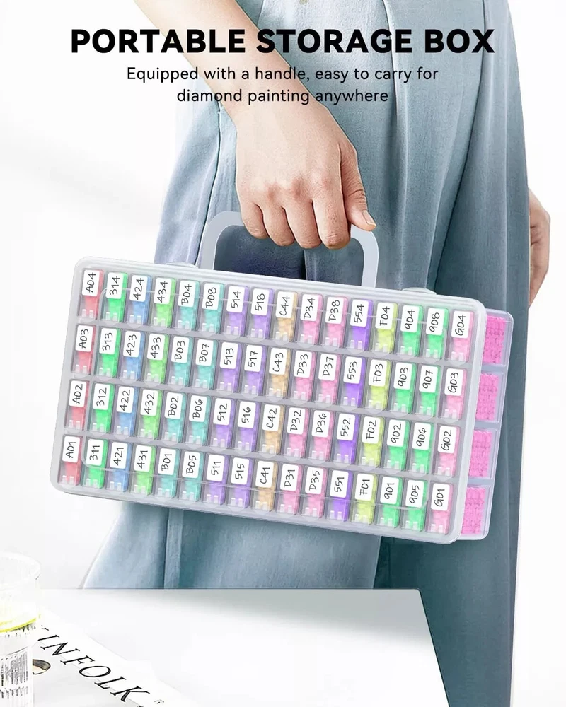 ARTDOT Diamond Painting Storage Containers, Diamond Art Portable Bead Storage Organizer 64 Gird Diamond Painting Accessories (Storage Box) ✓ Free 30 Day Returns ✓ Free Shipping EFFICIENT STORAGE CHOOSE - The storage box comes with 64 transparent containers, reducing clutter and saving space while allowing easy viewing and access to specific items, enhancing your diamond art experience CUSTOM LABEL STICKERS - Includes 192 blank label stickers for easy categorization and identification of items, increasing efficiency and saving time and effort during crafting or organizing tasks VERSATILE STORAGE: Each diamond painting storage bottle has a capacity of 7 grams and can hold about 1400 diamonds or seeds, nail art supplies, buttons, etc, which can meet the storage needs of different craft projects EASY TO CARRY - The lightweight and portable diamond art storage box with a handle helps reduce space usage, whether at home or on the go. You can create and organize your artwork anytime, anywhere. It offers greater convenience and flexibility EXCELLENT VALUE - Obtain high-quality diamond art storage boxes at a lower cost. Effortlessly acquire a premium storage solution that ensures your items are well-protected and organized, meeting all your storage needs