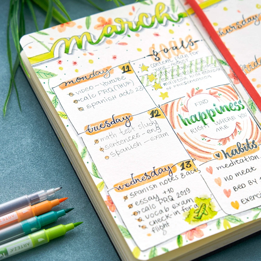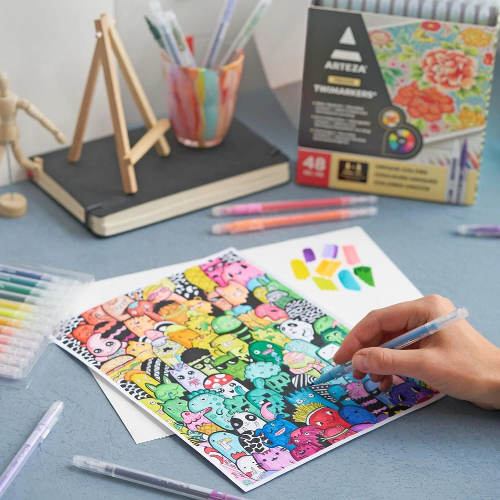 Arteza supplies practical, inspirational art supplies that are safe for all ages, well-designed, easy to use, and stimulate imagination. This 48-color TwiMarker set features 2-sided pens with a fine .4mm nib on one end and a broader, brush tip on the other. One side’s tip is extra-fine for precise lines and intricate details. The fine tip will not bleed through most paper or leave leftover “ghost” markings on the other side. The opposite thicker, angled tip delivers a smooth, flowing style that can mimic watercolor effects with each stroke. This dual tip brush marker can be a daily resource with its fine tip for lists and note-taking while the angled bullet tip is ideal for larger surfaces and more artsy activities. A wide-ranging and vividly colorful set, Arteza offers 48 markers perfect for calligraphy, planners, scrapbooks, posters, and artist decoration on various surfaces. Enhance the workday with these well-made writing utensils convenient for color-coding files, note-taking, and everyday planning. Students utilize them for highlighting, outlining, and writing with detail and clarity. Artists and hobbyists will value the results of hand lettering, coloring, doodling, sketching, and journaling. These dual tip markers is safe for all ages and a fun, useful product for play dates, art projects, and rainy days. The water-based ink dries acid-free and will not streak or smear on any smooth surface. If the ink happens to get on skin, use baby oil, rubbing alcohol, tea tree oil, glass cleaner, or even hairspray or nail polish remover. The markers are quick drying, fade resistant, and comprise a vibrant, crisp color palette that spans the spectrum and sparks creativity. Whether a personal purchase or giving an affordable, thoughtful gift, Arteza offers 48 colors of two-tipped markers to treasure and use again and again. Art supllies made for your creative soul Dual Tip Design: These dual tip brush pens come with a 0.4mm fine tip for intricate details and a broad brush tip for larger areas. Ideal as drawing pens or markers for coloring and calligraphy. Bright and Vibrant Colors: This set includes 48 coloring markers that deliver eye-catching content. Every marker is labeled with the name and color number on the barrel for easy identification. Ideal for Artists: Designed specifically for artists, these dual tip pens feature rich pigments and smooth water-based ink for enhanced coloring sessions. They will elevate your creative experience. Versatile Use: Whether you're sketching, coloring, journaling, or lettering, dual tip markers offer the flexibility and convenience you need. Use these coloring pens to create stunning artworks. Inspire and Be Inspired: Arteza art markers make a wonderful gift for beginners and professional artists to unleash their imagination and bring artistic visions to life.
