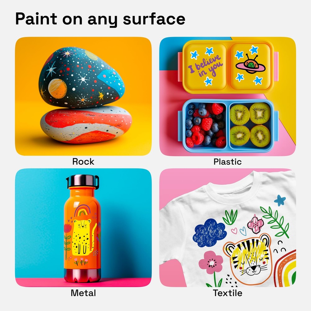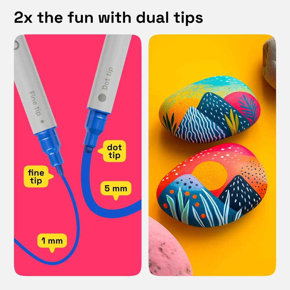 ARTISTRO 12 Acrylic Paint Pens, Acrylic Paint Markers,Fabric Markers for Textile Dual Tip Acrylic Paint Pens with Fine and Dot Tips – Each pen is equipped with a 1-5 mm dot tip for filling large areas and bold points, and a 1 mm fine tip for detailed work. Ideal for versatile use, whether it’s precision or bold color application you need. Pre-Activated Cotton Nibs for Immediate Use – No shaking or pressing required. These acrylic paint markers come ready with pre-activated cotton nibs, allowing you to start creating instantly with quick-drying, smudge-resistant ink. 12 Bright, Eye-Catching Colors for Creative Expression – With a palette of 12 vibrant colors, these markers are perfect for DIY projects, cards, scrapbooks, and unique gifts. Mix, layer, and blend for custom shades and effects on every surface. Multi-Surface Acrylic Markers for Any Project – Designed to perform on paper, fabric, wood, metal, glass, rock, and ceramic, these water-based markers provide consistent, fade-resistant results, letting you create with confidence across multiple surfaces. Perfect for Kids & Adults, Beginners & Pros – Whether you’re exploring paint pens for rocks or looking to elevate your artwork, these markers are versatile tools for all ages and skill levels—perfect for kids, hobbyists, and professional artists alike. Convenient Horizontal Storage for Longevity – Store markers horizontally with caps tightly closed to maintain ink quality and flow. This tip ensures your markers are always ready for smooth, vibrant strokes. Shipping We offer FREE shipping on all orders! We ship within Three business days of payment, usually sooner. We use a selection of shipping services such as UPS, FedEx, USPS etc. We only ship to the lower 48 states, no APO/FPO addresses or PO Boxes allowed. Local pickups and combined shipping options are not provided at this time. Return You can return a product for up to 30 days from the date you purchased it. Any product you return must be in the same condition you received it and in the original packaging. Please keep the receipt. Payment We accept payment by any of the payment methods accepted by eBay. Please pay as soon as possible after winning an auction, as that will allow us to post your item to you sooner! Feedback Customer satisfaction is very important to us. If you have any problem with your order, please contact us and we will do our best to make you satisfied. Contact Us If you have any queries, please contact us via ebay. We usually respond within 24 hours on weekdays. Please visit our eBay store to check out other items for sale! Thank you for shopping at our store.