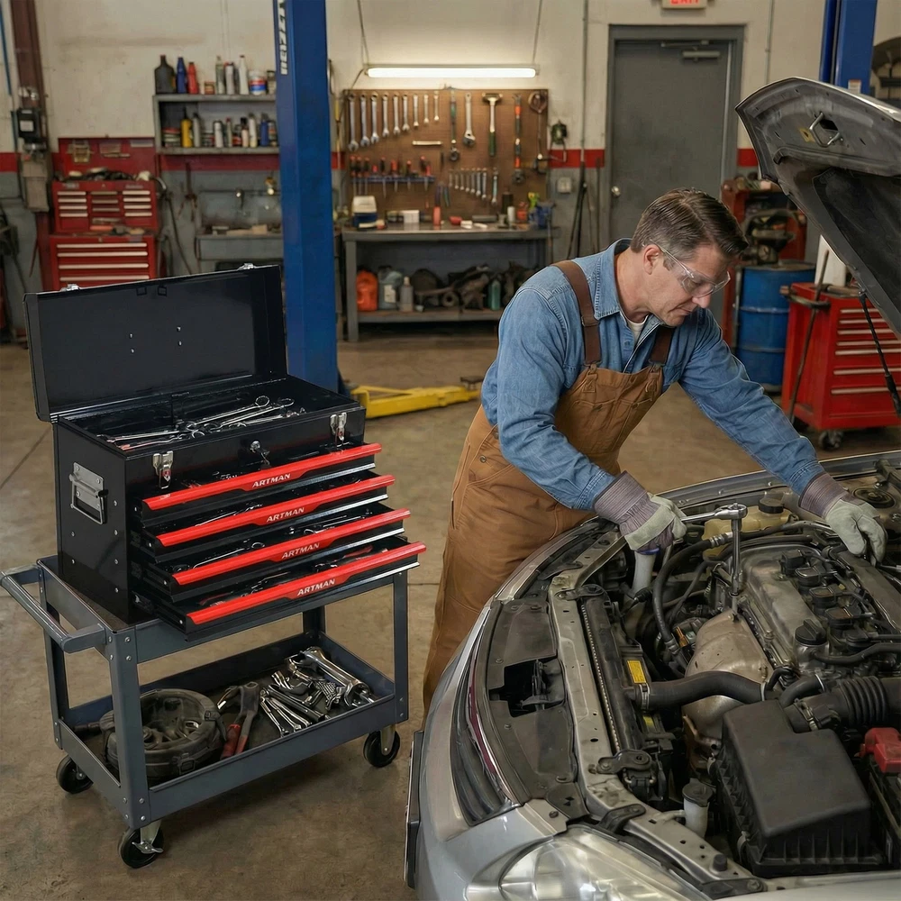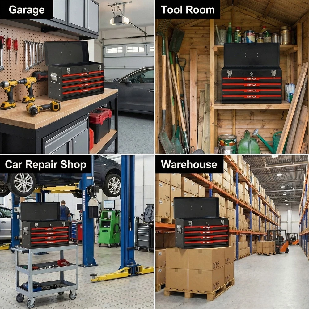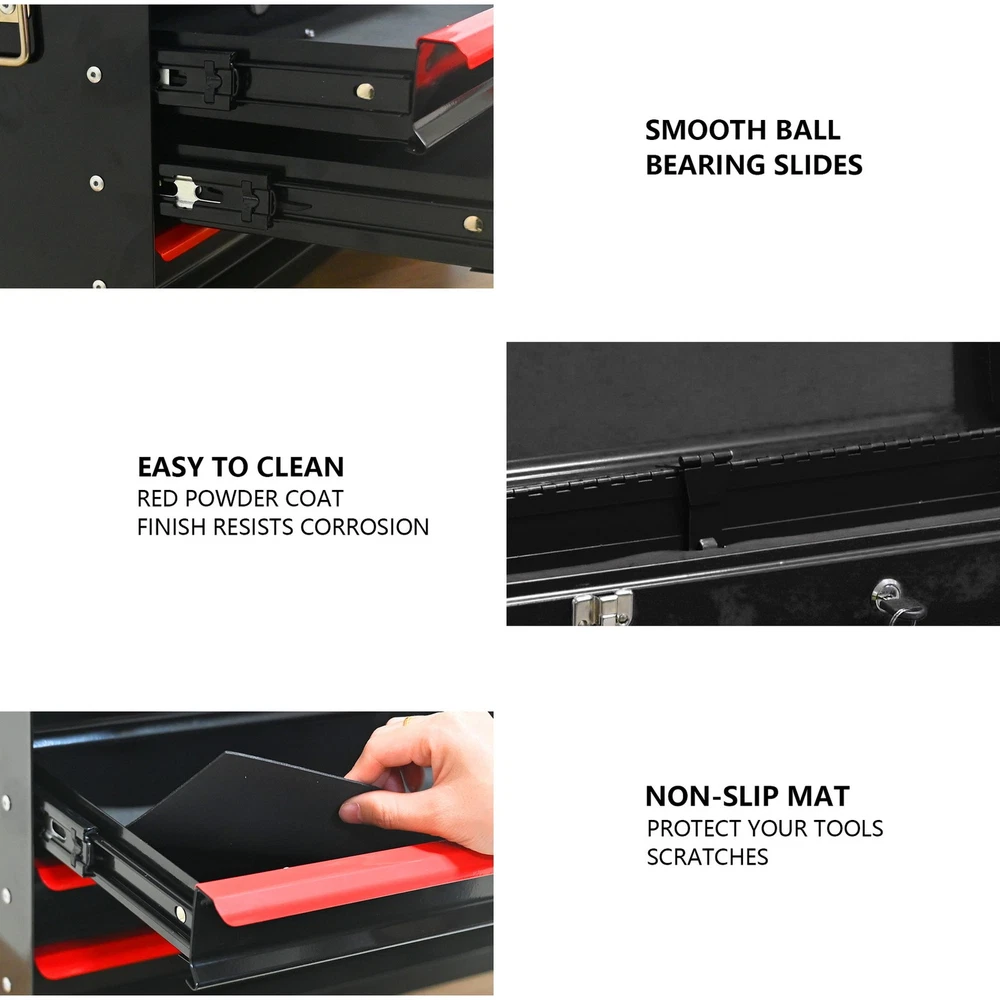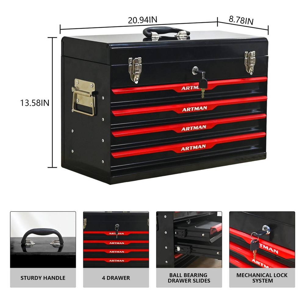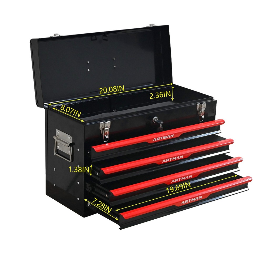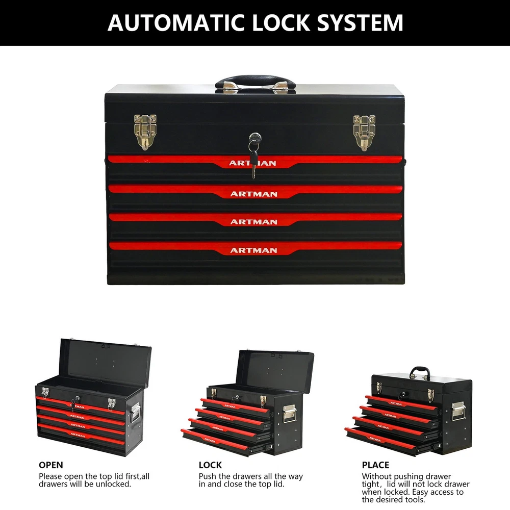 Home Shipping Return Policy About Us Contact Us Feedback Tip: The drawers unlocks only when the top cover is opened Material: Iron Steel Overall Size: W20.9" x D8.8" x H13.6" Net Weight: 23 lb Features: 【SMART LOCKING SYSTEM】 The tool box drawers automatically unlock only when the top cover is opened, providing secure and convenient access to your tools while keeping them safely stored. 【SMOOTH & EFFORTLESS OPERATION】 The metal tool box is equipped with high-quality ball bearing slide rails, the drawers glide open smoothly, allowing easy organization and quick access to tools like screwdrivers and wrenches. 【AMPLE & ORGANIZED STORAGE】 The portable tool box with drawers features a top tray and four spacious drawers to store various tools and supplies, reducing clutter and maintaining a tidy workspace. 【DURABLE & RUST-RESISTANT CONSTRUCTION】 The steel tool chest cabinet is made of sturdy alloy steel with a black powder-coated finish, this toolbox offers long-lasting durability, an elegant look, and reliable protection against rust. 【VERSATILE & PORTABLE DESIGN】 The tool box organizer is ideal for professionals, DIY enthusiasts, or office use, it includes a comfortable carry handle for easy transportation and serves as a perfect gift for mechanics, fathers, and husbands. Parcel Included: 1 Set of 20" Portable Steel Tool Chest Cabinet Payment Delivery details Terms of sales About us Contact us Payment Thank you for buying, and any payment Ebay accept is OK. Delivery details Usually your parcel or parcels will be handled and sent out in 1 working day. Usually you will receive your parcel or parcels in 2~5 working days, depends on the courier and parcel size, sometimes large parcel is slower. In case there is any problem about tracking or delivery, please feel free to contact us, we will contact courier to resolve, and no matter what, we will resolve for you. Terms of sales Any message from you will be replied in 24 Hours. Any problem will be resolved or offered solutions in 24 Hours. Please kindly do not open any case before contacting us, I promise you that any question or problem will be replied or resolved much faster if you contact us directly. We are all nice and honest people, in case anyone don't reply you in polite manner, or anyone don't resolve your problem in good way, send a message with a title Your manager, then I will take care your problem by myself. Thank you very much, and I am the company owner, Jess Wang. About us A experienced team to service USA people and market, we always be available to our customers, we don't let anyone wait longer than 24 Hours, please feel free to contact us at any time. Contact us Free Return for any problem even it is just a slight problem when you want to return. Please kindly contact us before opening any case. When you want to return just because you buy wrong or just don't like it or just don't want it, also, just contact us, we will assist you as always. Have a lovely day, thank you for visiting.