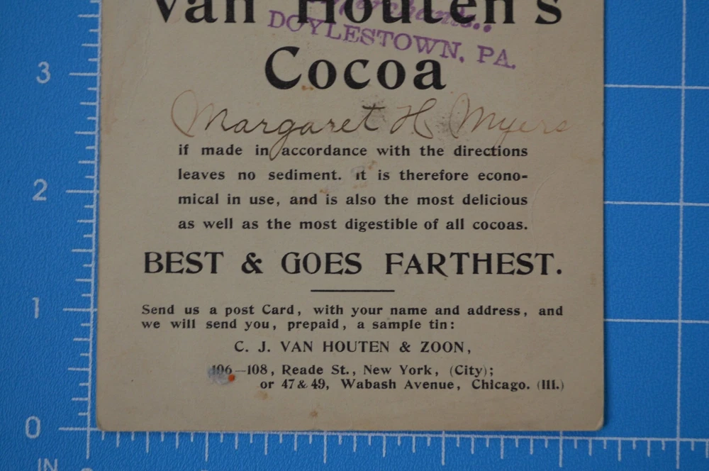 Description: A.S. Hellyer's Sons Doylestown Bucks County PA Trade Card for Van Houten's Cocoa. Old, but undated. Questions and offers welcome. Please review entire listing (including condition, title, pictures, description, and terms) before committing to purchase this listing. Before agreeing to purchase this listing, make your own determination on condition of the item(s) being offered in this listing. Pictures are part of the description and are provided to help illustrate condition. Since descriptions and opinions of condition can vary, seller provides prospective buyers with the ability to request more information and additional pictures before the close of this listing. When in doubt, please contact Taggart Neveling Books Ephemera, LLC "the seller" through eBay before you bid or agree to purchase this listing. This helps ensure a smooth transaction, one where Taggart Neveling Books Ephemera, LLC gets a sale and the buyer gets the item(s) they want to purchase. Condition & Disclosure of All Faults: All items appearing in this listing are pre-owned and are sold "AS-IS" and "WITH ALL FAULTS." No warranties, express or implied, are made in connection with this listing. Additionally, all other warranties not specifically listed above, are also disclaimed. Since the seller, Taggart Neveling Books Ephemera, LLC, does not provide any warranties with this listing, to the fullest extent allowed by law no sale shall be deemed invalid. A written description and uploaded pictures are offered to help provide a general idea of condition. Pictures are part of the description, but may not show every defect or flaw of an item or collection of items. The written description offered in this listing may not state every single defect or flaw in condition associated with item or items offered in this listing. However, Taggart Neveling Books Ephemera, LLC "the seller" offers potential buyers the ability to submit questions before agreeing to purchase this listing. Buyer agrees that a failure to exercise this option is not sufficient cause to initiate a return. Since Taggart Neveling Books Ephemera, LLC offers potential buyers the ability to submit questions before agreeing to purchase this listing, by bidding or agreeing to purchase this listing, buyer agrees seller has provided sufficient legal disclosure of all defects and faults, even if such defects and faults are not specifically identified in the written description or shown in the uploaded images. All statements and descriptions about age, authenticity, condition, fitness for a particular purpose, or origin of items offered in this listing, as well as those made in response to questions about this listing, reflect the opinion of the seller and are NOT offered as statements of fact. By bidding or agreeing to purchase this listing, the buyer agrees that to the fullest extent allowed by applicable law, Taggart Neveling Books Ephemera, LLC "the seller" will not be liable for any defect, error, or omission in this listing. By bidding or agreeing to purchase this listing buyer agrees to have performed all due diligence beforehand. By bidding or agreeing to purchase this listing buyer acknowledges the fact that some or all of the items offered in this listing may require cleaning, conservation, or repair. By bidding or agreeing to purchase this listing, buyer agrees ALL SALES ARE FINAL. NO REFUNDS. NO PARTIAL REFUNDS. NO RETURNS. NO EXCHANGES. Digital Photos and on Screen Viewing: Cameras and computers sometimes display colors differently. Colors, when viewed on a computer screen, can be lighter or darker than the actual item(s) that is being photographed. Please keep this in mind when you place your bid. Please also note: No display props or materials (tape measures, stands, or other items that may be used to help display a listing) are included. Taggart Neveling Books Ephemera, LLC welcomes questions, but asks all potential buyers to submit questions at least one day before the close of this listing. This helps ensure there will be enough time to respond to questions before the close of the listing. Payment Policy: Payment is due within two days of the close of a listing. If a listing remains unpaid for three or more days the issue will be reported to eBay. Failure to pay for an item in a timely fashion may result in a buyer being blocked from both current and future listings offered under this user ID. Sales Tax, Use Tax, Other Taxes: Since tax laws vary by state, you may be responsible for remitting sales or use tax to the appropriate state agency. The bidder, by bidding, agrees that if any sales or use tax (or any other tax) is due on the item(s) purchased, it is to be paid and remitted to the appropriate agency by the buyer and not the seller. Please note that eBay has largely automated this process. However, if there is any error in eBay's collection or the calculation of tax due, the buyer agrees, to the fullest extent allowed by law, to pay the correct amount to the appropriate agency and to not hold the seller responsible for covering any additional amount of tax due. Shipping Policy: Shipping Cost for this listing (Within Continental US): Item will ship for $4.95, with tracking, to continental US. Please note: No in-person pickups or deliveries are offered with this listing. Delivery for this listing will only be made via USPS mail. In listings without free shipping offered, total shipping cost includes all aspects of shipping, such as packing materials, time to pack the listing(s), time and expense incurred to get the listing(s) to the post office, and lastly postage. Postage is just one aspect of shipping cost. Please keep this in mind if you happen to see an instance where the shipping cost charged was higher than the postage cost. Time to Ship: All orders will ship within five business days. This means your order will ship, once it is paid for, within five business days. Additionally, orders will be tracked and tracking information will be 