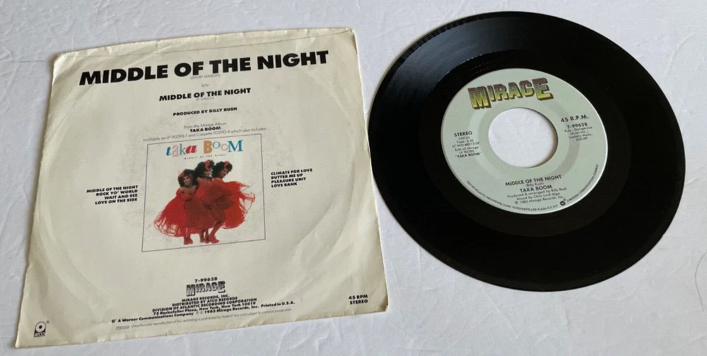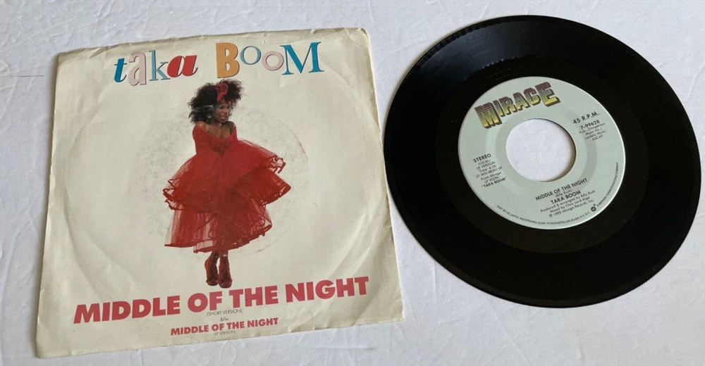 ************ NOTE: Will Combine shipping on items that close the same day ************* Combined shipping USA .00 cents extra postage for each additional, International ships via ebay GLOBAL service, please wait for the invoice on auctions--- or if multi purchases using B.I.N. ADD ITEMS TO SHOPPING CART thanks NOTE: this is not a CD, ---for your consideration AS185 45RPM w/ PicSlv Taka Boom Middle of the night short version, B SIDE same song LP version Mirage 99628 Cover Good has ring wear / stains , upper edge wear, scuffs, corner dings, crinkling , no splits —- record VG+ some light cosmetic marks ,labels ok MY Grading Guarantee---Money back + postage we grade our records visually, but any bad spots are played to check for skips, clicks etc., we also check for bad warps. Thanks For Looking Ship every day, except for Saturdays, Sundays, and postal holidays.