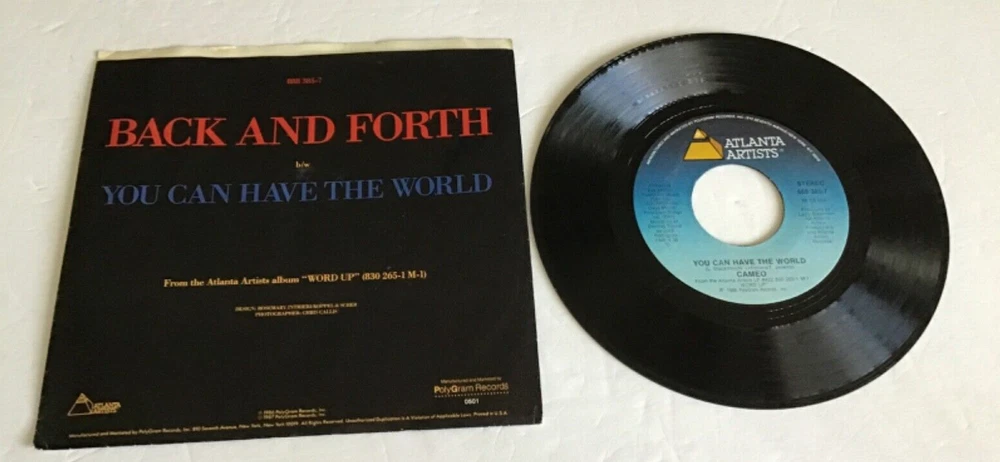 ************ NOTE: Will Combine shipping on items that close the same day ************* Combined shipping USA .00 cents extra postage for each additional, International ships via ebay GLOBAL service, please wait for the invoice on auctions--- or if multi purchases using B.I.N. ADD ITEMS TO SHOPPING CART thanks NOTE: this is not a CD, ---for your consideration AS190 45RPM wPicSlv Cameo Back and forth, you can have the world Atlanta Artists 888 385-7 yr 1986 Sleeve condition good has ring wear, upper edge wear corner dings, crinkling NO splits —- Record EXC to NM light cosmetic marks NAP clean, labels ok MY Grading Guarantee---Money back + postage we grade our records visually, but any bad spots are played to check for skips, clicks etc., we also check for bad warps. Thanks For Looking Ship every day, except for Saturdays, Sundays, and postal holidays.