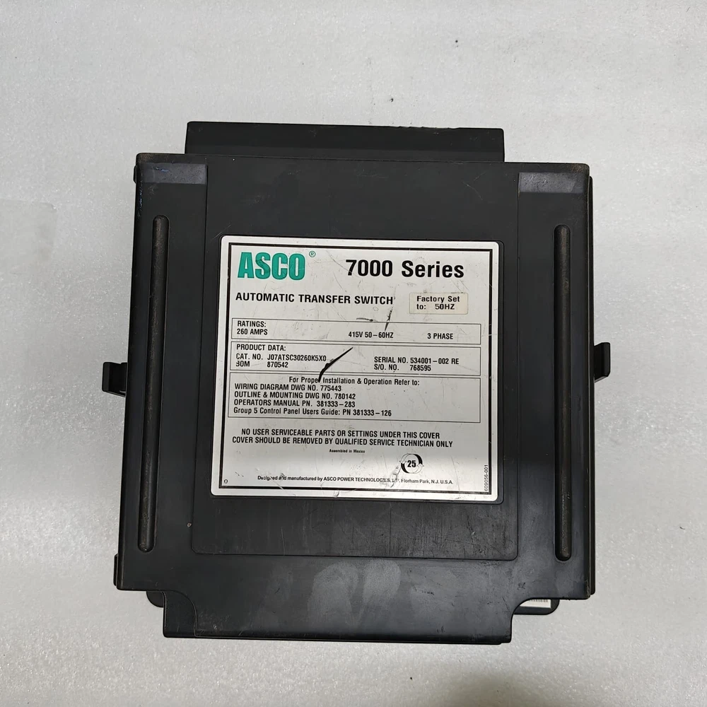 ASCO 7000 Series Automatic Transfer Switch Controller 260AMPS 3Phase 7000 Series Automatic Transfer Switch Controller 260AMPS 3Phase J07ATSC30260K5X0 TAXES & IMPORT DUTIES Custom Duties And Taxes Are Not Included In The Item Price. Customer Has To Pay Separately. PAYMENT: eBay payment policy (Payoneer). DELIVERY TIME: Ship within Maximum 2 working Days By Express Economy Services. PACKING: Quality packing with Fragile mark on each box. Assured safe and undamaged delivery. Our first responsibility is to ensure that the item reaches the customer safely, so we pack it well. SHIPPING: Free Shipping on all products below FedEx Express, DHL Express, UPS Standard International Shipping. RETURN POLICY: Returns accepted within 30 days. Duty charges and Shipping charges will be borne/pay by the Buyer. Return/Replacement is not accepted in For Part items. About us: We are the Stockiest Supplier for Marine and Industrial Automation Equipment. We provide quality-tested products at the best prices with rapid delivery services. We assure you of the quality and best prices for all our products. Our scope of supply is: PLC (ABB | Siemens | Allen Bradley | Mitsubishi | Delta | Honeywell | Fanuc) HMI (ABB | Siemens | Allen Bradley | Mitsubishi | Delta ) PCB (ABB | Kongsberg | Emerson | Niigata | Westronics | Wartsila) Input & Output Modules for PLC Smoke Detector (Consilium | Salwico | Nohmi | Simplex | Autronica) Power Supply (Terasaki | Astron | Newmar | Omron | Weidmuller | Puls) Pressure Switch (Saginomiya | Norgren | Rexroth | Trafag | Danfoss | Square-D) Pressure Transmitter (Honeywell | Rosemount | Nagano Keiki | ABB | Danfoss) Sensors and Transducers (Honeywell | Stellar | Shinko | Celesco | Saacke) Turbochargers, Hydraulics Pumps Motors Etc Marine And Industrial Equipment. Thank you
