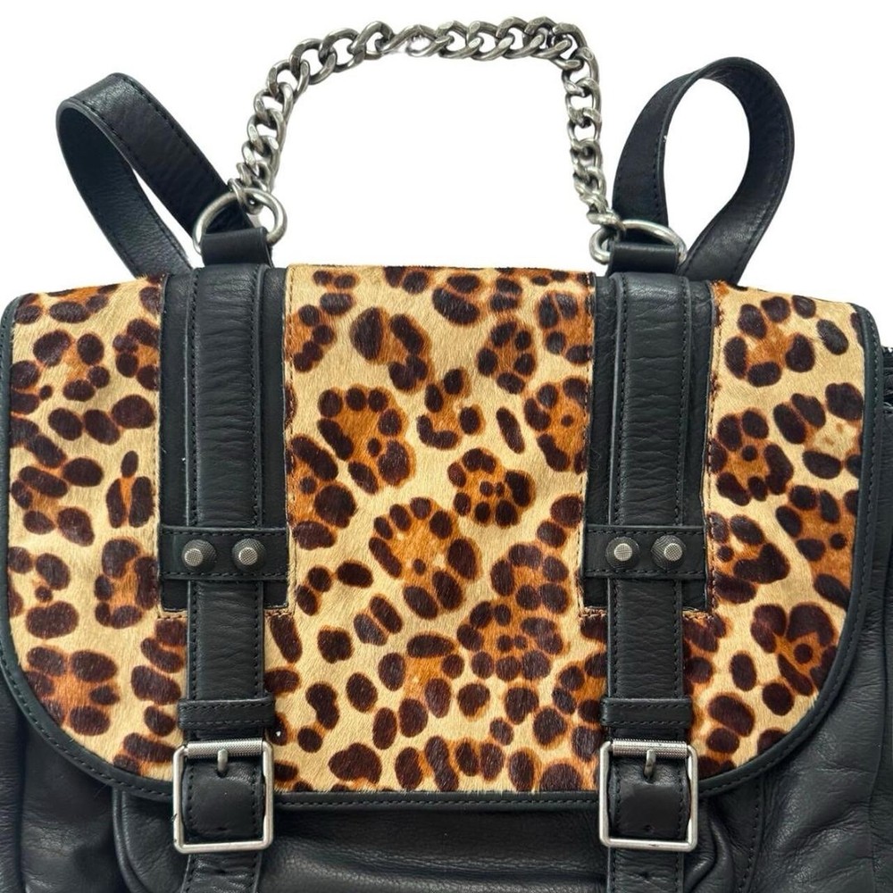 ASH Leather leopard calf hair backpack With Silver Chains And Hardware. Condition is very good but it is Pre-owned. There is one small spot on the back as pictured, but is otherwise in perfect condition. It is quite possibly the softest leather I’ve ever felt on a handbag.