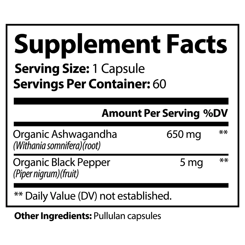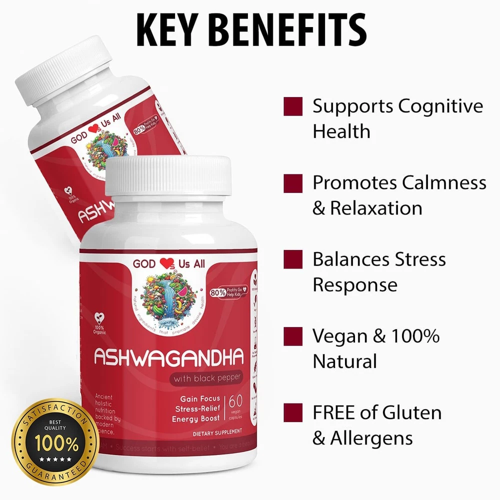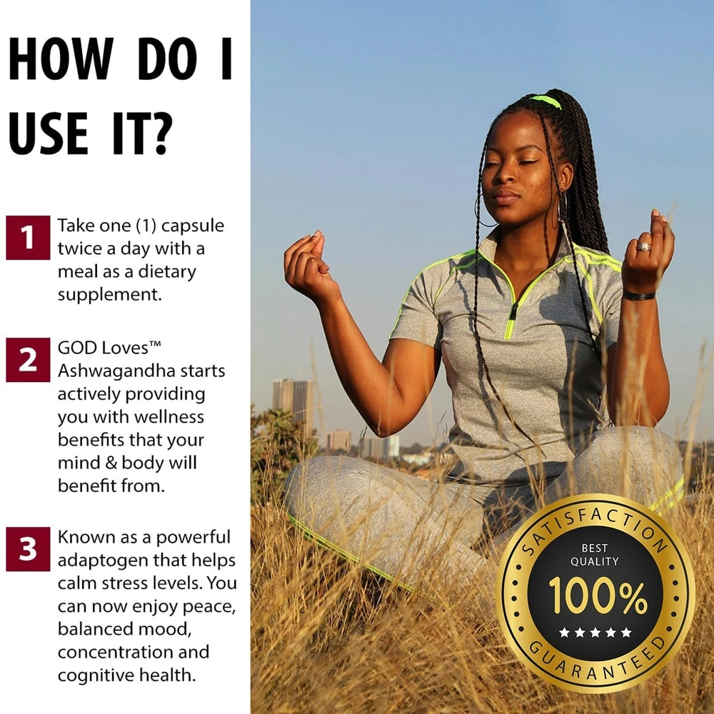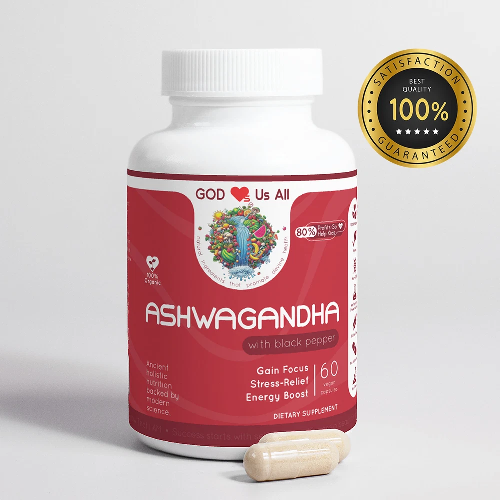 For More Info & 15% Discount Code Visit: godlovesusall.com Our GOD Loves™ ASHWAGANDHA is an ancient herb used in Ayurvedic medicine, India’s traditional healthcare system. Recently popularized worldwide, it’s most well-known as a powerful adaptogen that helps calm stress levels. Our ASHWAGANDHA contains Black Pepper Fruit and other potent natural chemicals that help to support overall health in the body. Ingredients: Organic Ashwagandha (Withania somnifera)(root), Organic Black Pepper (Piper nigrum)(fruit), pullulan capsules. Manufacturer Country : USA Amount : 60 caps Gross Weight: 0.25lb (113g) Suggested Use: Take one (1) capsule twice a day as a dietary supplement. For best results, take 20-30 min before a meal with an 8oz glass of water or as directed by your healthcare professional. Caution: Do not exceed recommended dose. Pregnant or nursing mothers, children under the age of 18, and individuals with a known medical condition should consult a physician before using this or any dietary supplement. Warning: This product is not intended to diagnose, treat, cure or prevent any disease. Keep out of reach of children. Do not use if the safety seal is damaged or missing. Store in a cool, dry place. *These statements have not been evaluated by the Food and Drug Administration. This product is not intended to diagnose, treat, cure or prevent any disease.