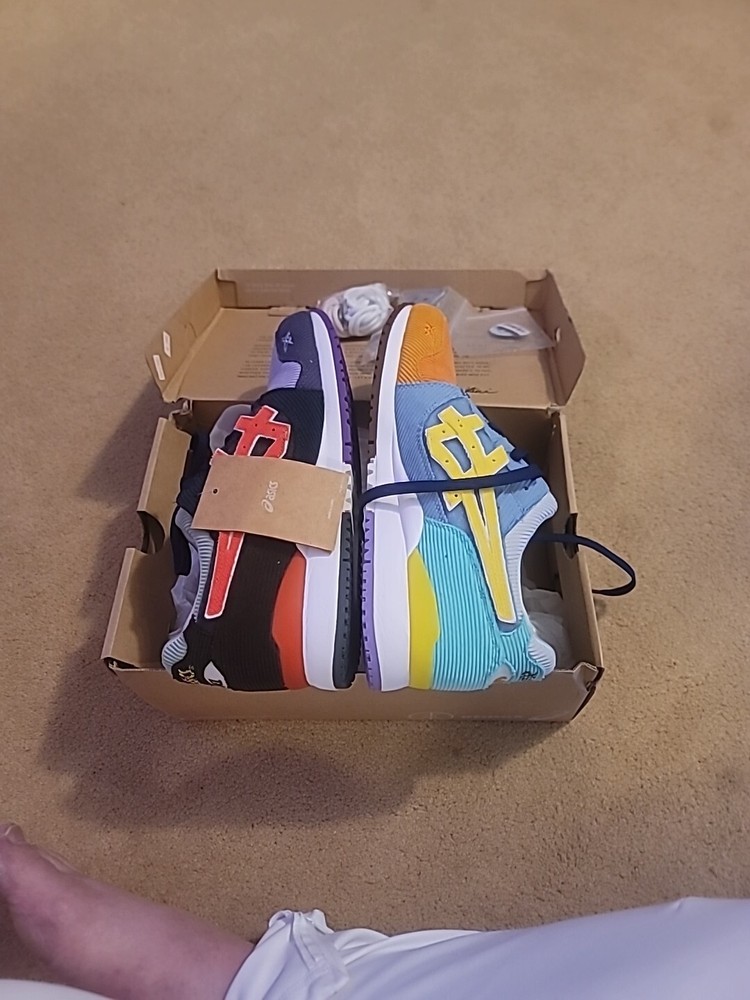 This limited edition ASICS GEL-Lyte III x Sean Wotherspoon x Atmos sneaker is a must-have for any collector or fashion-forward individual. The shoe features a colorful patchwork design, low top style, and standard shoe width. The upper material is made of corduroy and the lining material is fabric. The insole material is gel and the outsole material is rubber. The shoe is suitable for various occasions including activewear, casual workwear, and sports. It has a lace-up closure and is available in size 9 (US), 8 (UK), and 42.5 (EU). The shoe is part of the ASICS GEL product line and is perfect for activities such as running, gym & training, cycling, and hiking. Listed used but brand new never worn. Ebay authentication said the inside been worn but not the outside look over pictures. Box messed up. These are Brand new never worn but Ebay making us put used check the picture