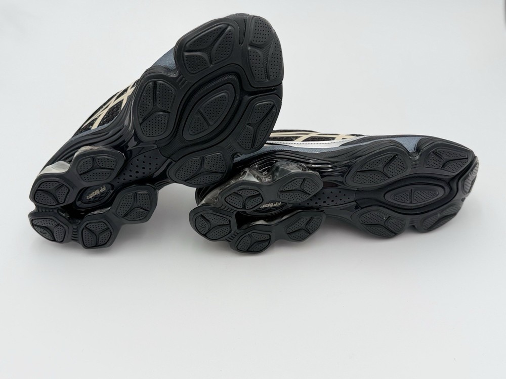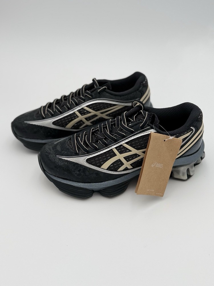 ASICS Gel-Kinetic running shoes in a sleek black and cream colorway built for cushioned comfort and standout style. Featuring visible GEL cushioning pods and breathable mesh uppers, these are perfect for running, training, or everyday streetwear. • ASICS athletic running shoes Women size not visible lace up style. • Mesh and synthetic upper with full length GEL cushioning system. • Black base with cream stripe accents and sculpted sole pods. • Lace up closure with padded collar and responsive midsole preowned condition. • Gel-kinetic model with performance outsole and traction tread.
