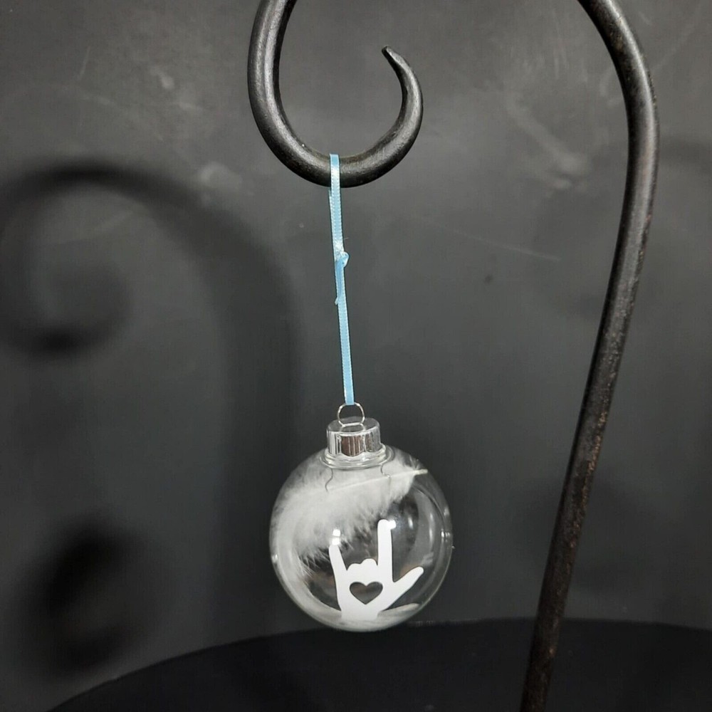 Clear glass ornament filled with a delicate white feather, featuring a white decal of the "I Love You" hand sign from American Sign Language (ASL), complete with a heart detail. This ornament is a unique and thoughtful piece, perfect for adding a personal touch to your holiday decor or gifting to someone special. It comes with a light blue ribbon for easy hanging. Type: Bauble Occasion: Christmas Color: Clear Material: Glass, Feather Character: None Shape: Circle Set Includes: Bauble Features: Hanging, Handmade Number of Items: 1 Keywords: ASL ornament, I love you sign, Christmas ornament, Holiday decoration, Feather ornament, Glass ornament, Hand sign ornament, Unique ornament, Gift idea, Holiday gift, Christmas decor, ASL gift, Sign language, Ily sign