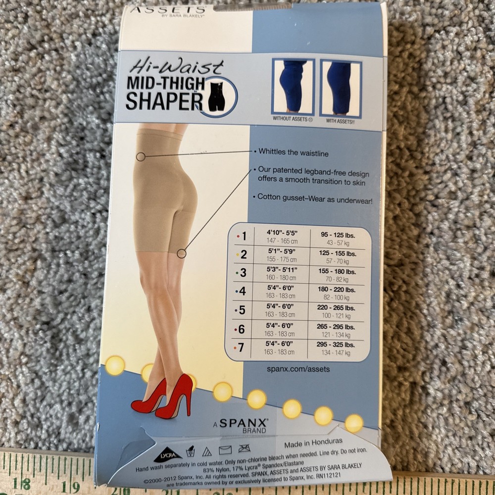 The ASSETS by Sara Blakely SPANX High-Waist Mid-Thigh Shaper in size 2 is a nude shapewear piece made from a blended fabric of nylon and spandex. This high-waisted shaper offers compression in the waist area, featuring a solid pattern and a stretchy, lightweight material that provides a slimming effect. Designed by Spanx, this shapewear is perfect for women looking for a comfortable and versatile option to smooth and shape their body. Made in Honduras, this shaper is a practical and stylish addition to any wardrobe. 3385