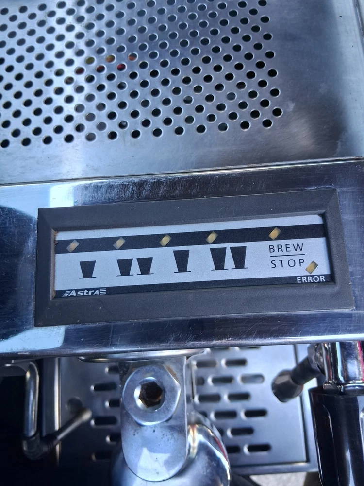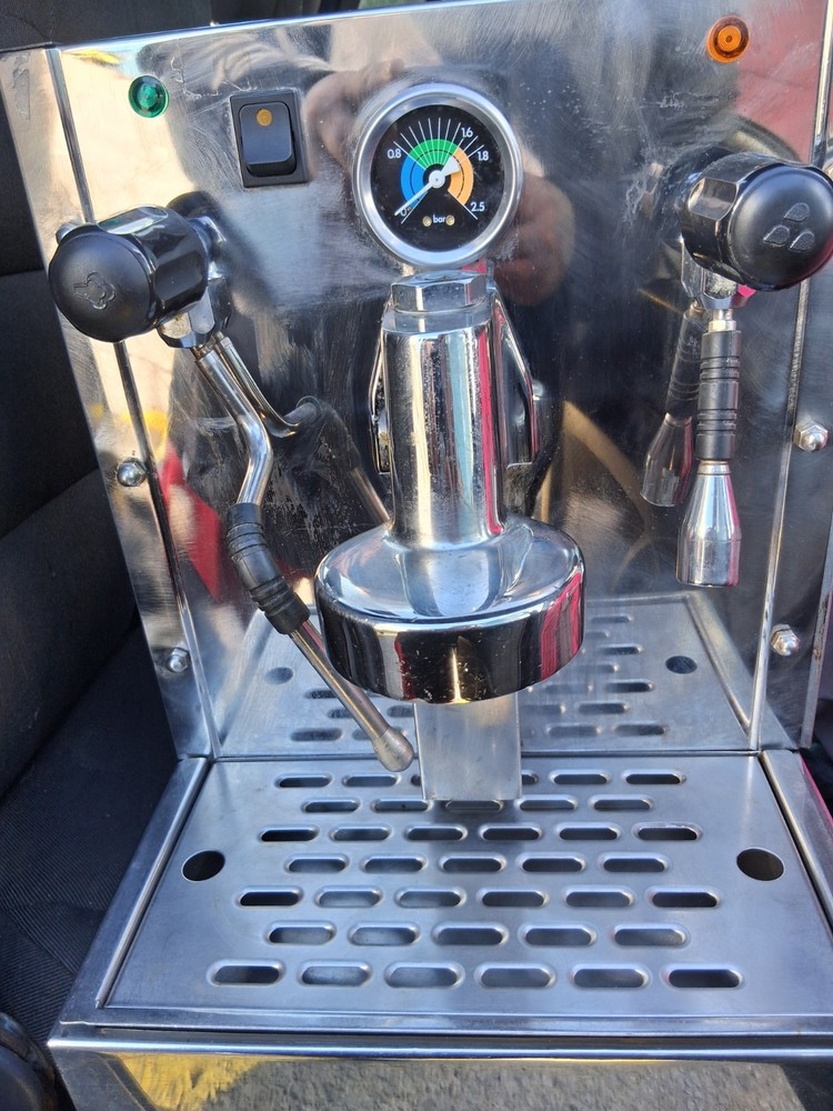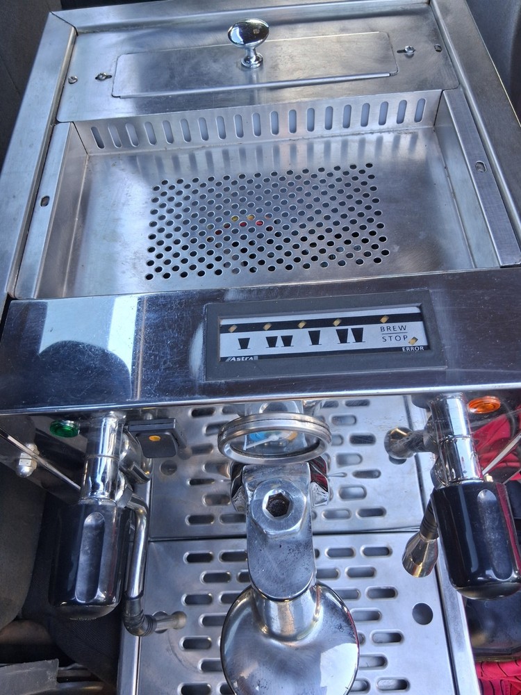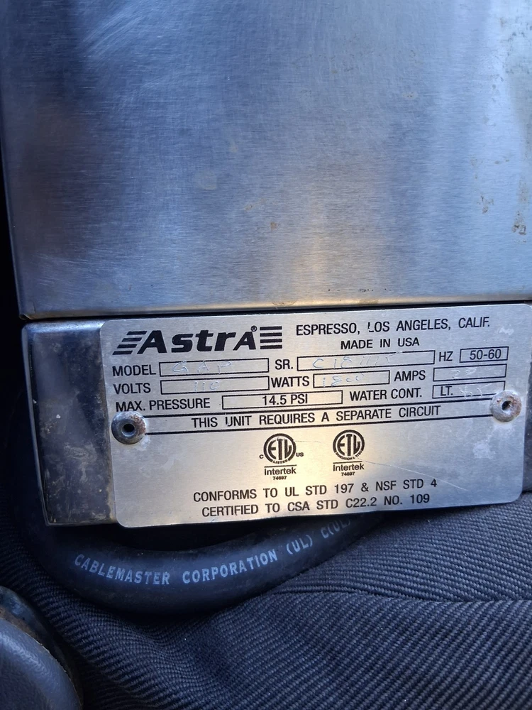 Control Panel: Analog Coffee Type: Ground Coffee Brand: Astra Features: Made in USA, Frother Type of Coffee Made: Espresso Item Width: 20 AMPS Model: MBLAC Item Depth: 50-60HZ Country of Origin: United States Voltage: 110V Type: Espresso Machine Components Included: Water Tank Bar Pressure: 14.5 PSI Power: 1800 W Finish: Shiny Material: Stainless Steel Power Source: Electrical Color: Black