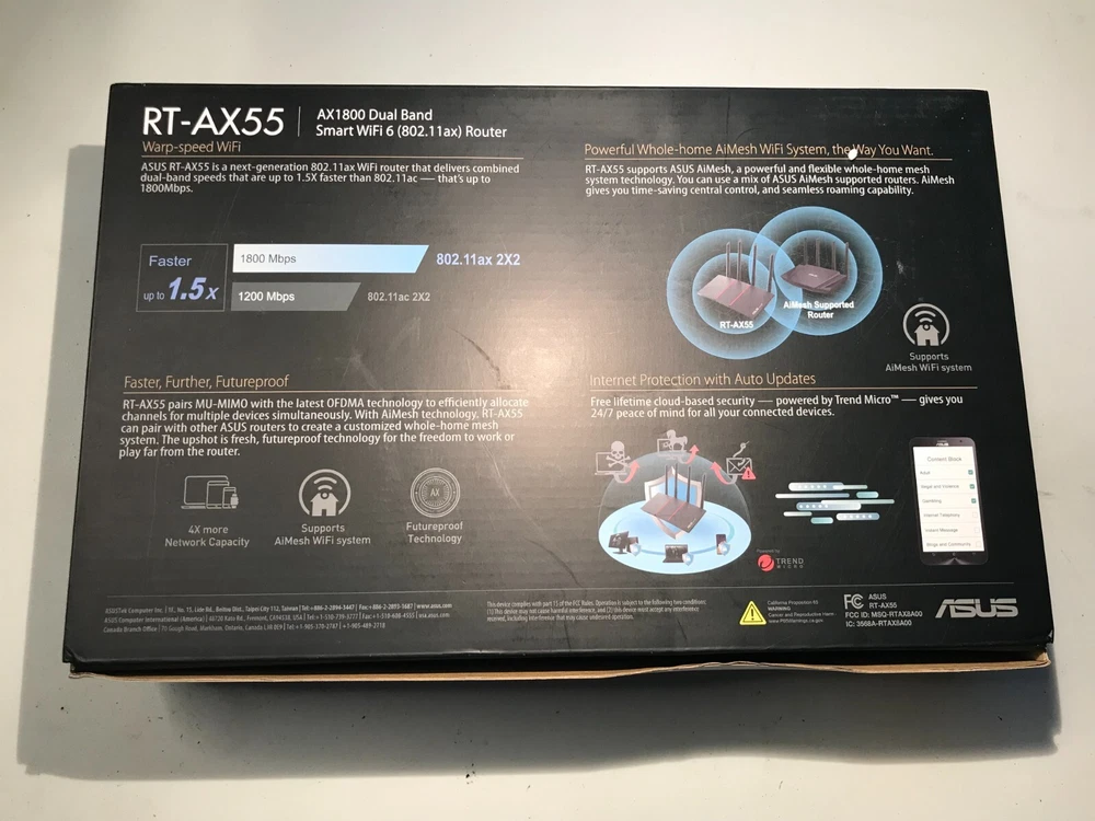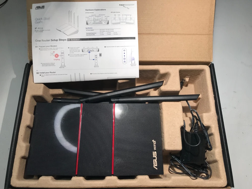New-open box Asus Rt-Ax55 Ax1800 Wi-fi 6 router. The box is opened however it is new and has never been plugged in. Please look at pictures for details on the technical aspects of the router. Payment due within 24 hours of purchase-will ship within 2 business days of receiving payment.