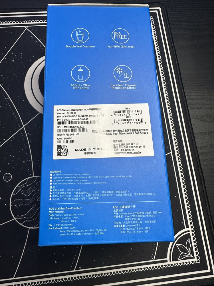 ROG Stanless Steel Tumbler features a double-walled vacuum insulated design to keep liquids warm for up to 6 hours or cold for up to 12 hours. It’s made of SUS 304 food-grade stainless steel and BPA-free Tritan plastic.