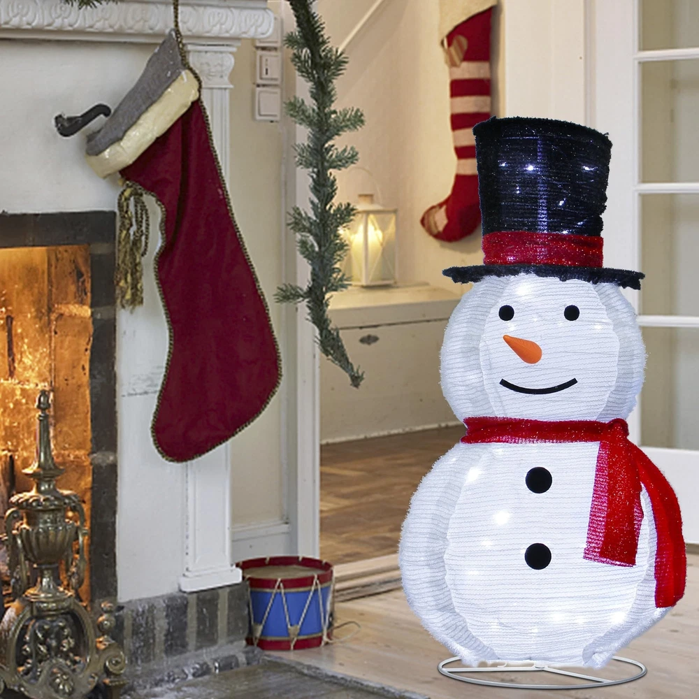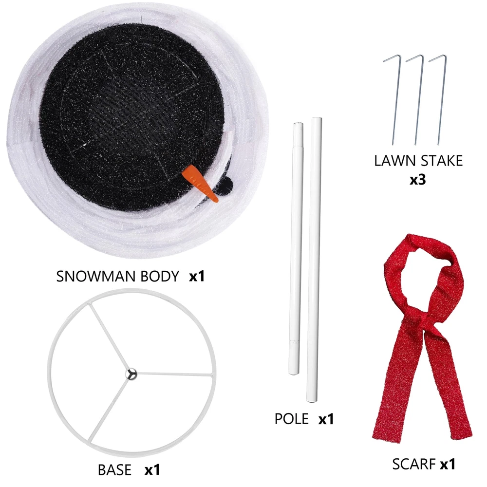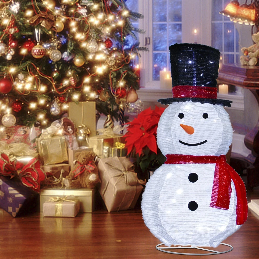 ⛄ PREMIUM QUALITY: This outdoor lighted snowman is made of a durable metal frame and covered in hand-sewn tinsel fabrics for a lovely look. ⛄ CUTE SNOWMAN: Our 3 foot light up snowman with a black top hat and drapes down a red scarf, carrot nose and black buttons, adorable design adds your Christmas and winter great fun, is the perfect Christmas decoration to greet family and this holiday season. ⛄ 60 PRE-LIT LED LIGHTS: This outdoor snowman decorations features 60 cool white LED lights, create a glowing nighttime display, plug in design for easy use, will brighten up your Christmas decor by creating an attractive focal point in your yard or porch. ⛄ EASY ASSEMBLE AND STORAGE: This snowman yard decoration with collapsible design for quick, easy set up and space saving storage, perfect for a small place, no tools or specialized skills are required, please refer to the instructions for detailed installation. ⛄ COLLAPSIBLE CHRISTMAS DECORATIONS: This Christmas Snowman come in a nice box that can be a Christmas gift for your family and friends, it can be used to decor your office, the living room, dining room or entryway. Great for Christmas Themed Party, Christmas Indoor and Outdoor Decorations, or Christmas yard Decoration!
